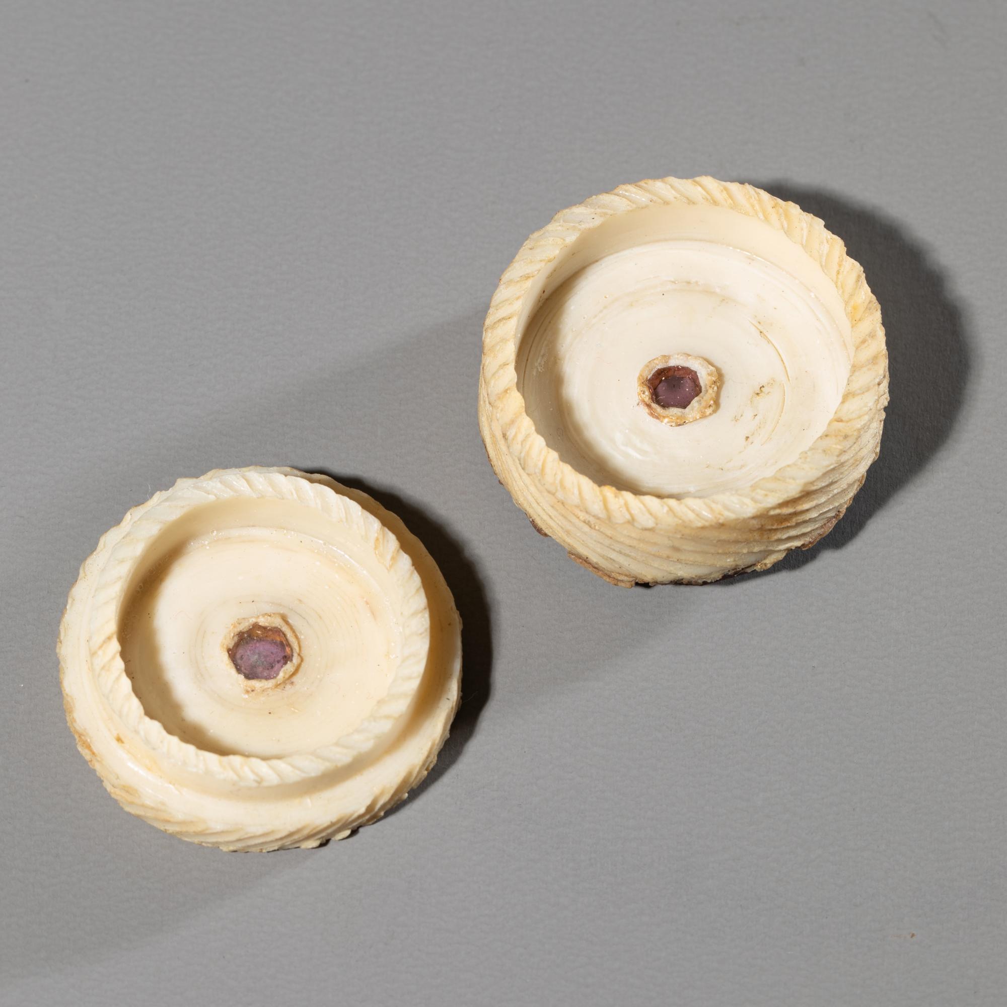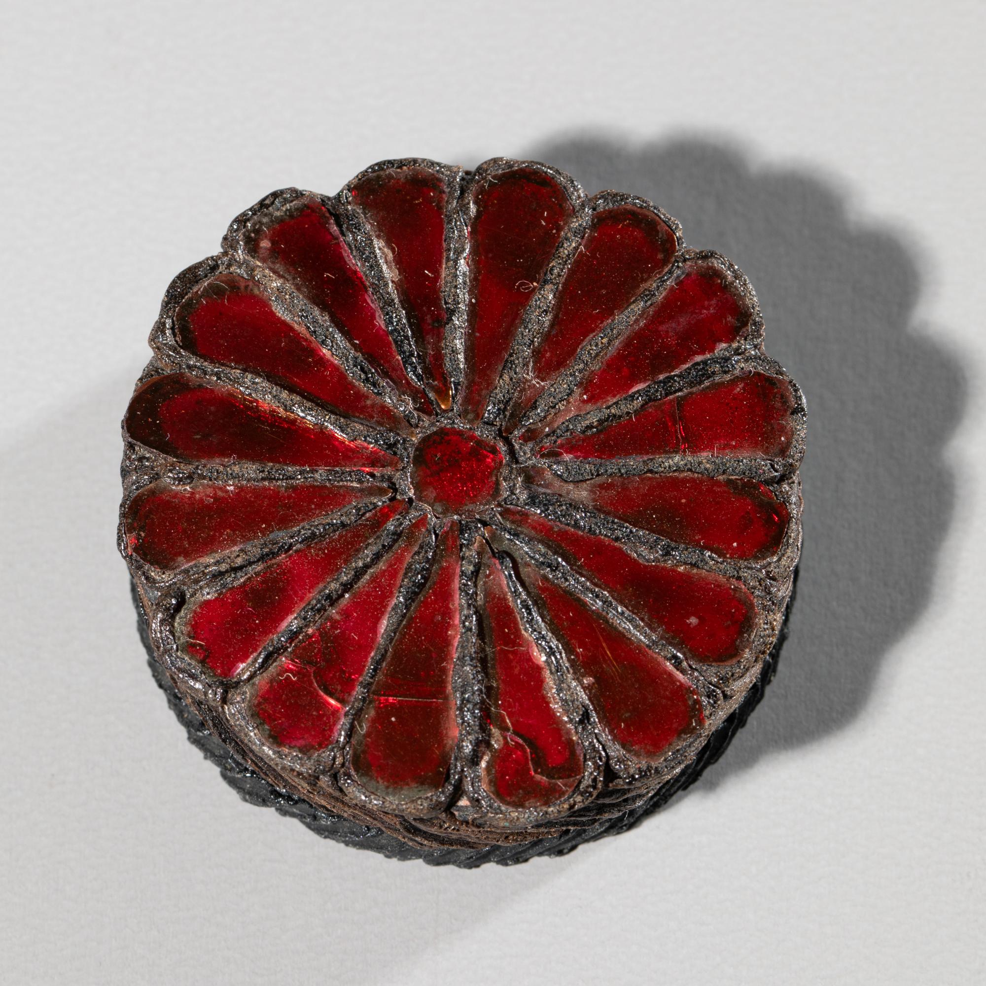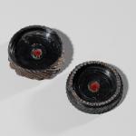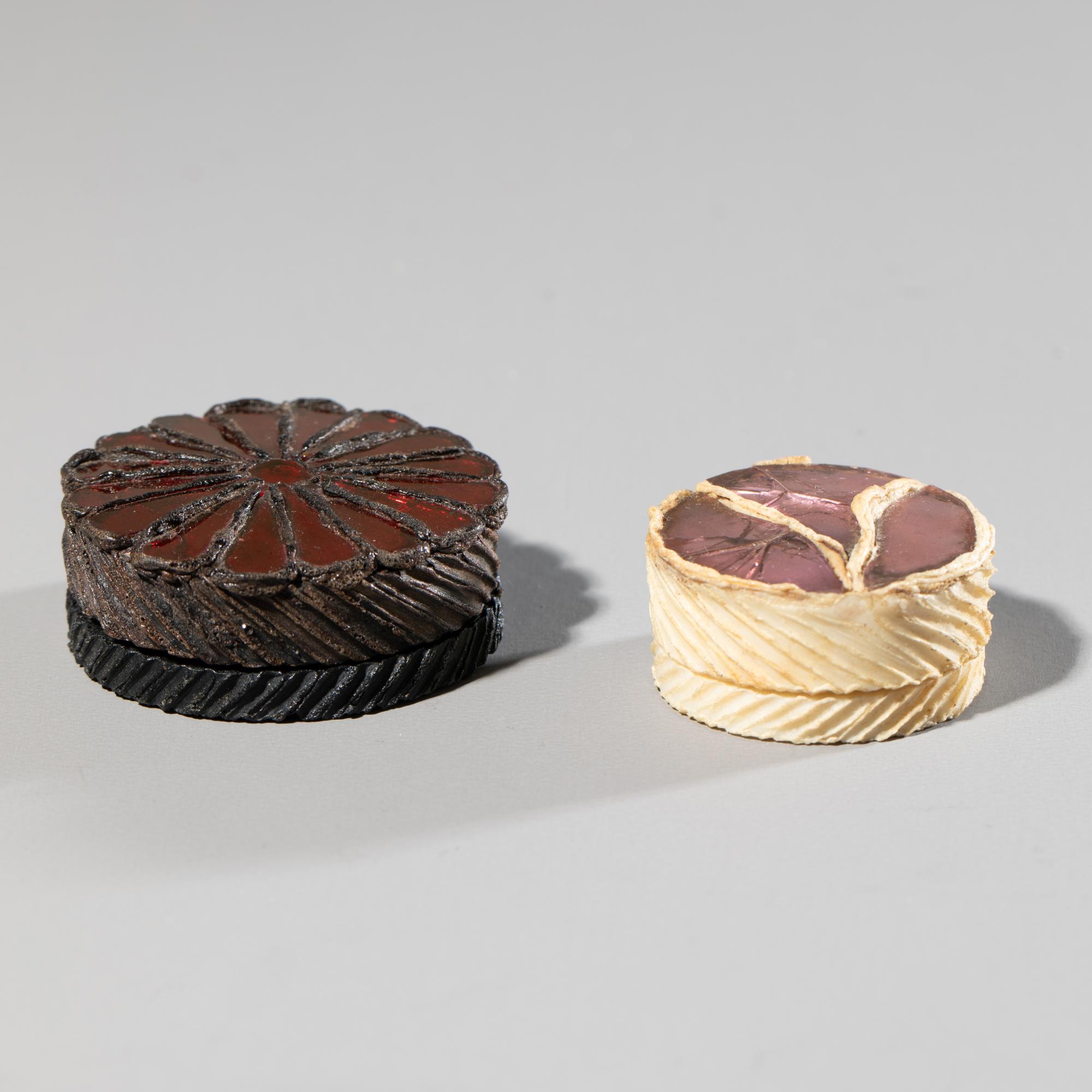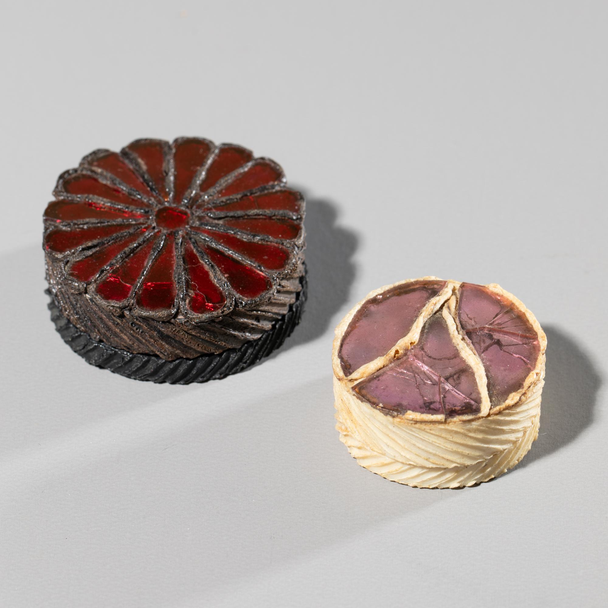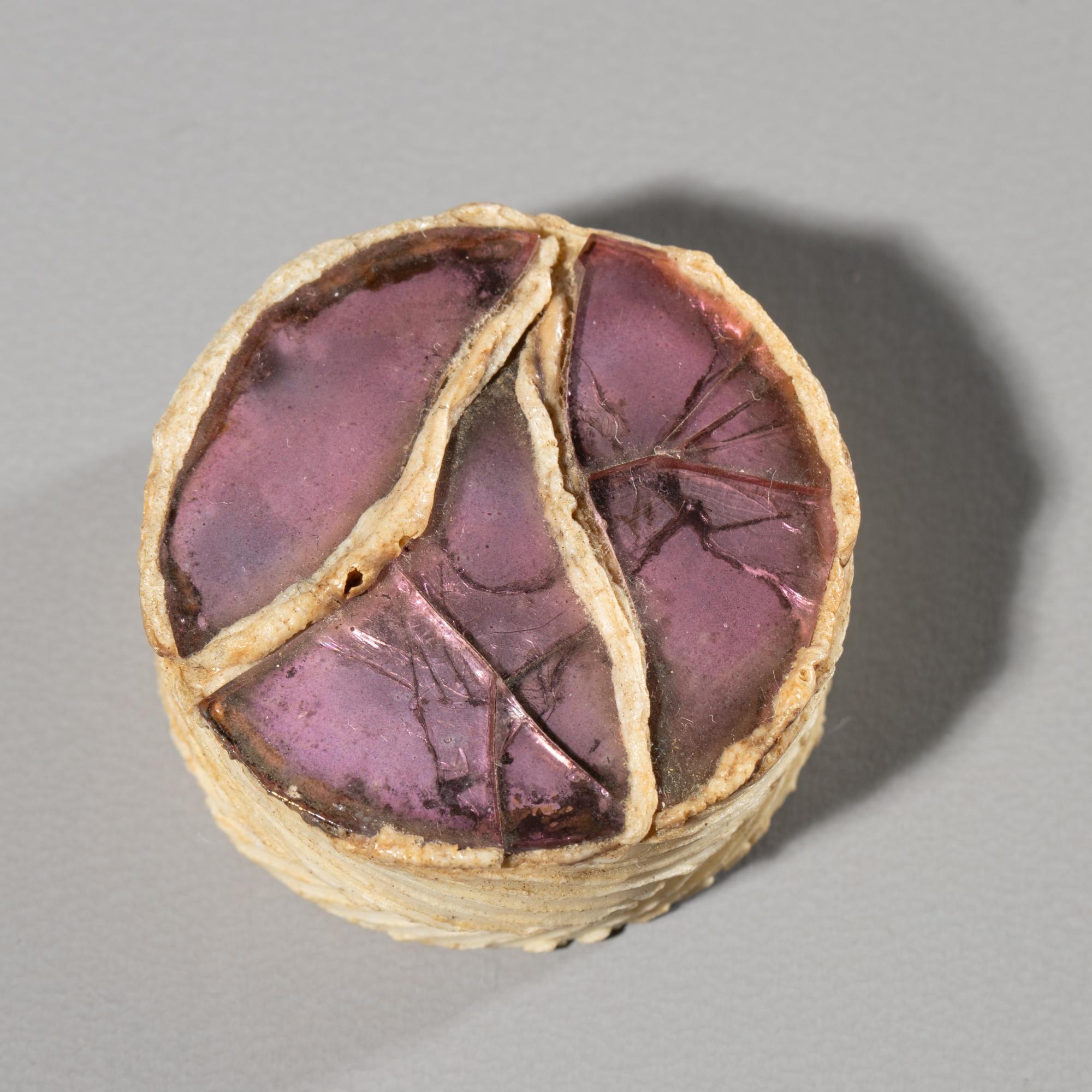 Gefärbtes Talosel (Kunstharz) mit roten und rosafarbenen Spiegelelementen. 1,8 x 4.5 cm / 1,7 x 3,5 cm.
