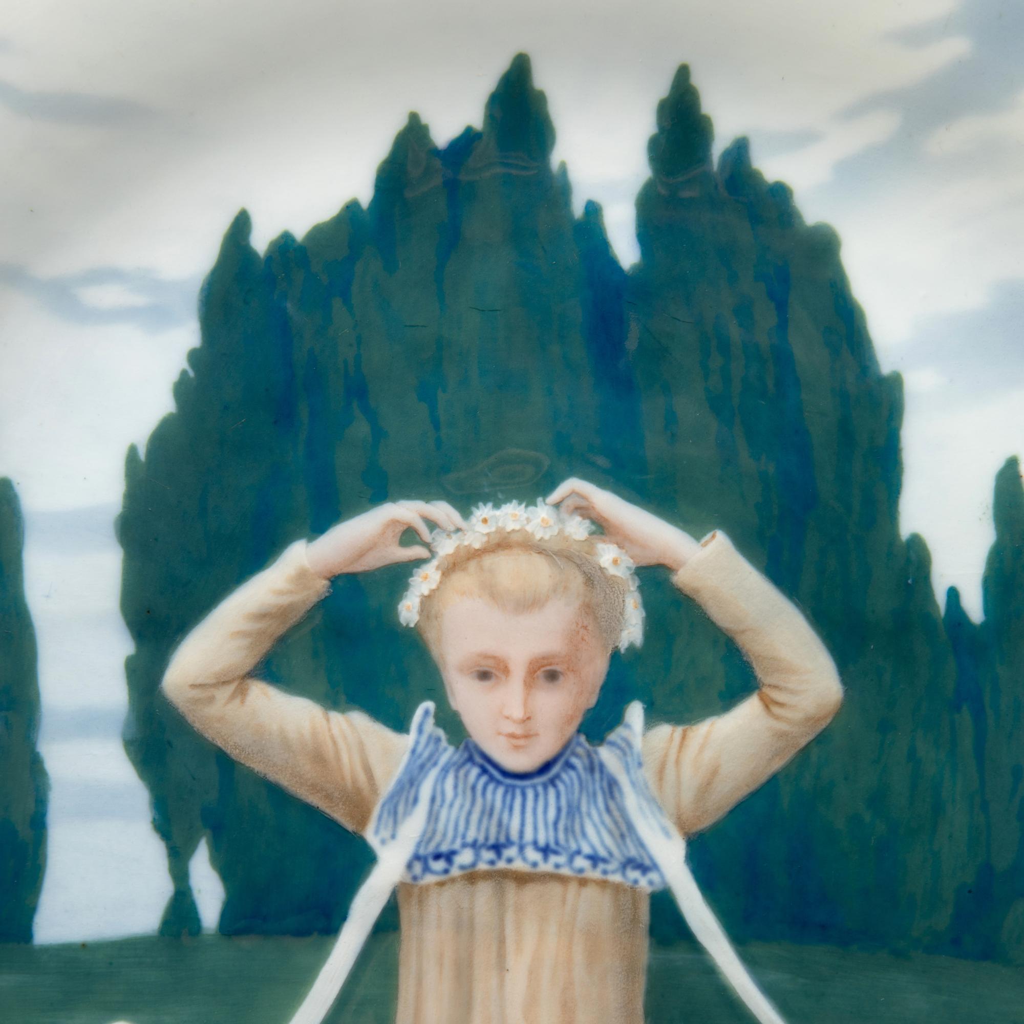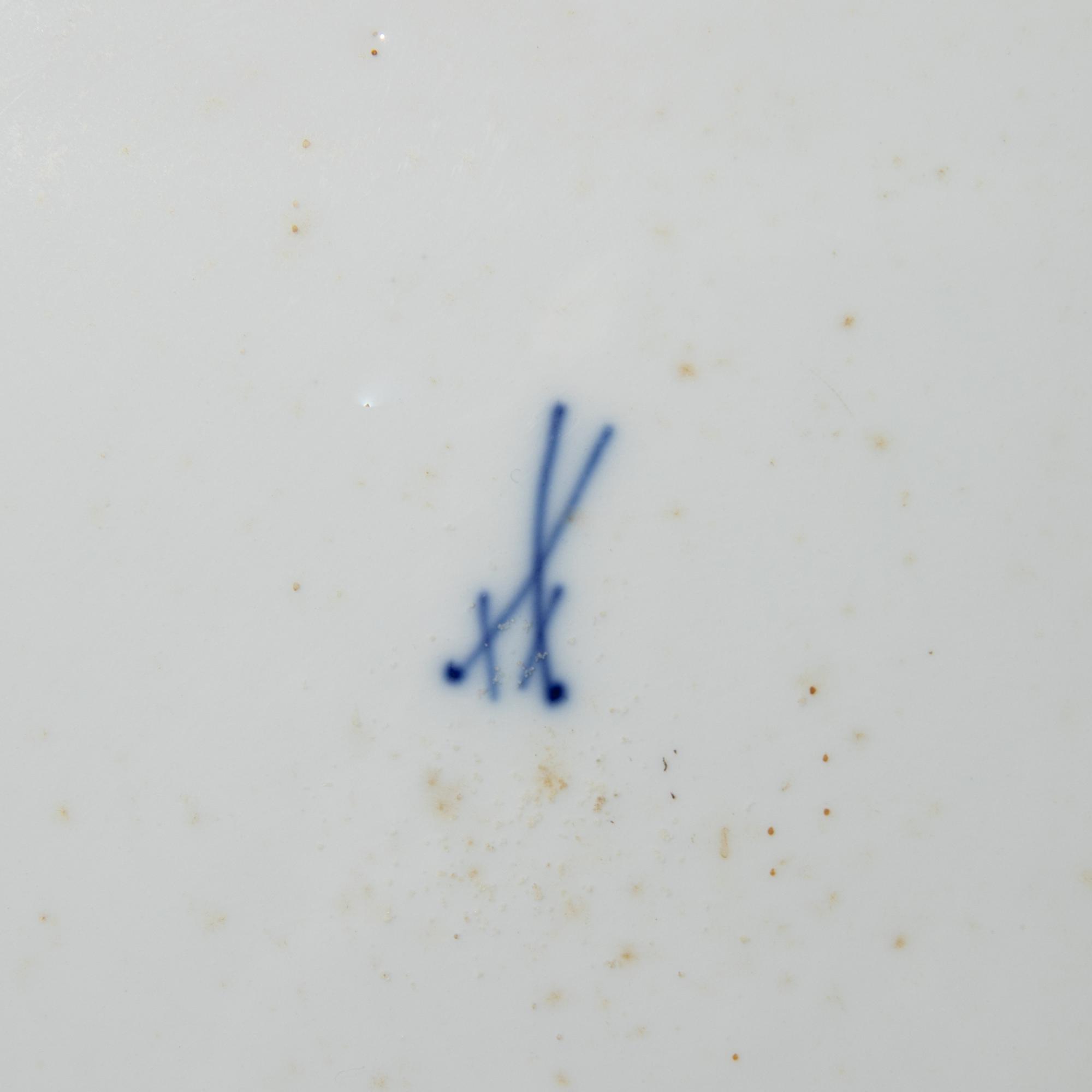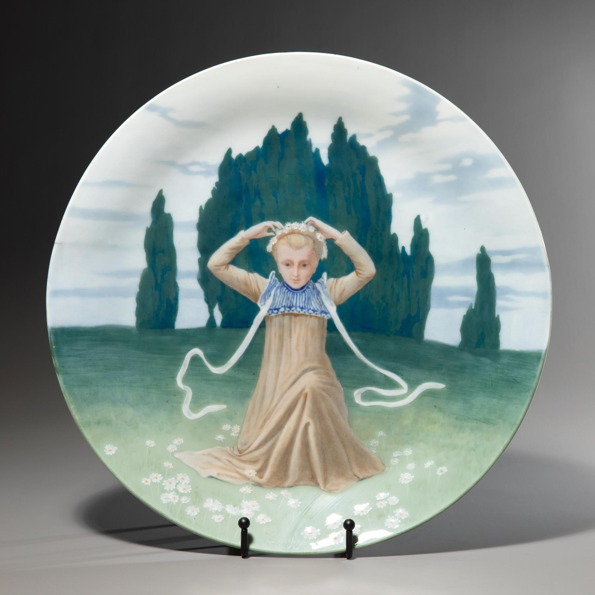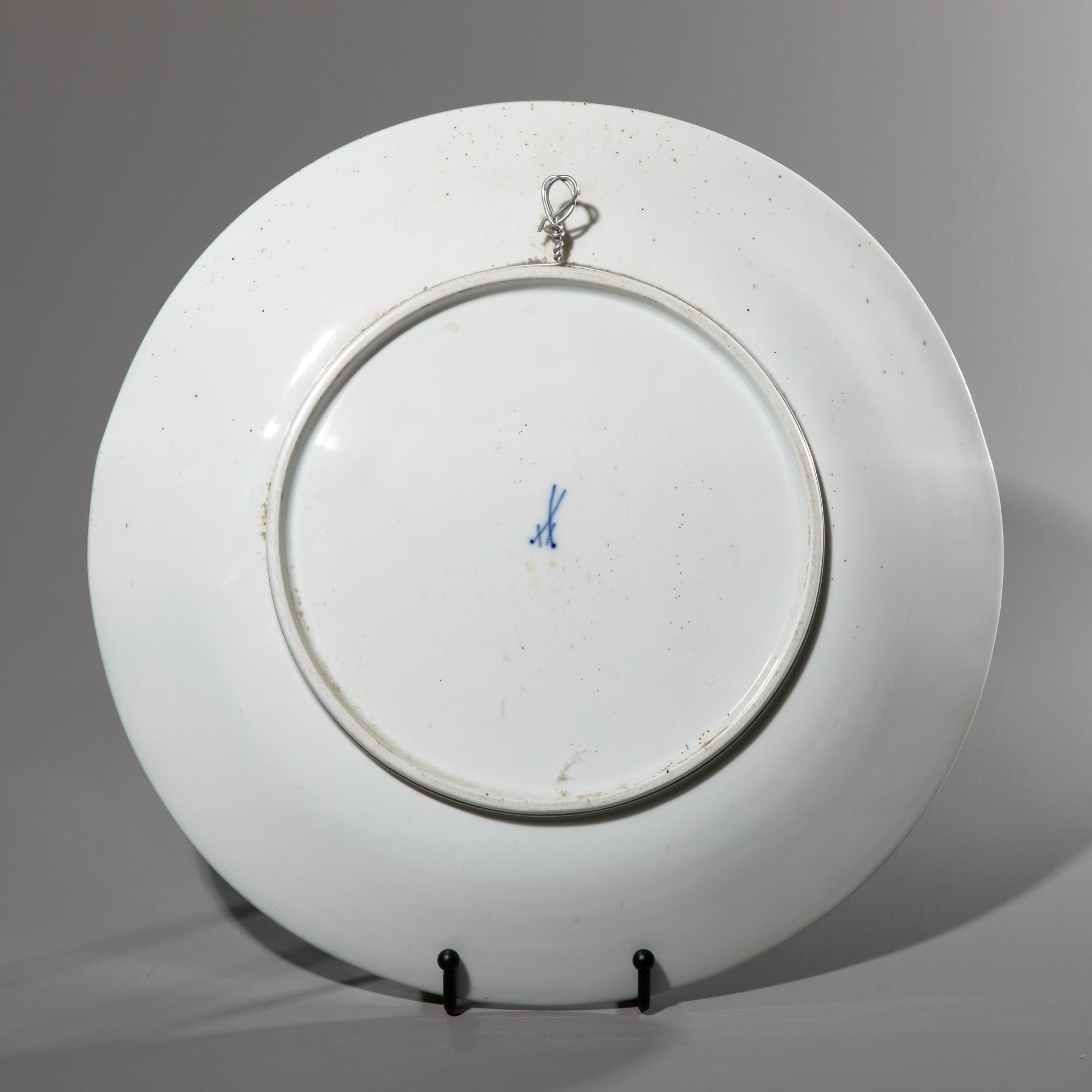Entwurf um 1900. Ausführung vor 1924. Porzellan, weiß, in Pastelltönen glasiert. D. 34 cm. Bezeichnet: Schwertermarke (blau, Untergasur); 13 (geprägt).