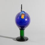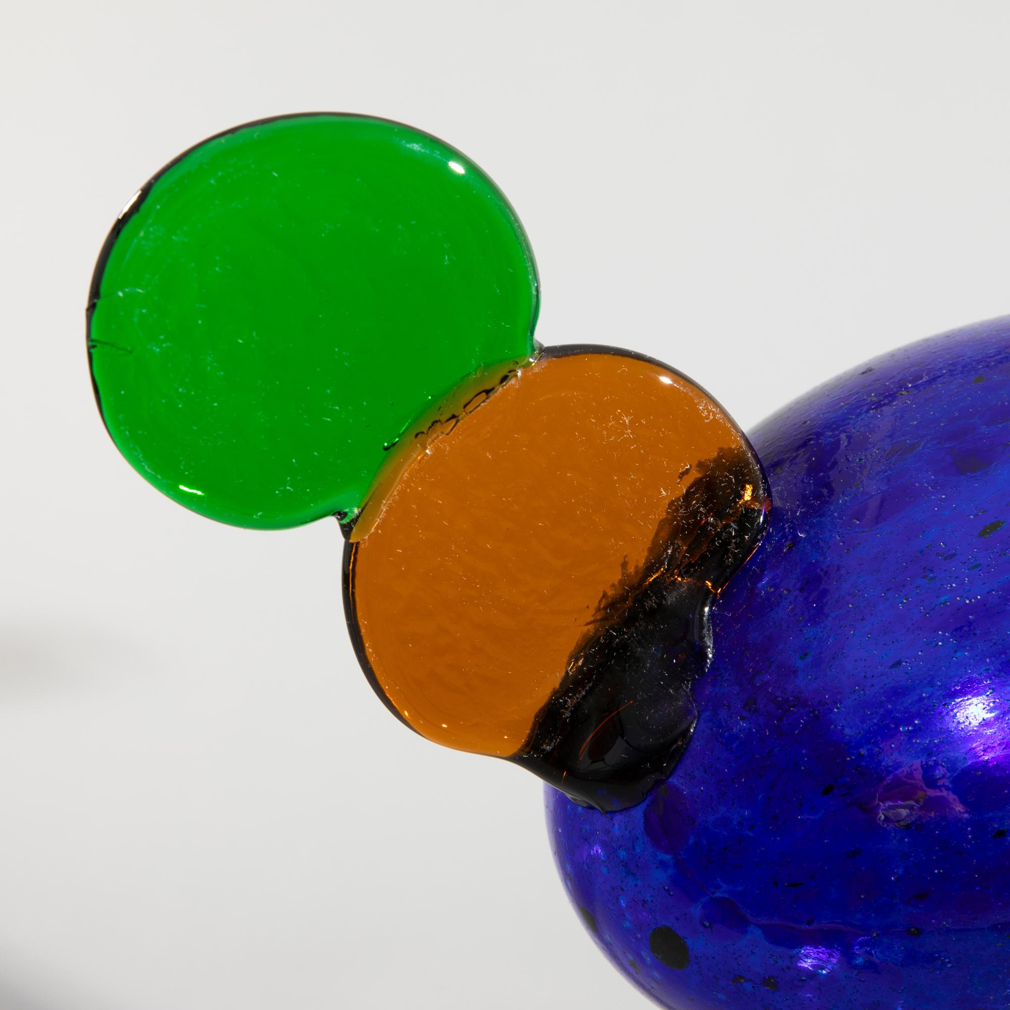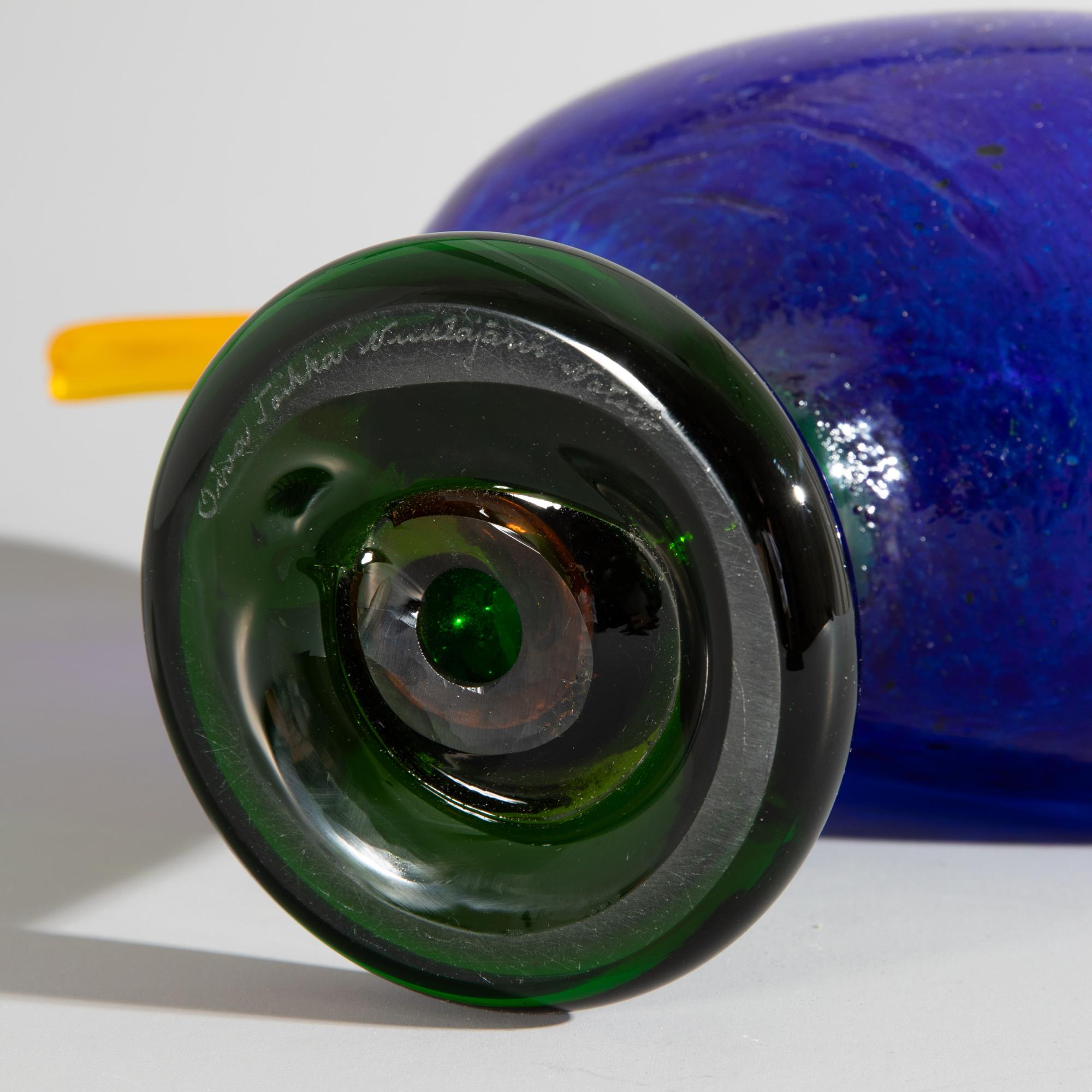 Ausführung Nuutajärvi, Notsjö für Iittala, Kalvola. Farbloses Glas, partiell grün und bernsteinfarben unterfangen sowie mit blauen Pulveraufschmelzungen. 27 x 46 x 13 cm. Unter dem Stand bezeichnet: Oiva Toikka Nuutajärvi Notsjö (graviert).