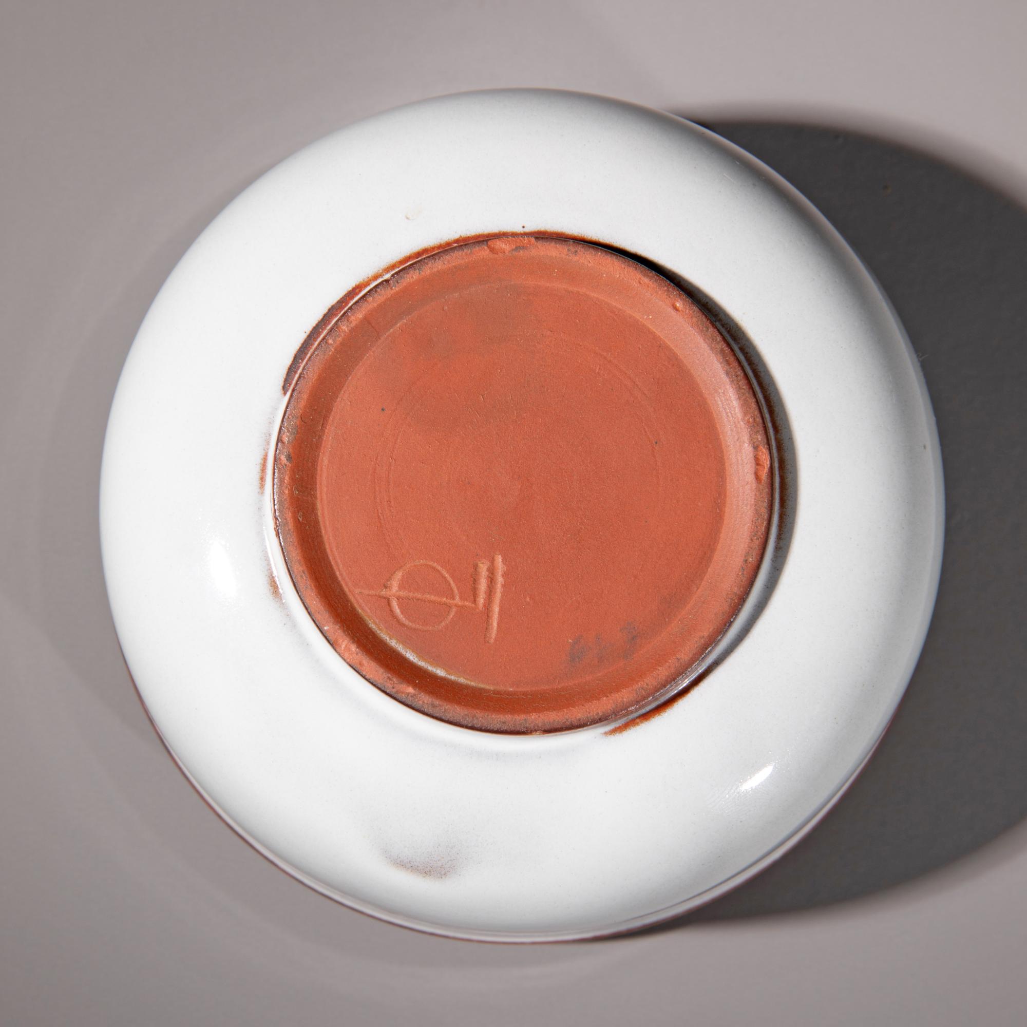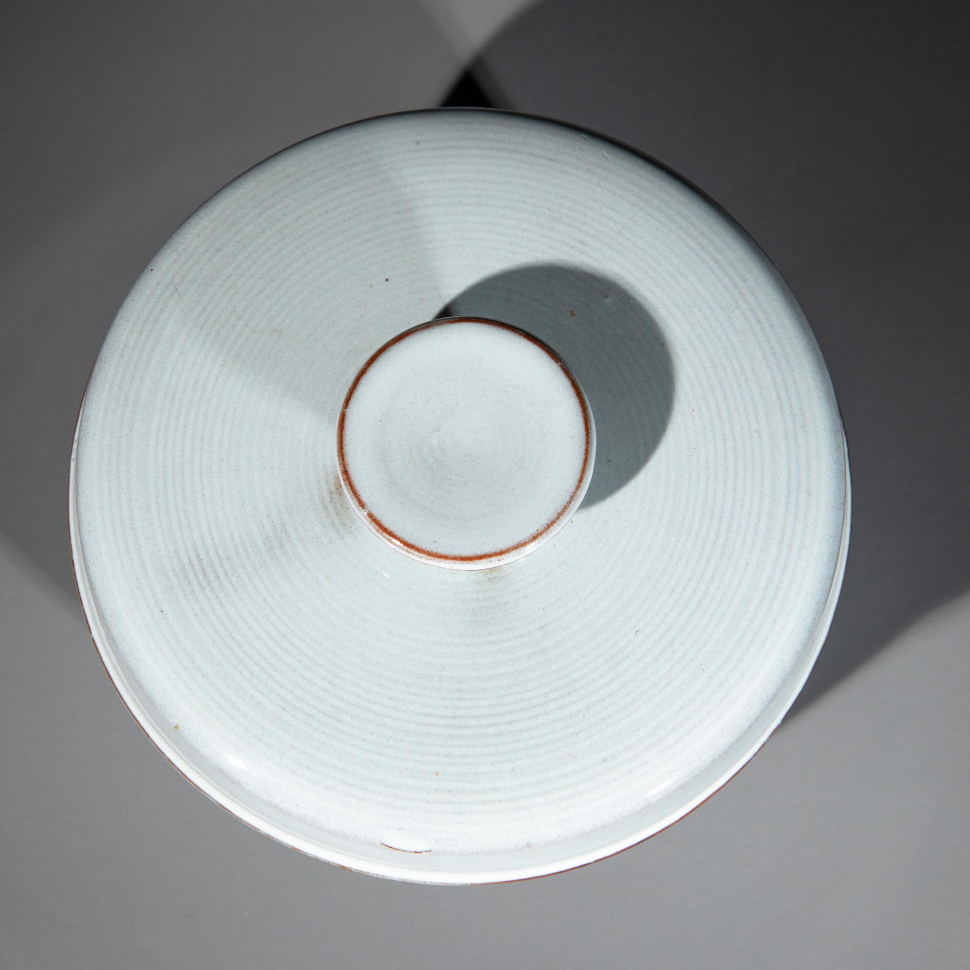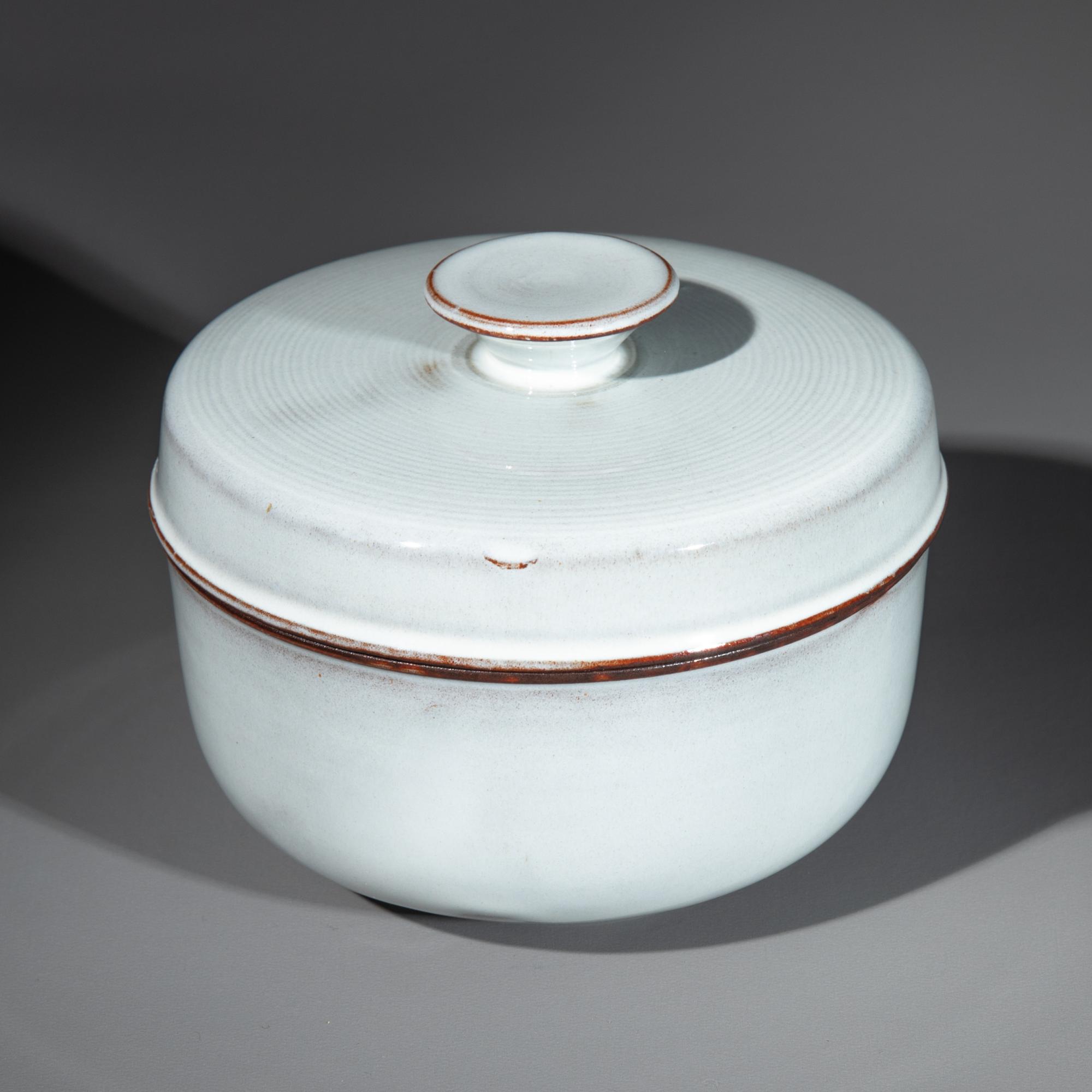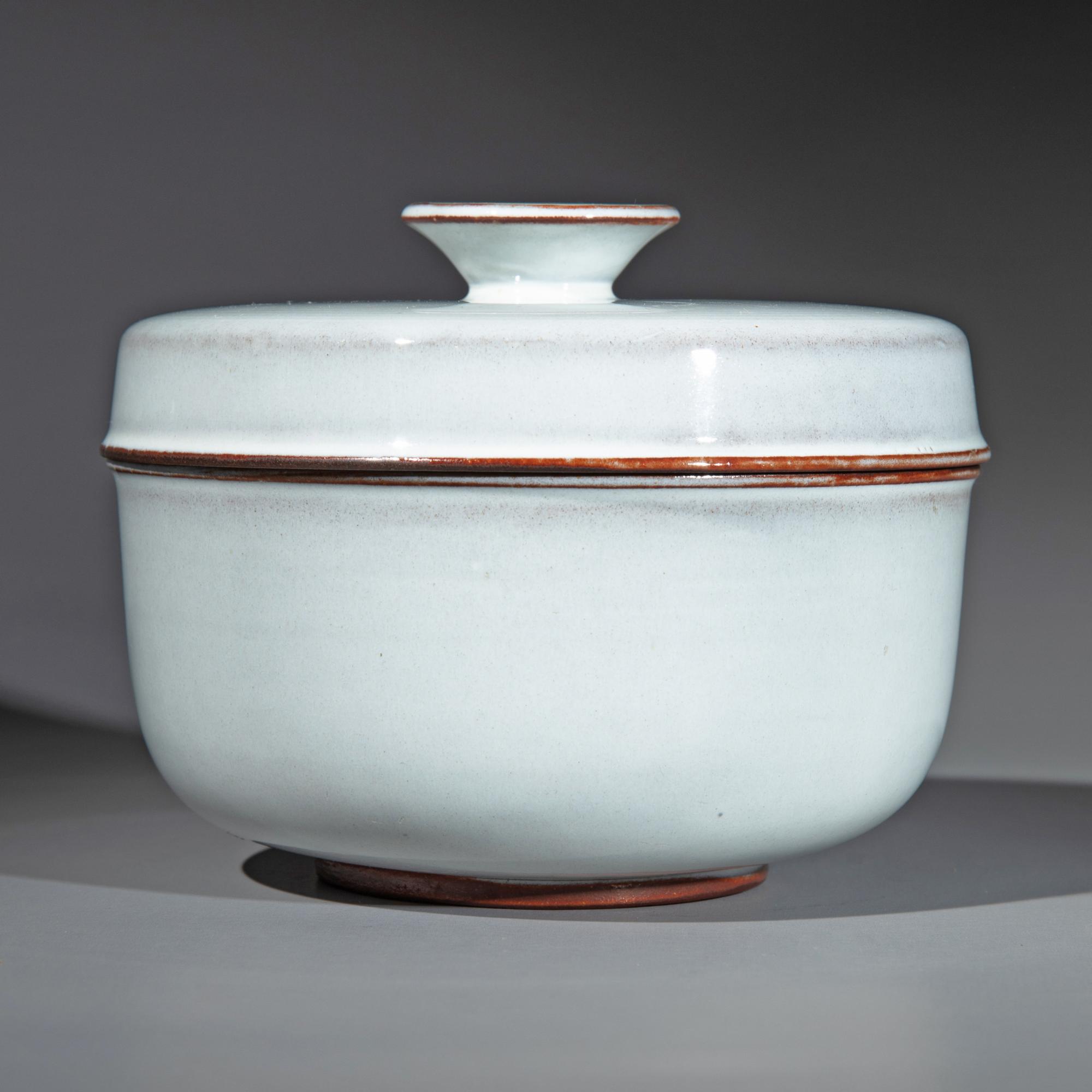 Entwurf um 1923/24. Roter Scherben, grau glasiert. Dose auf rundem Stand. Deckel mit scheibenförmigen Knauf. H. 10 cm, D. 12,8 cm. Unterseitig bezeichnet mit Künstlersignet.