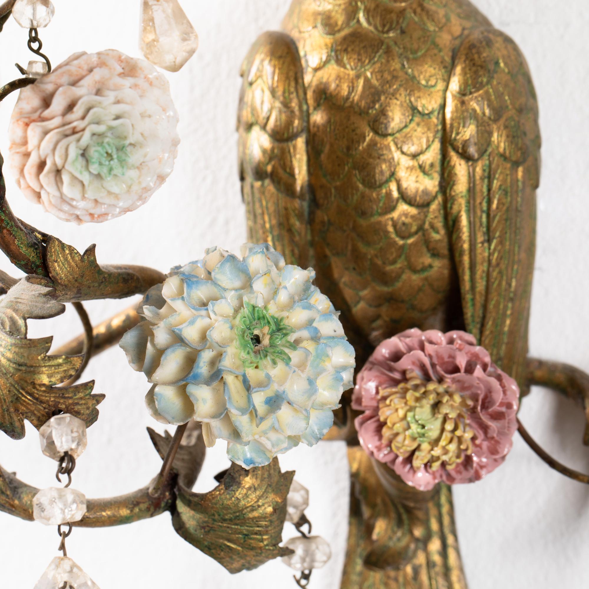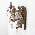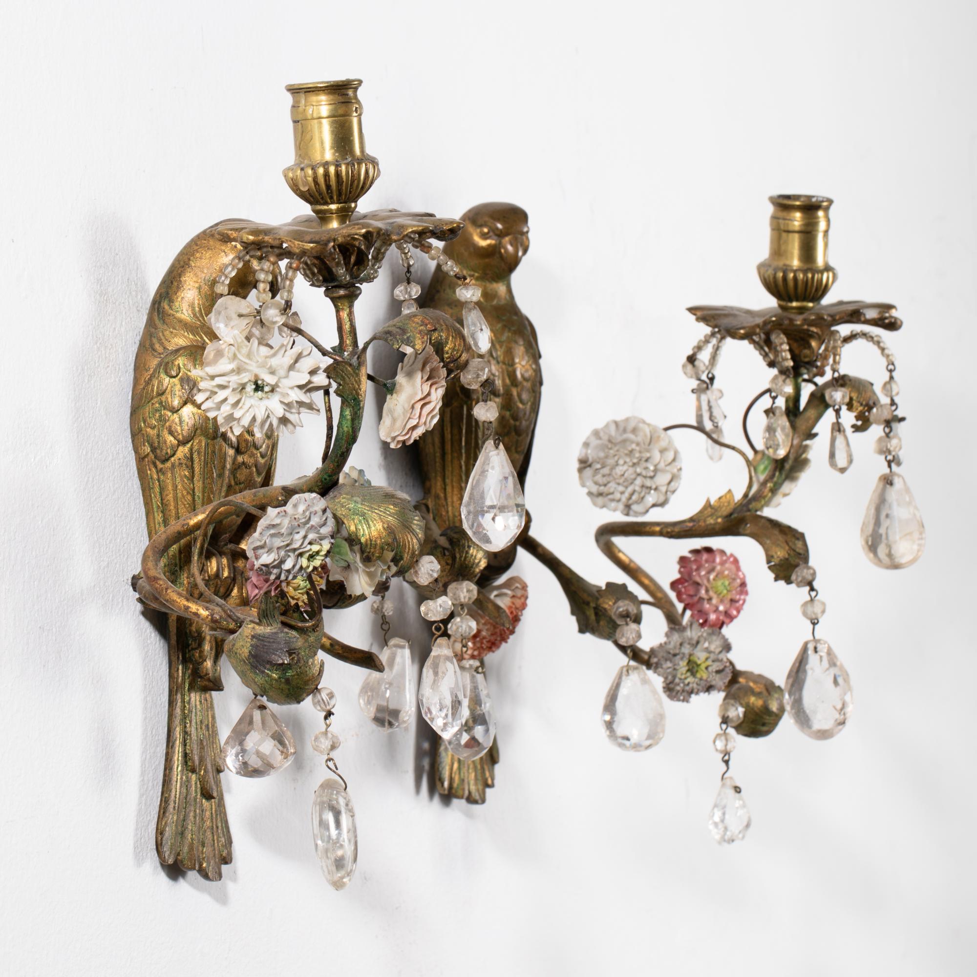 Bronze, Porzellan und Kristall. Paar gegenständig angeordnete Appliken. Der astförmiger Leuchterarm je mit darauf sitzendem Papagei in einer großen, blattförmigen Tülle endend. Reicher Dekor mit einer Vielzahl unterschiedlicher sog. Vincennes Blüten aus Porzellan sowie Gehängen aus Kristallglas. Circa 26 x 22 cm.