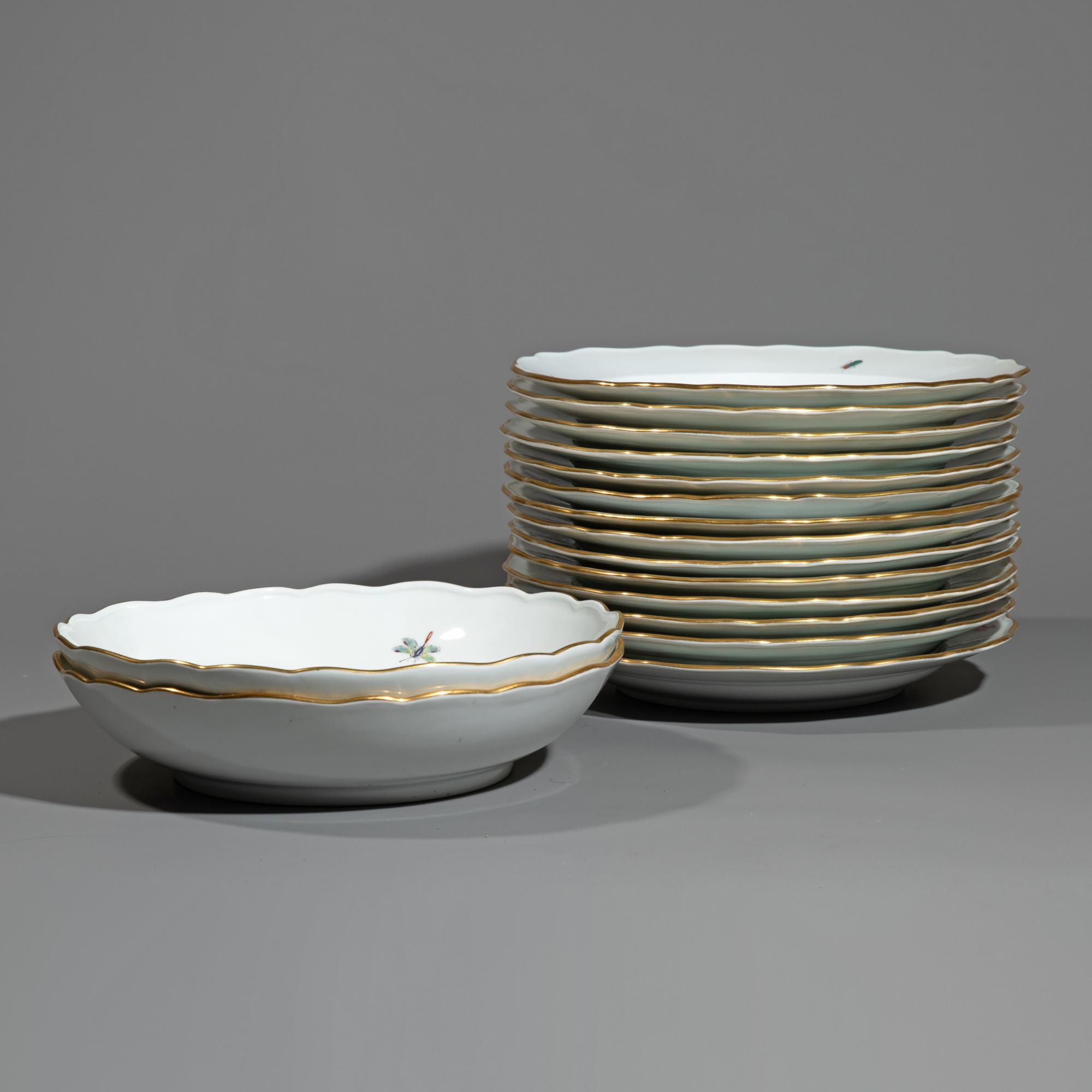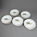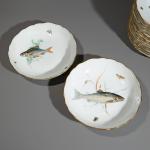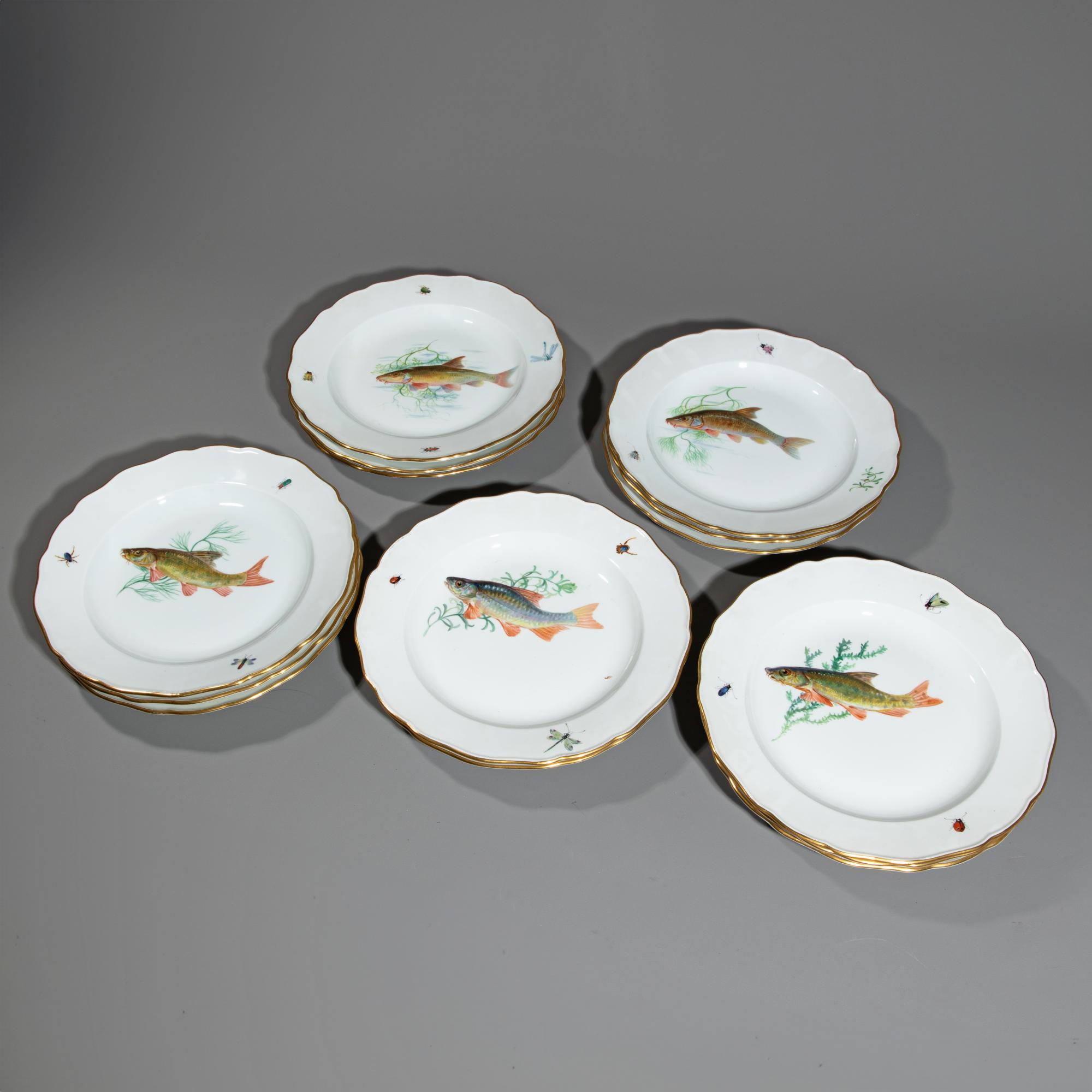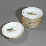 Runde Form mit fassoniertem Rand. Im vertieften Spiegel naturalistische Darstellungen verschiedener Fischarten, auf der Fahne Insektenmotive, in feiner polychromer Malerei. Goldrand. Vier Teller und eine Schüssel Unterglasurblaue Schwertermarke 1924 bis 1934,10 Teller und eine Schüssel Knaufschwertermarke 1860-1924. Verschiedenen Pressmarken und gepinselte Malerzeichen. Schüsseln D 25 cm; Servierplatte L 54 cm;