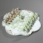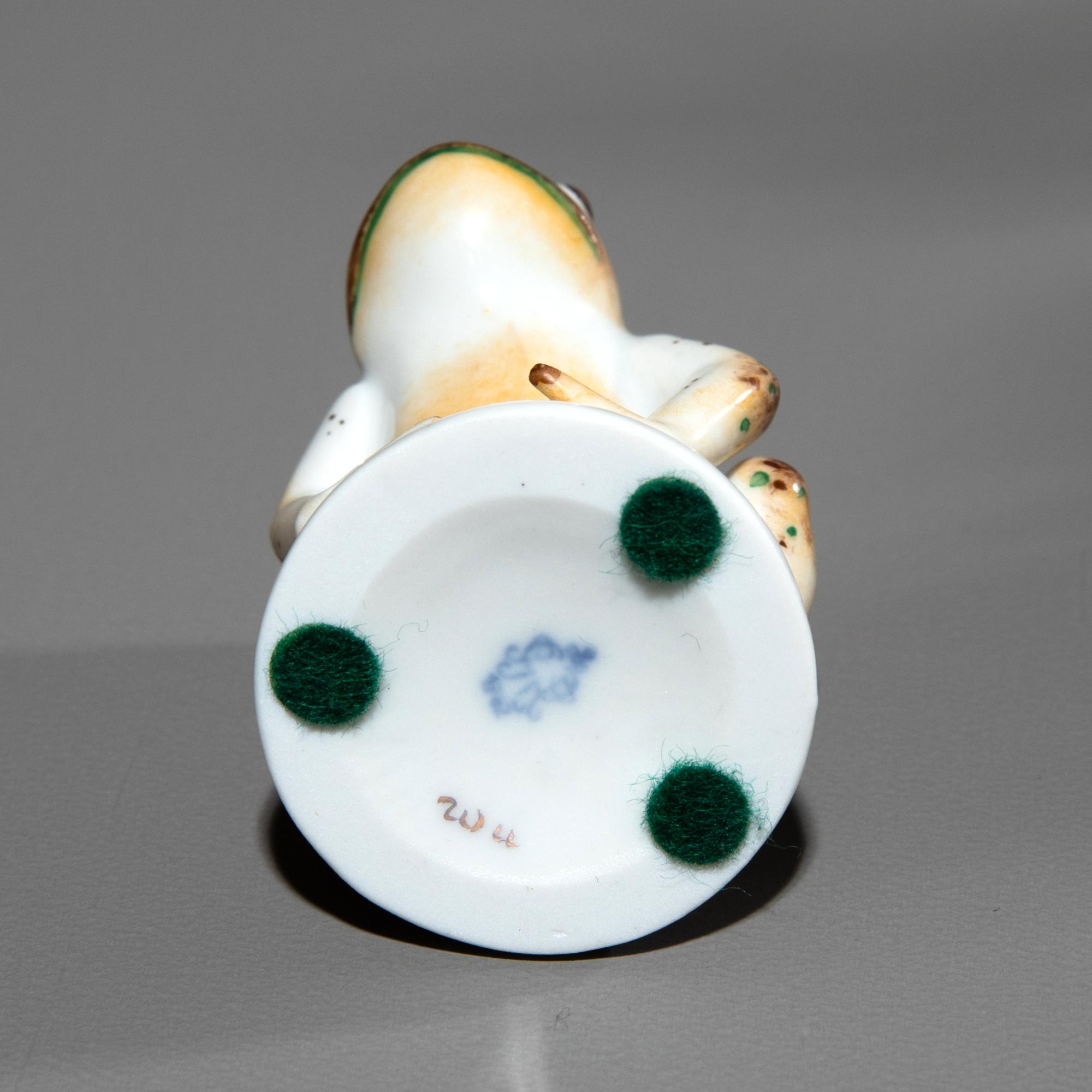 -blätter gestaltet, Rand mit Wellenrelief. Dazu passend 33 Figuren in Form von Fröschen mit grüner und brauner Bemalung. Älteste Volkstädter Porzellanmanufaktur.
