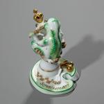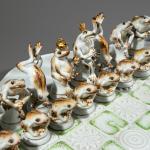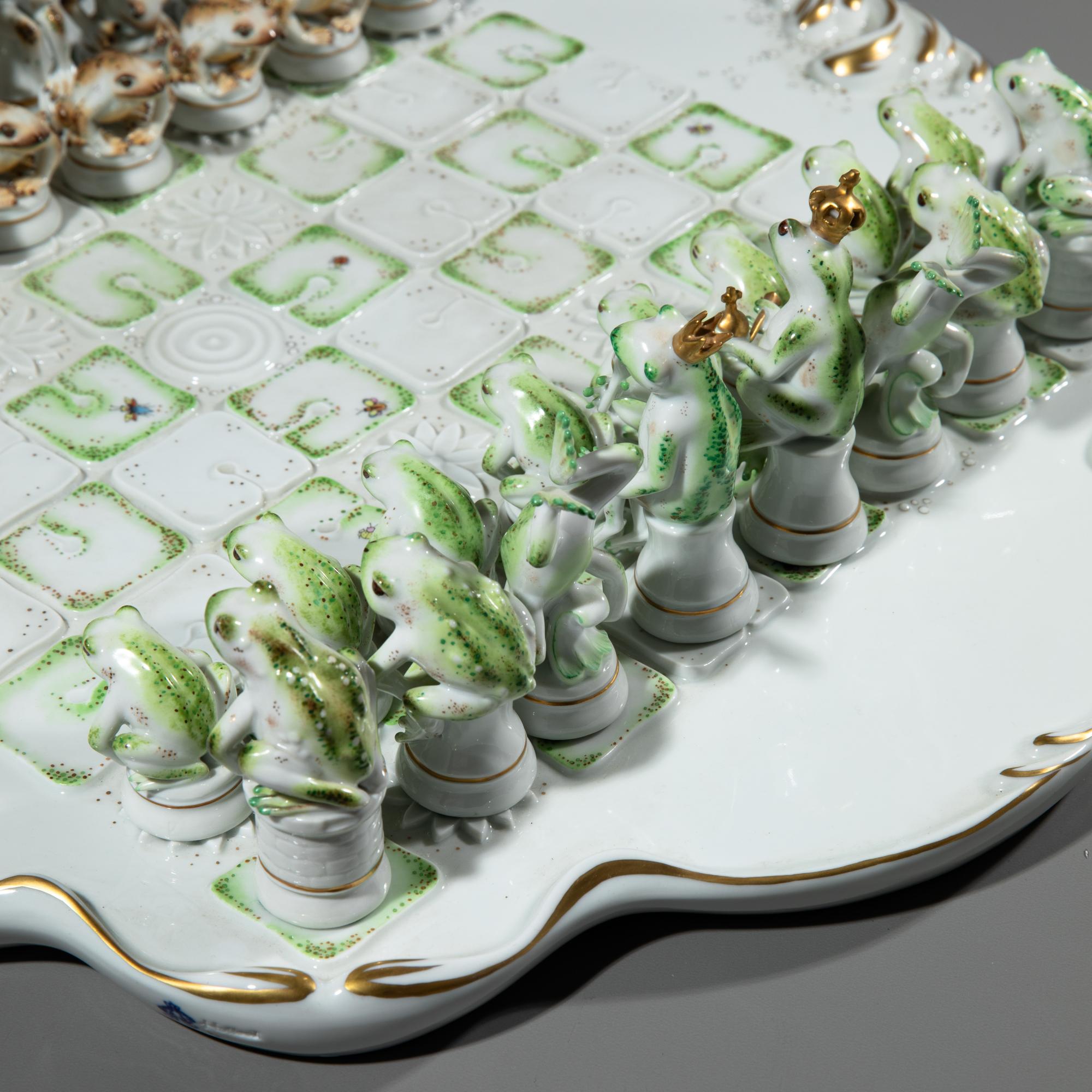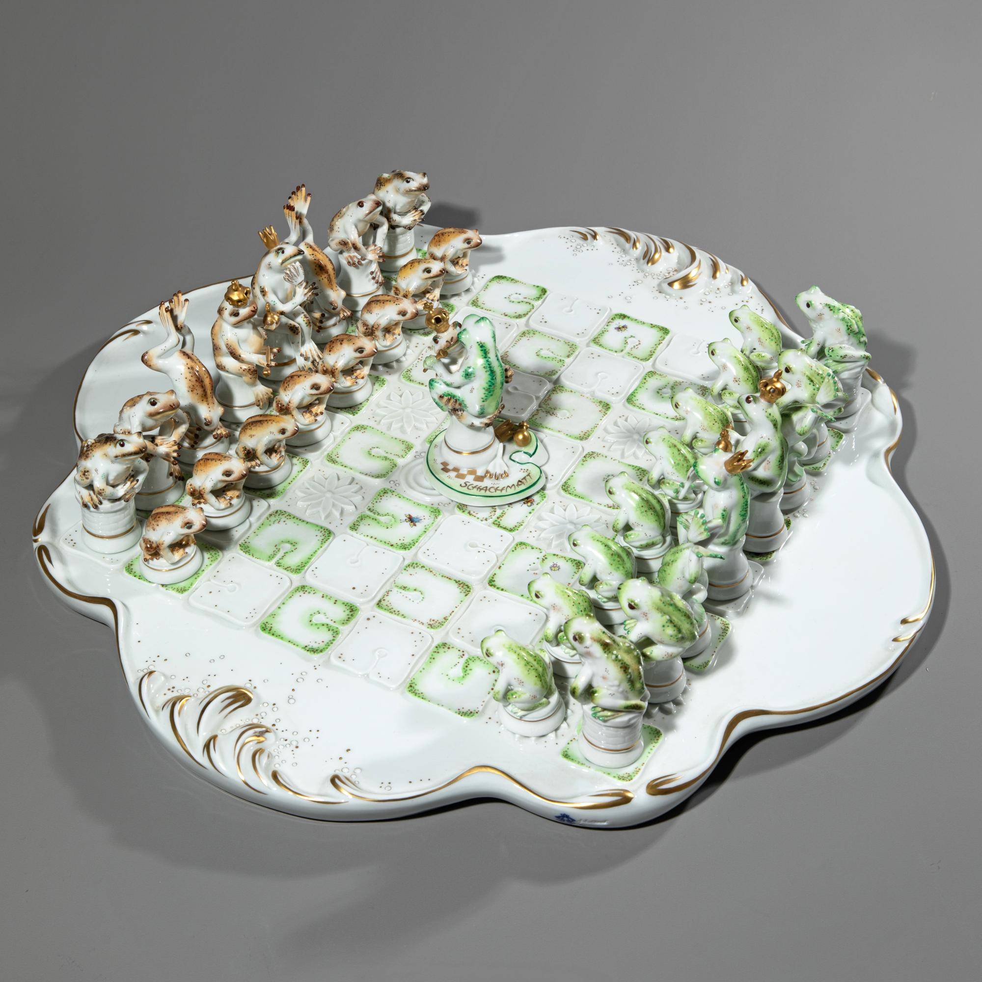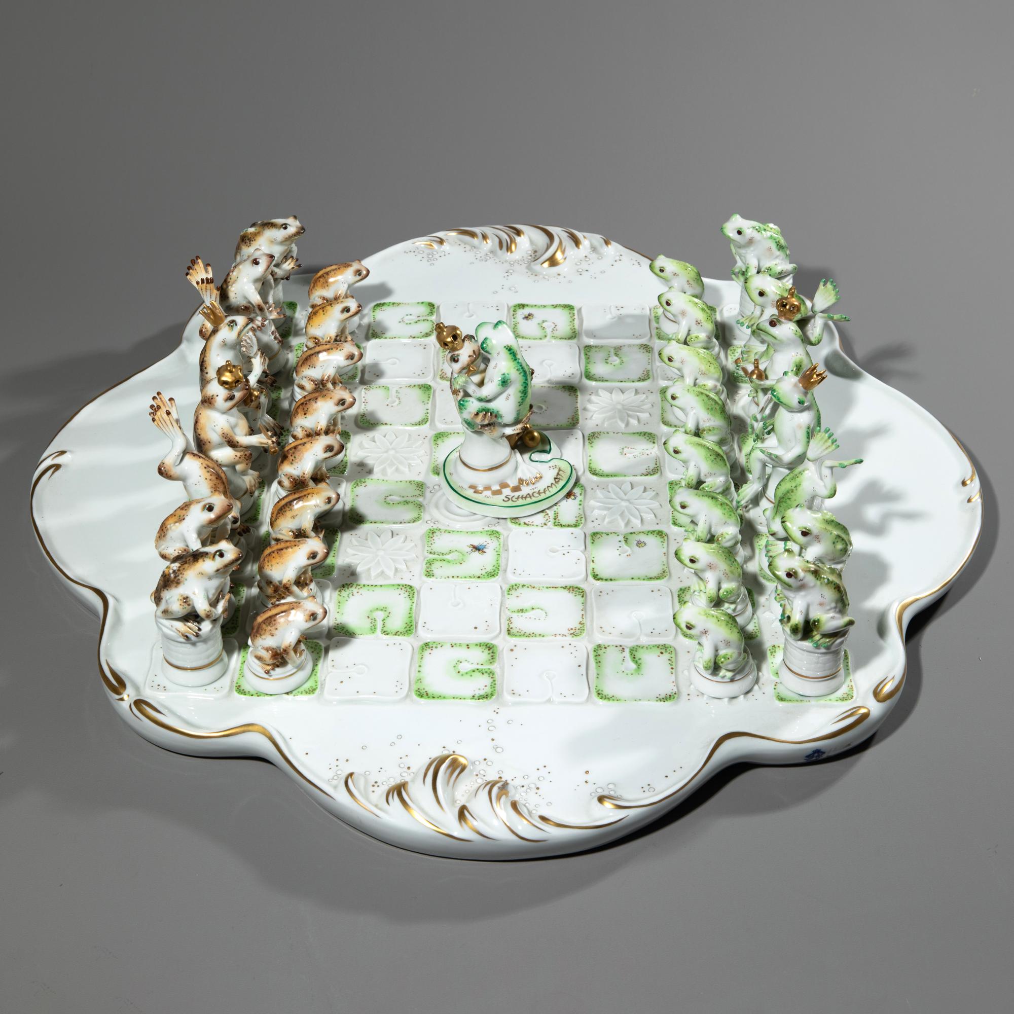 Porzellan, Emailfarben, Vergoldung. Spiel der Frösche auf einem mit Seerosen besetzten Teich. Bestehend aus einem Schachbrett, Felder erhaben als Seerosenblüten und