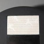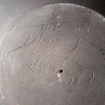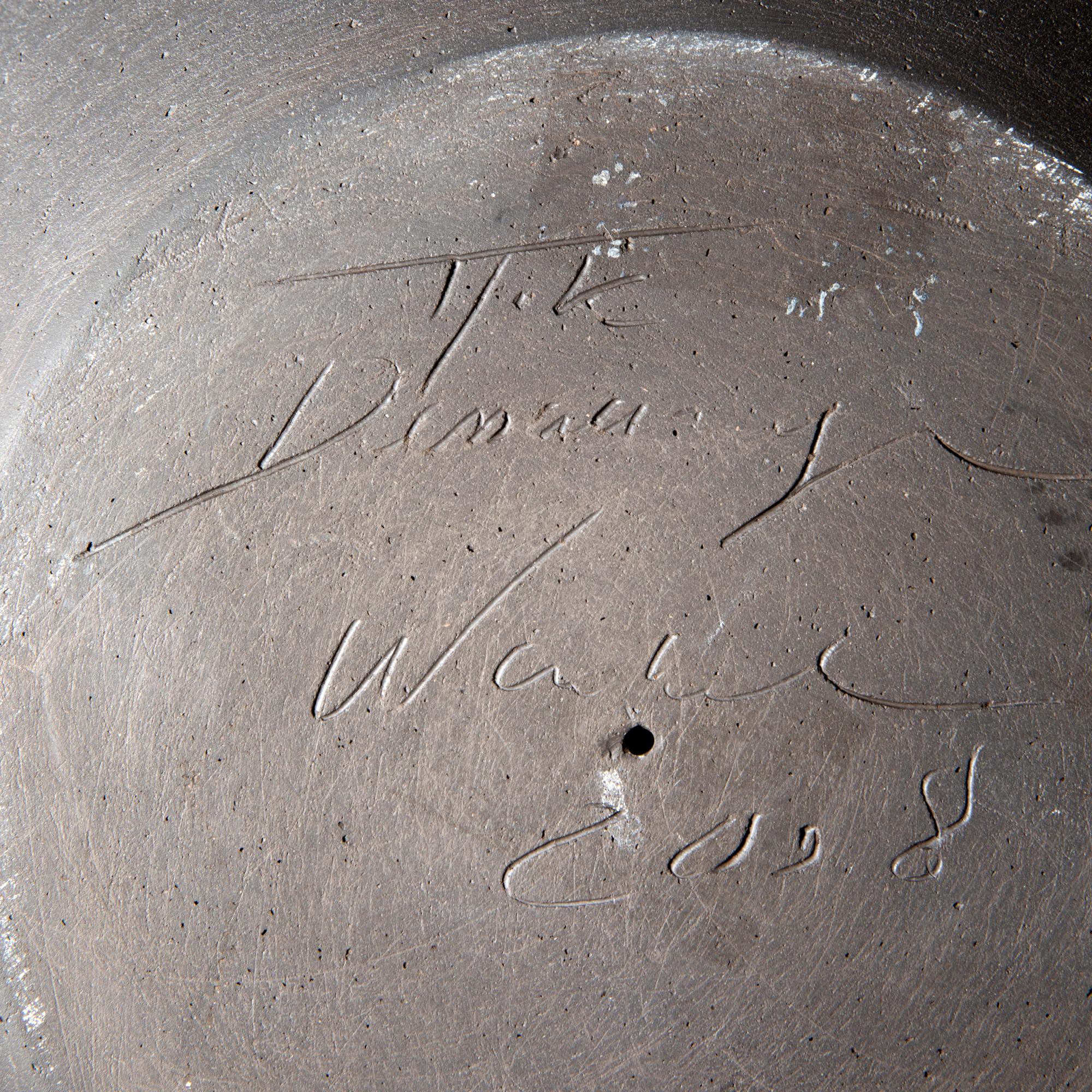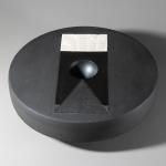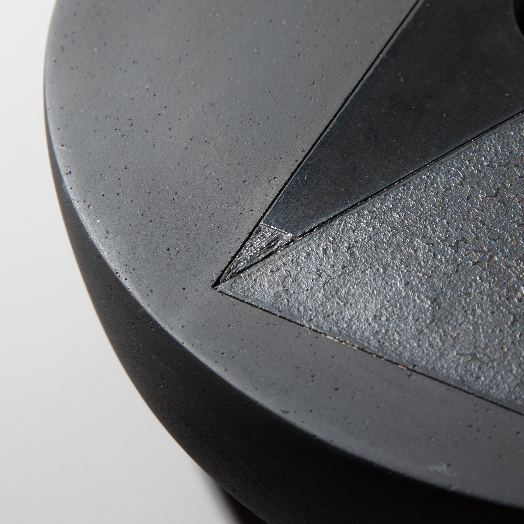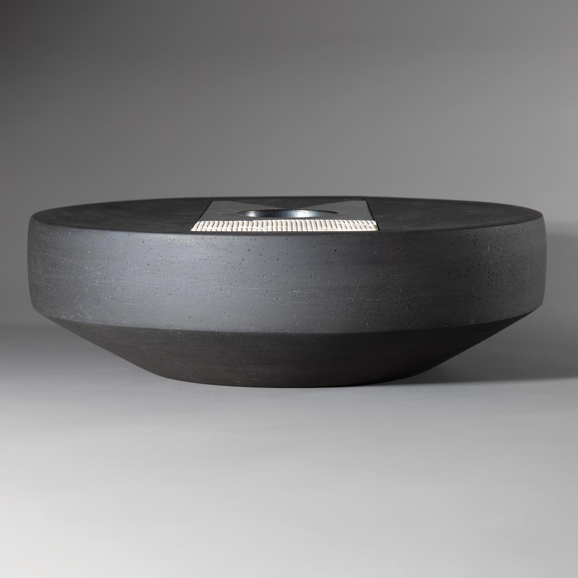 Keramik. Runde, flache Plastik mit schalenähnlicher Vertiefung. Eingelassenes, rechteckiges Band aus zusammengesetzten Elementen mit unterschiedlichen Farbtönen und Oberflächenbeschaffenheiten. H. 9,4 cm, D. 31,3 cm. Unterseitig signiert und datiert.