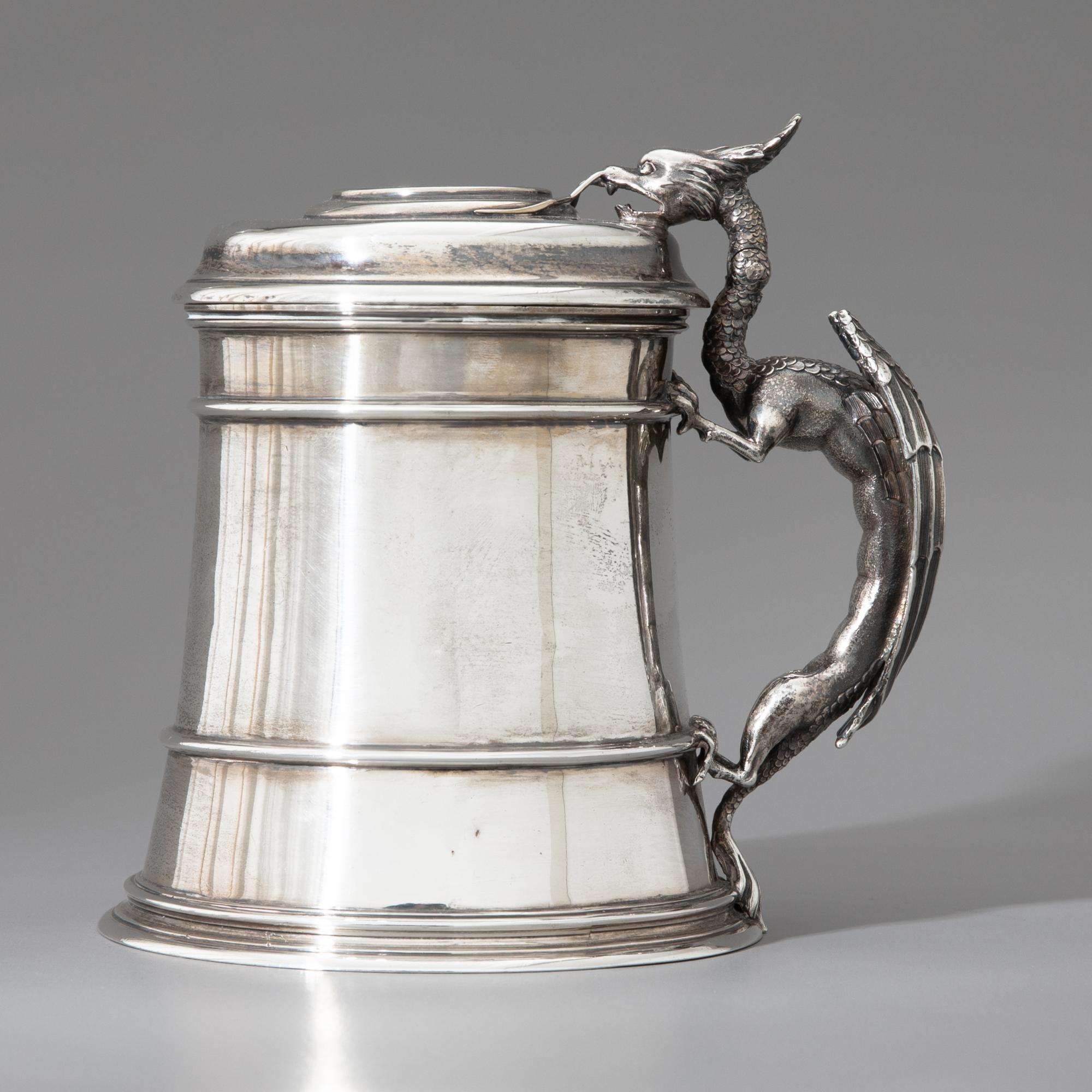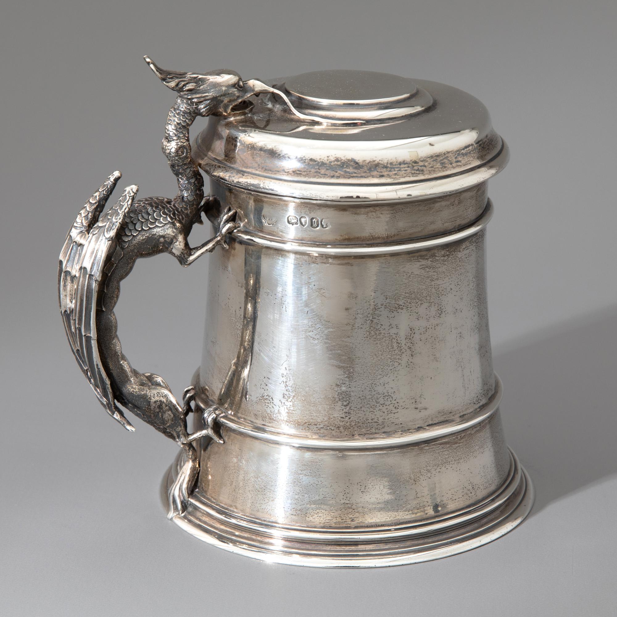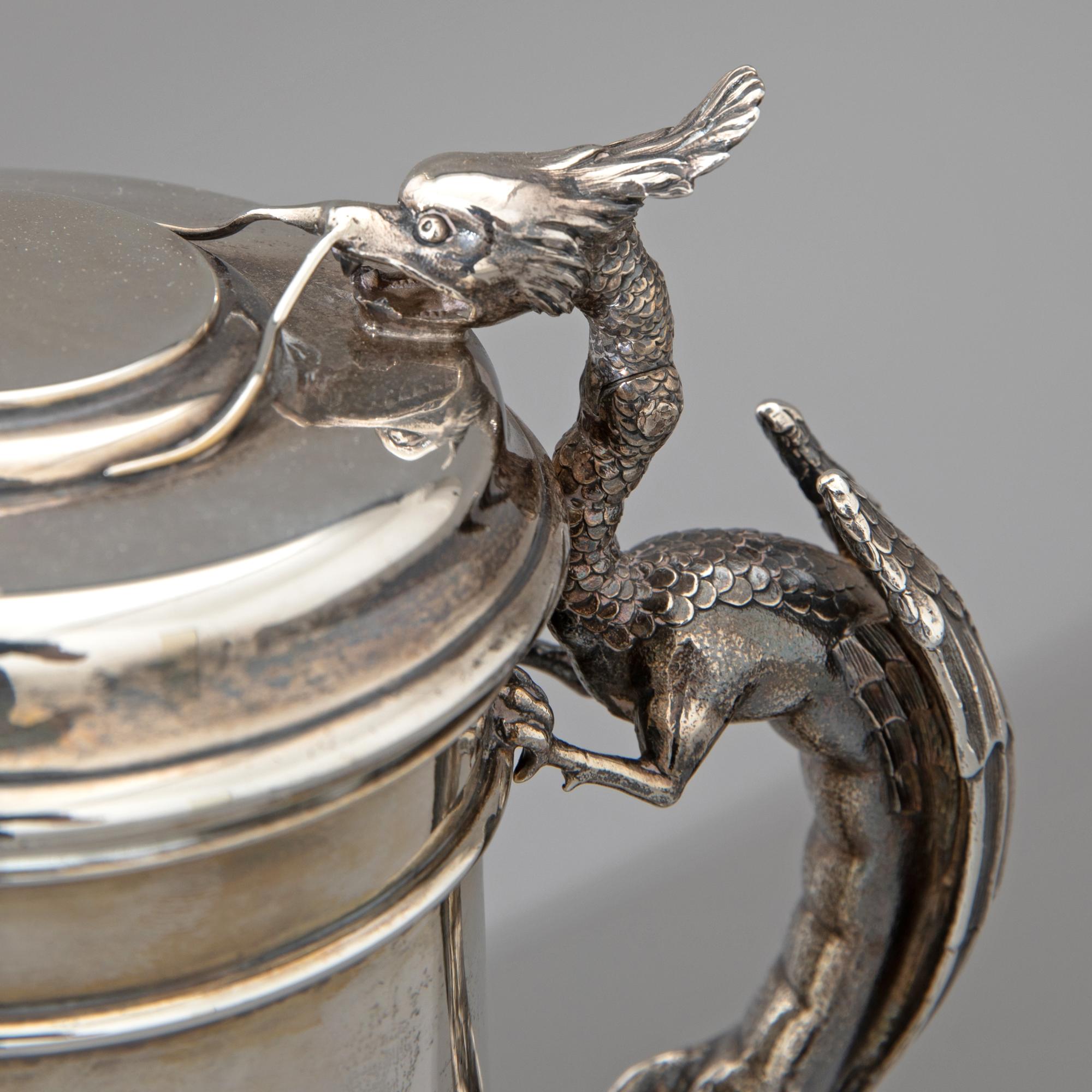 London 1862. 925er Silber. Im Inneren vergoldet. Über fein profiliertem Standring leicht konisch zulaufender Korpus mit zwei Profilringen und verstärkter Lippe. Henkel in Form eines plastisch ausgearbeiteten chinesischen Drachen, der den Haubendeckel hält.