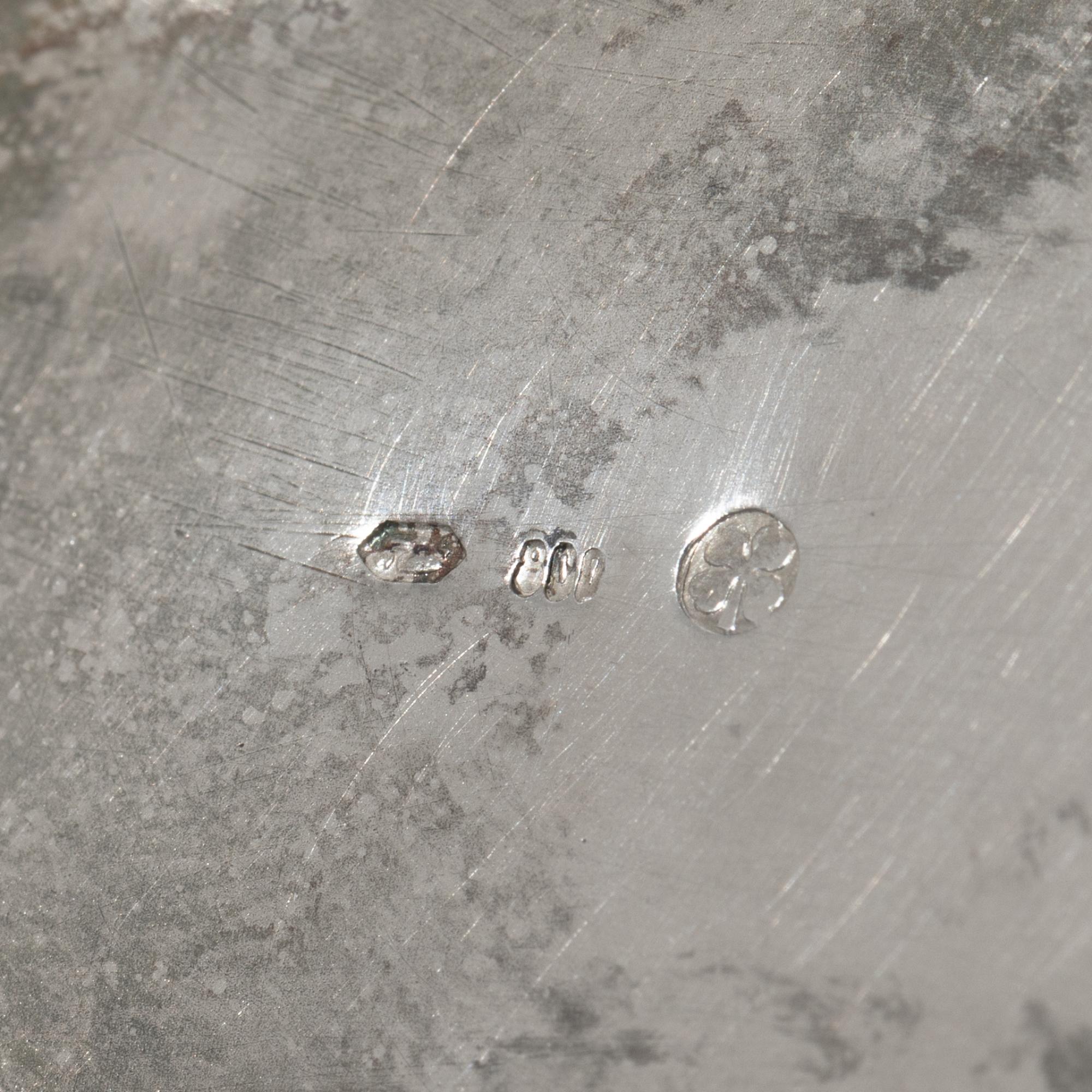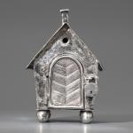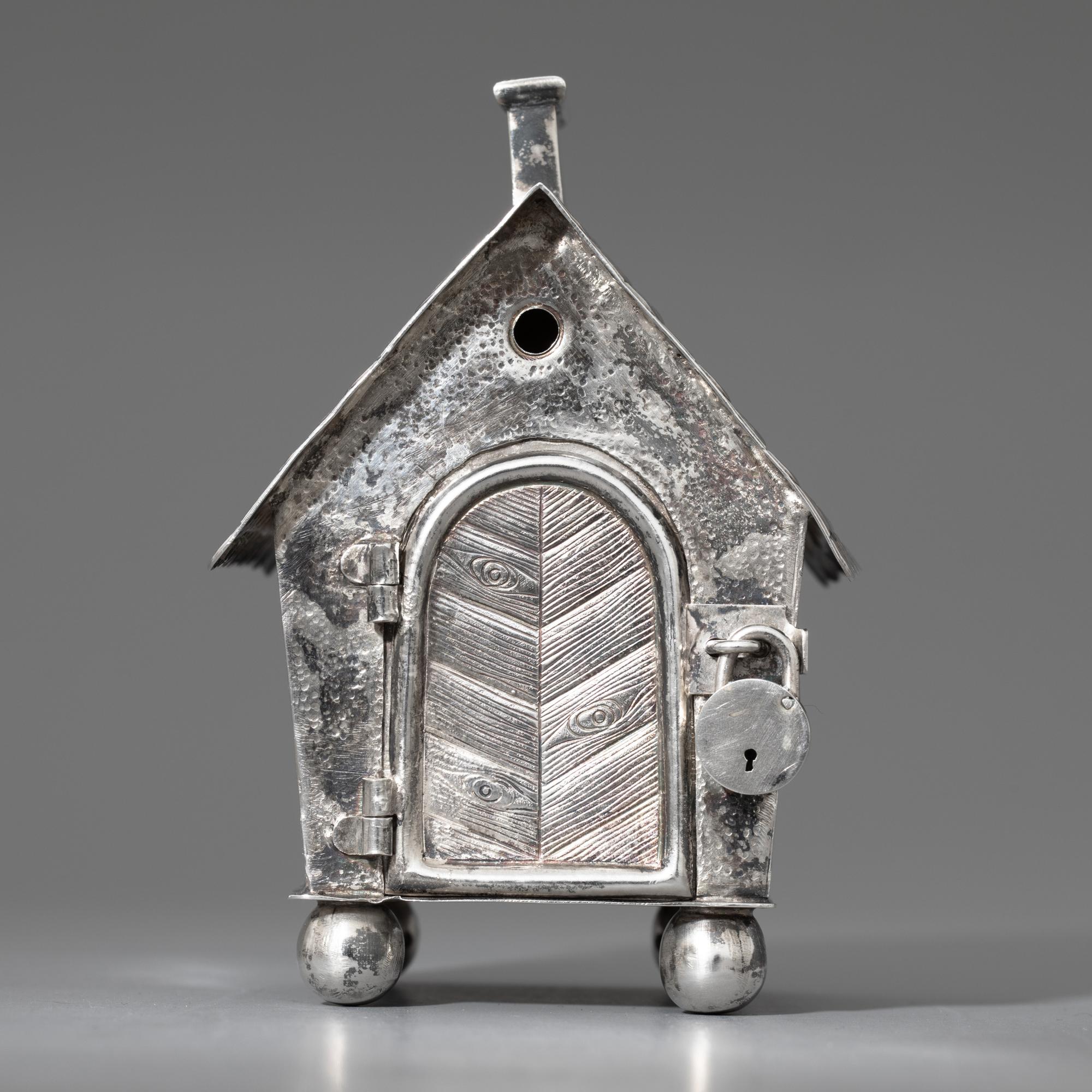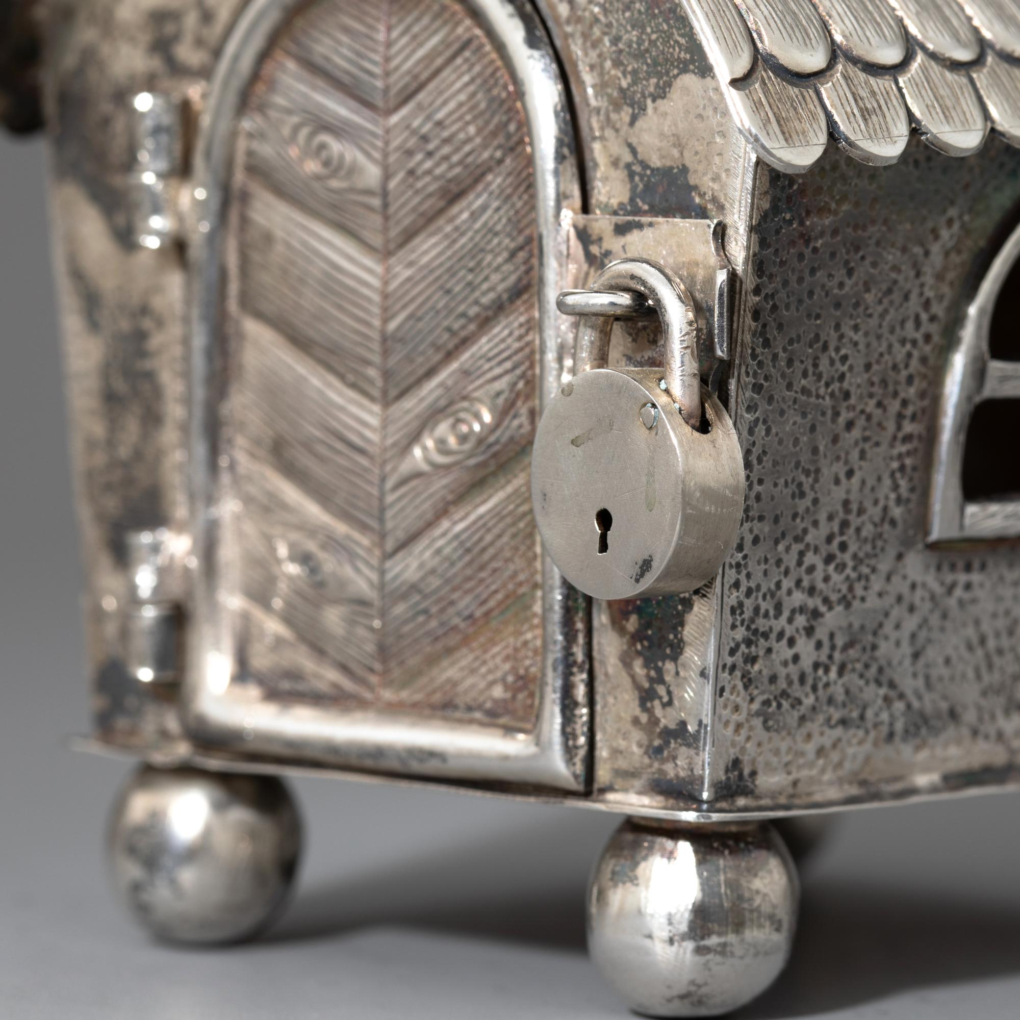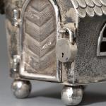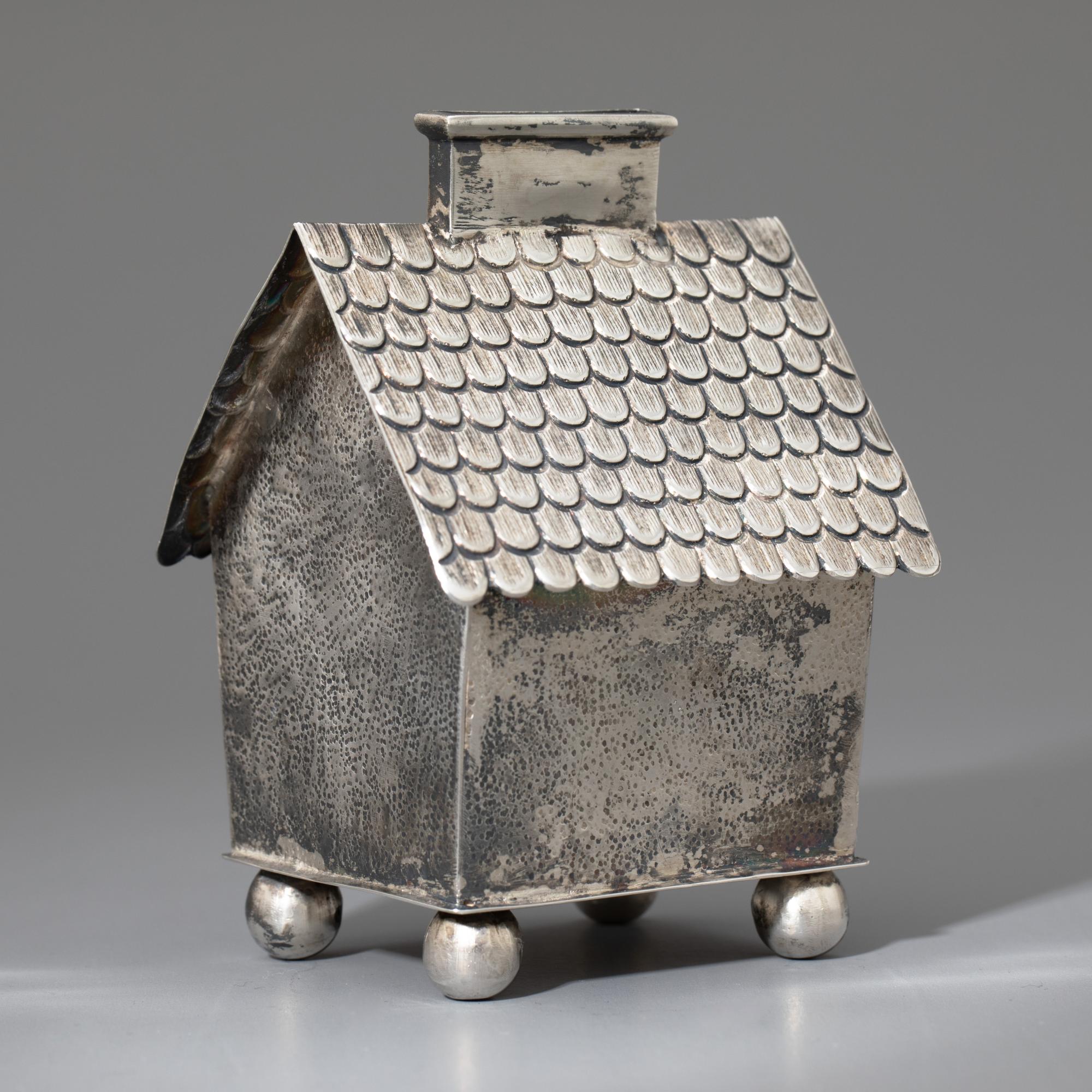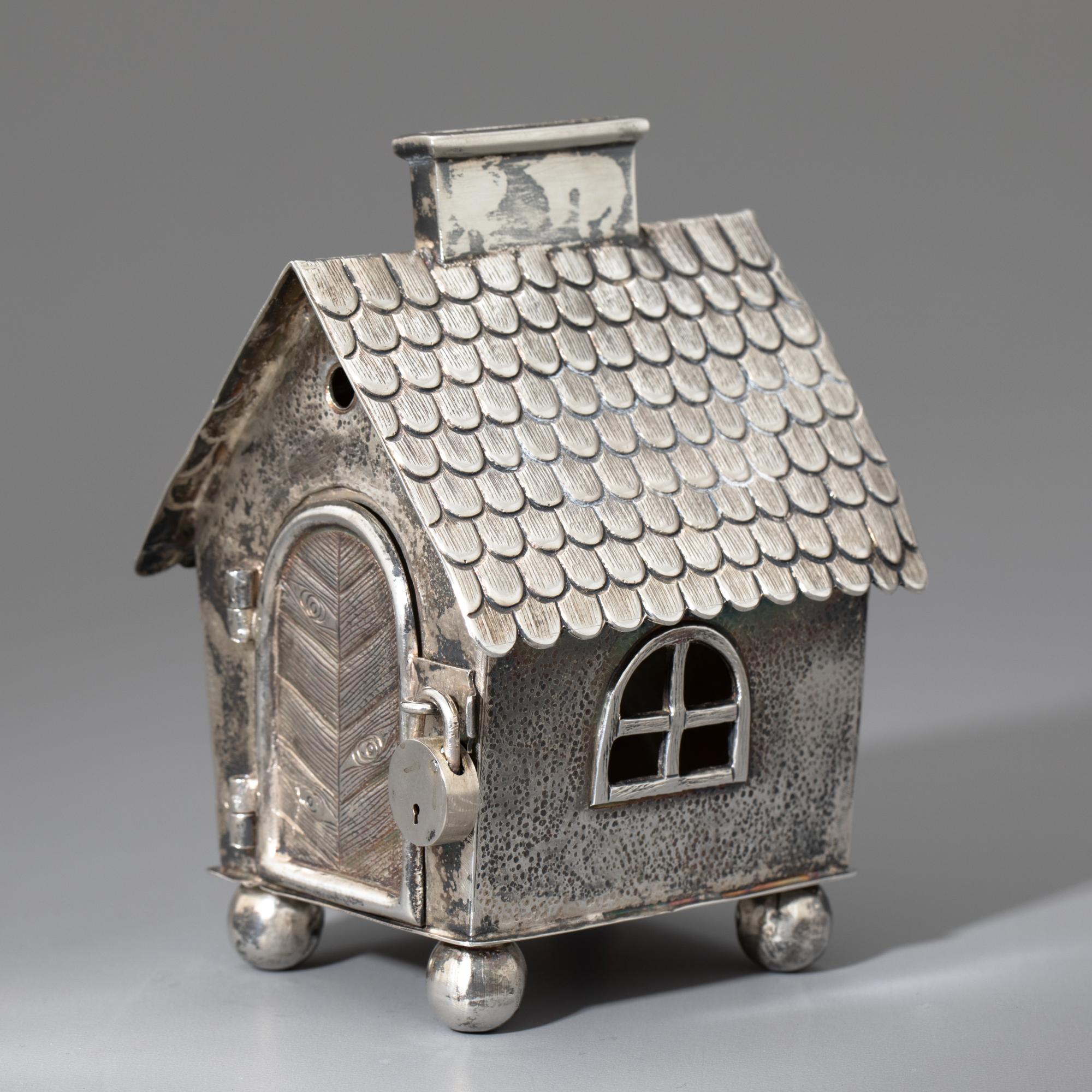 Silber. Spardose in Form eines kleinen Häuschens auf Kugelfüßen. Mit Schornstein als Geldschlitz und Tür mit kleinem Vorhängeschloss. 11 x 7 x 7 cm. Gewicht 167 g. Unterseitig punziert mit Firmenzeichen von Alexander Sturm, Feingehalt 800, Wiener Tukankopfpunze ab 1922.