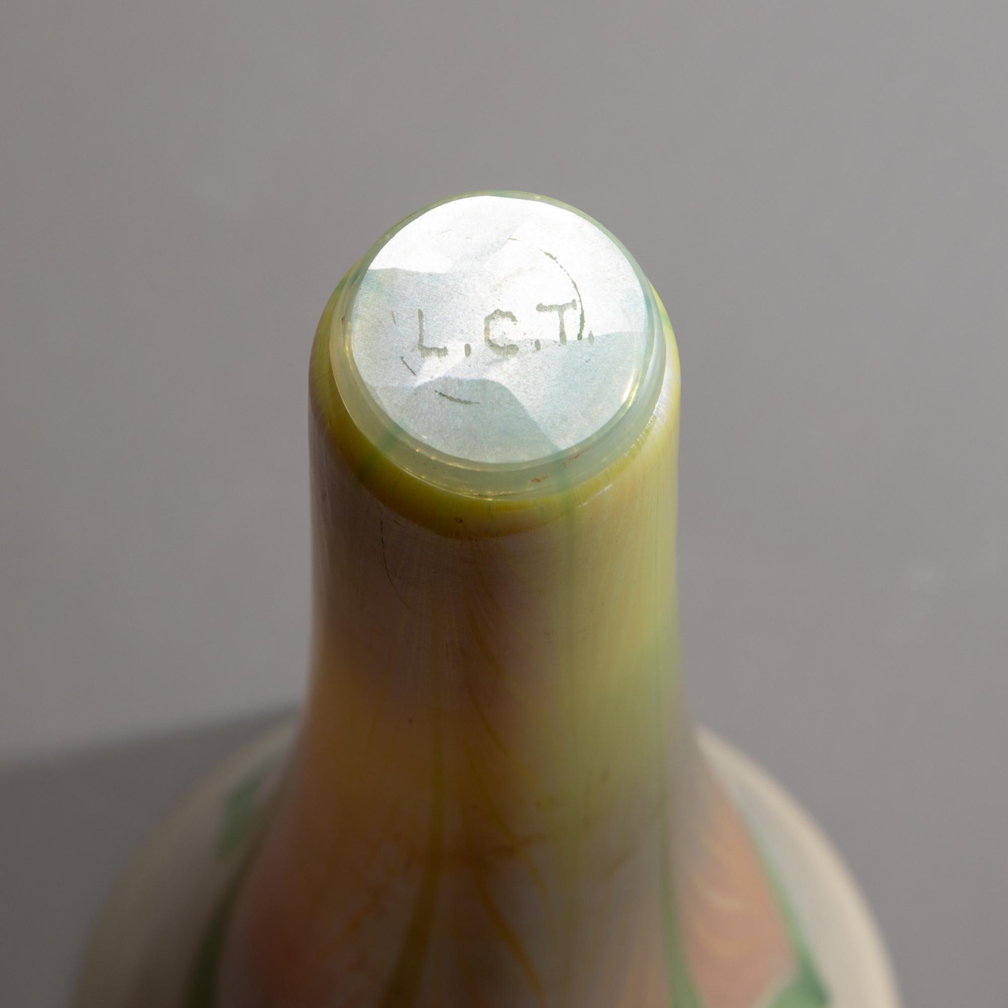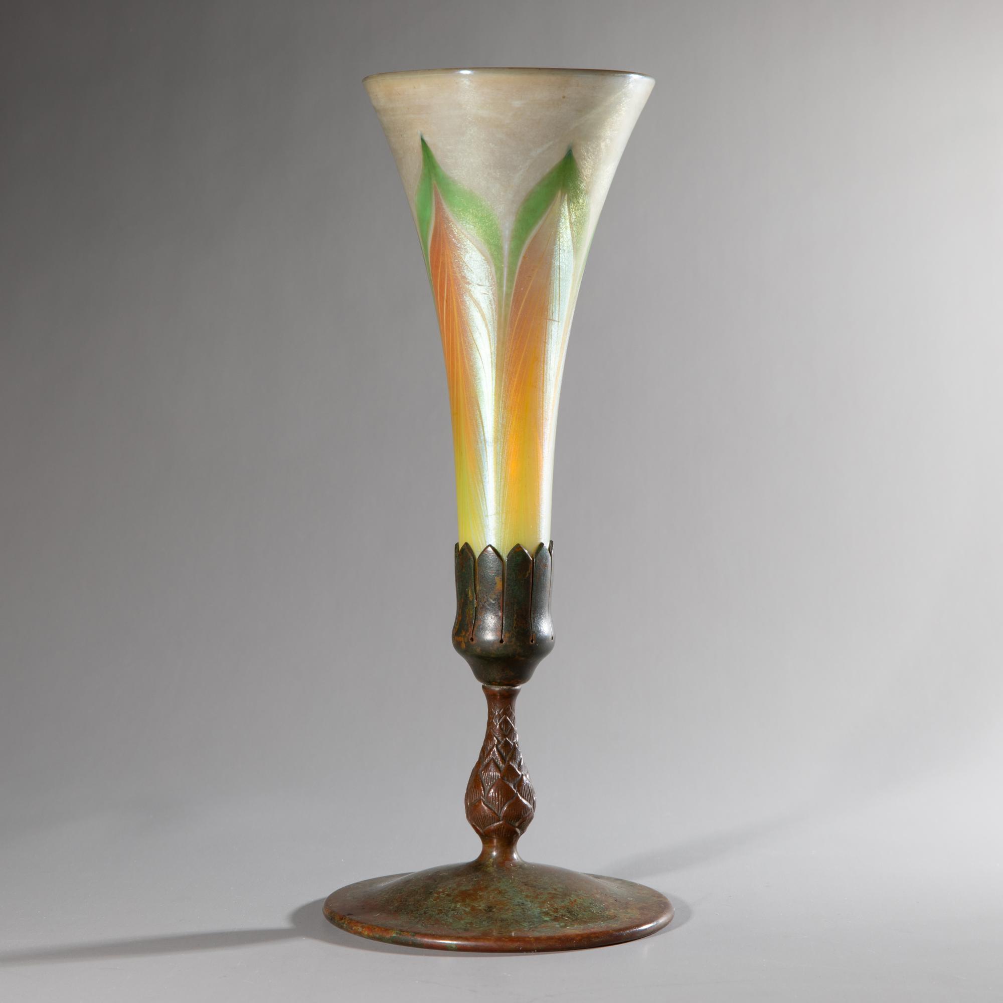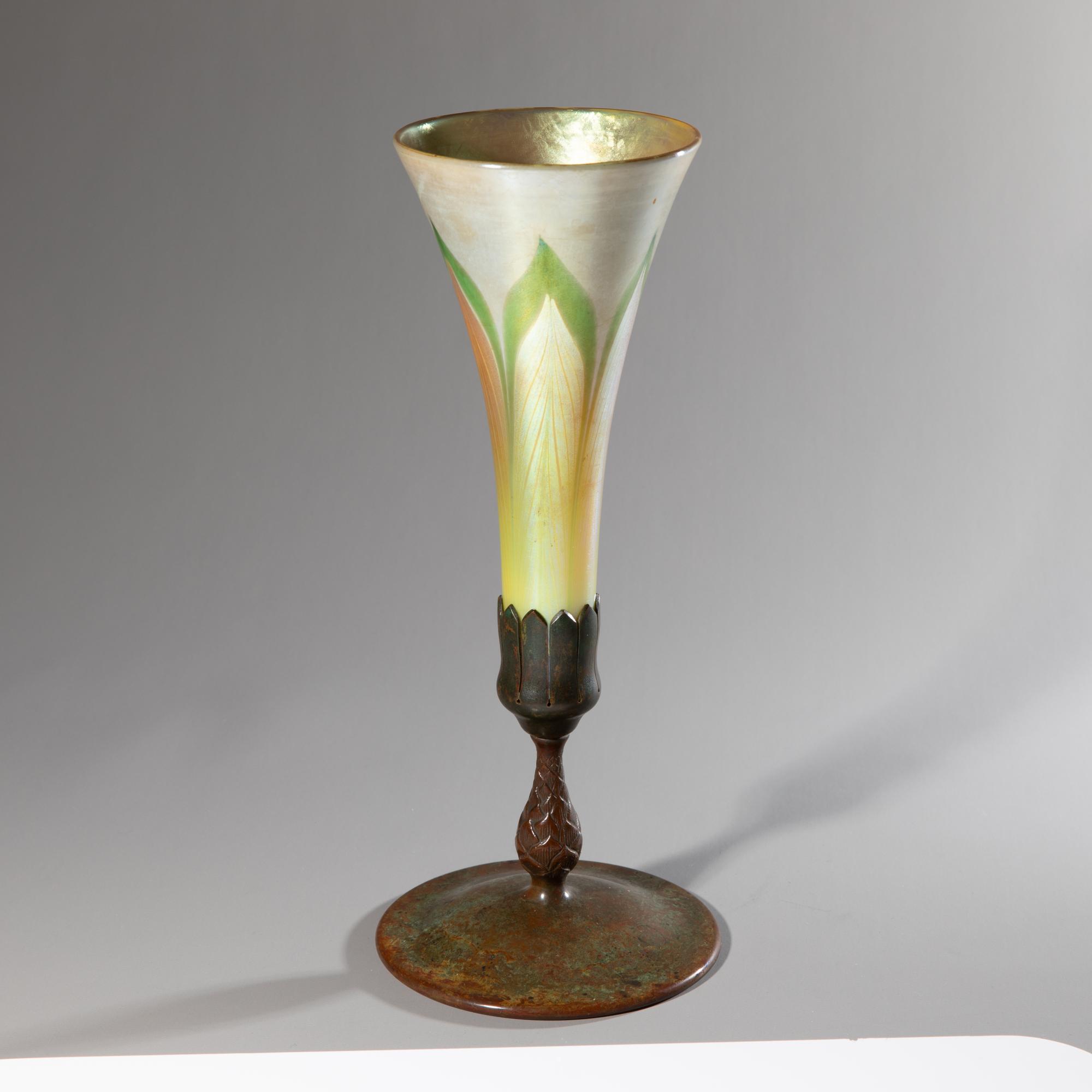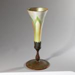 Favrile-Glas. Überfangglas, farblos, opalweiß und grün. Gekämmte grüne Fäden, mattlüstriert. Boden sign.: L. C. T. (graviert). Bronzefuß, grünlichbraun patiniert. H. 30 cm. Bez.: TIFFANY STUDIOS NEW YORK, 1043 (geprägt),