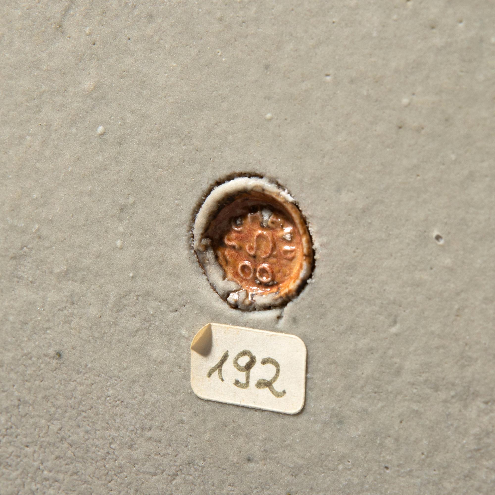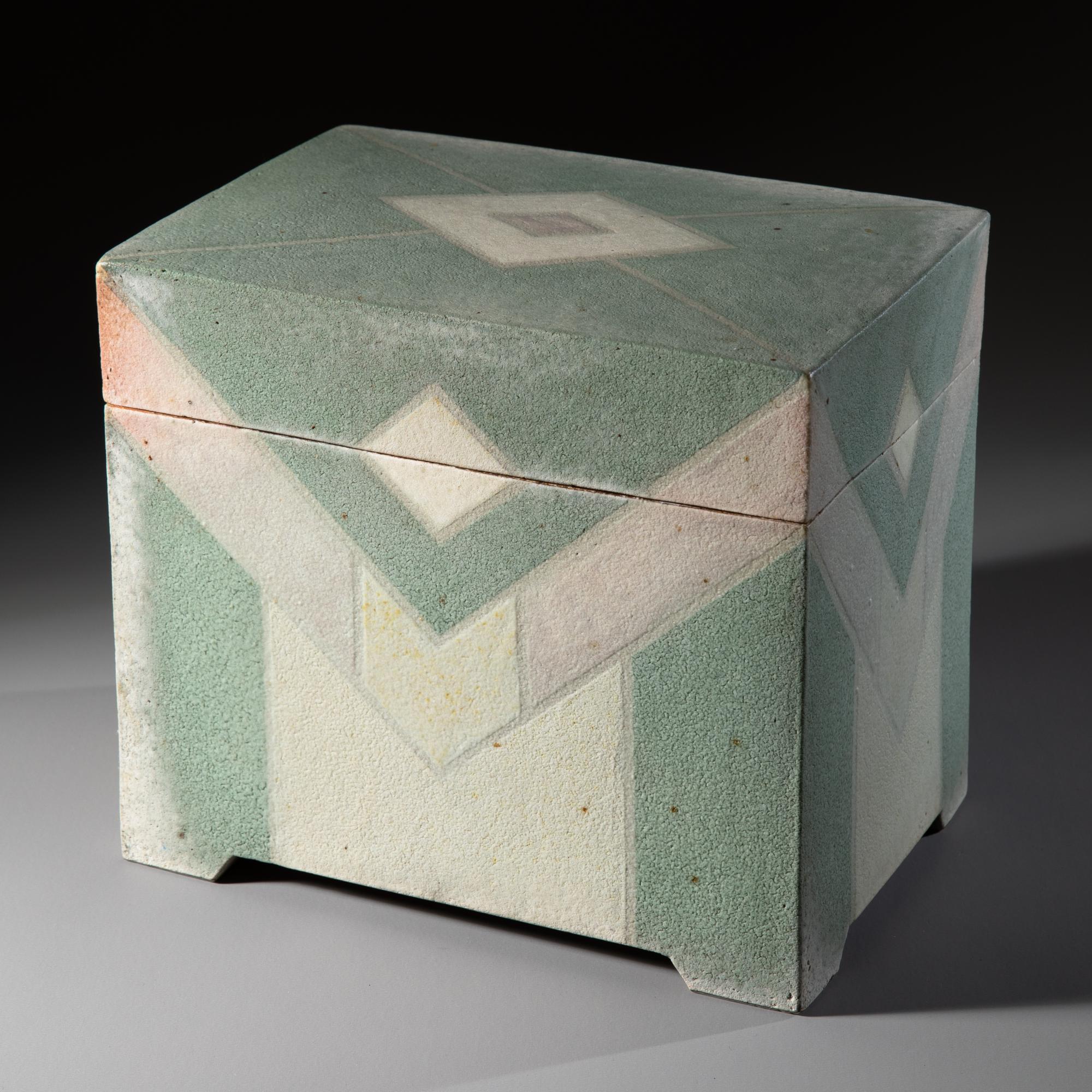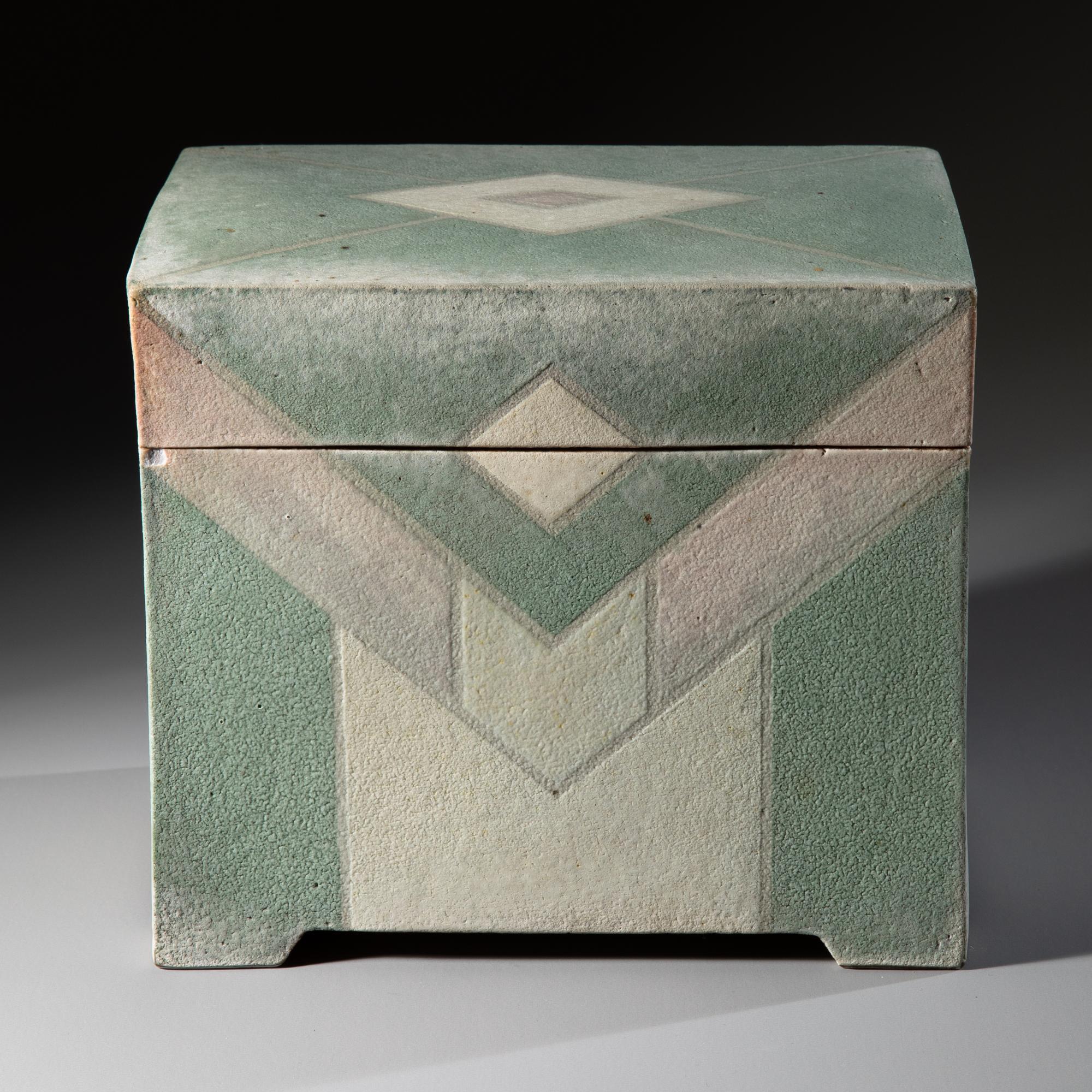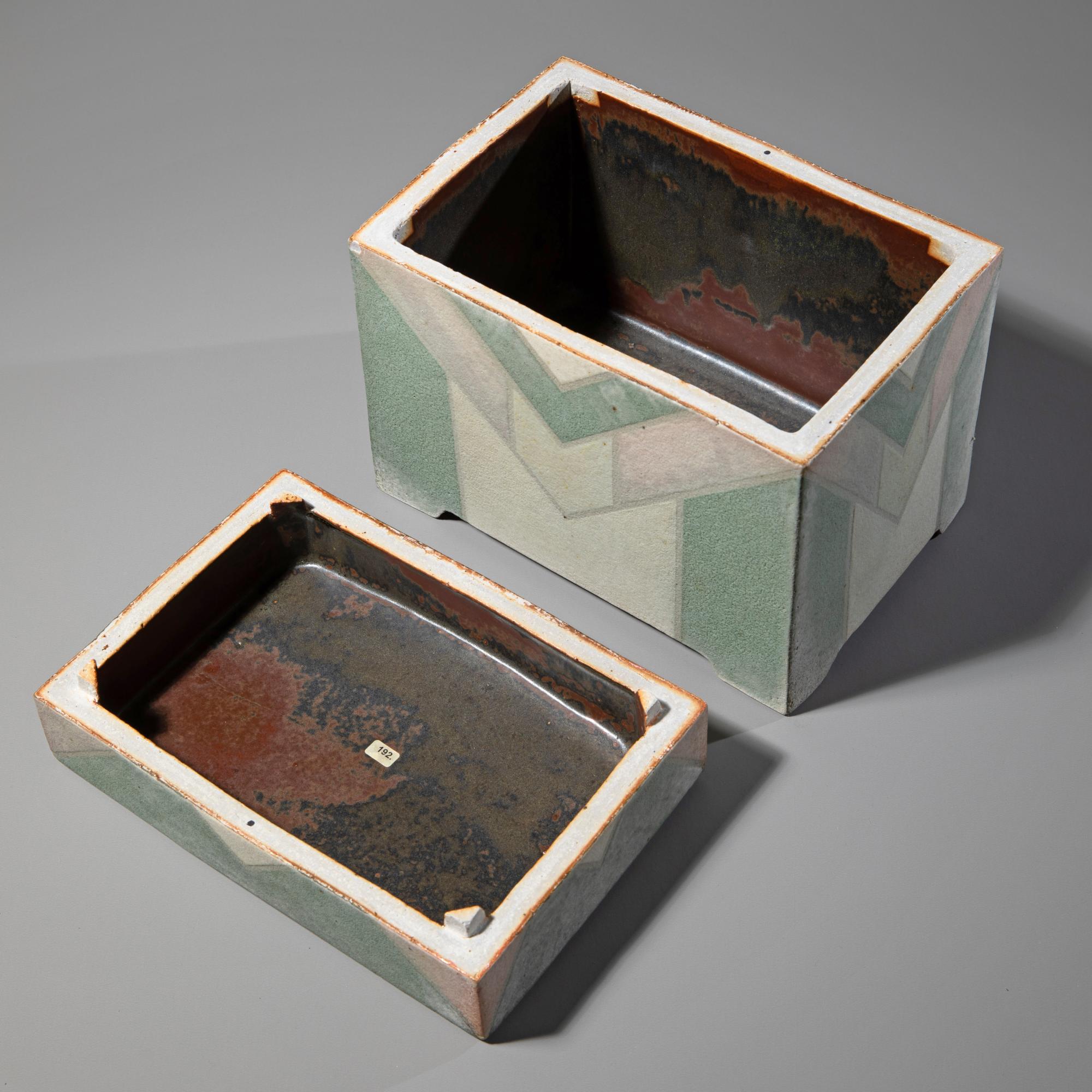 Rechteckige Keramikdose mit geometrischem Dekor. 20 x 22,5 x 15,2 cm. Unterseitig bezeichnet mit Werkstattmarke und Datierung. 00.