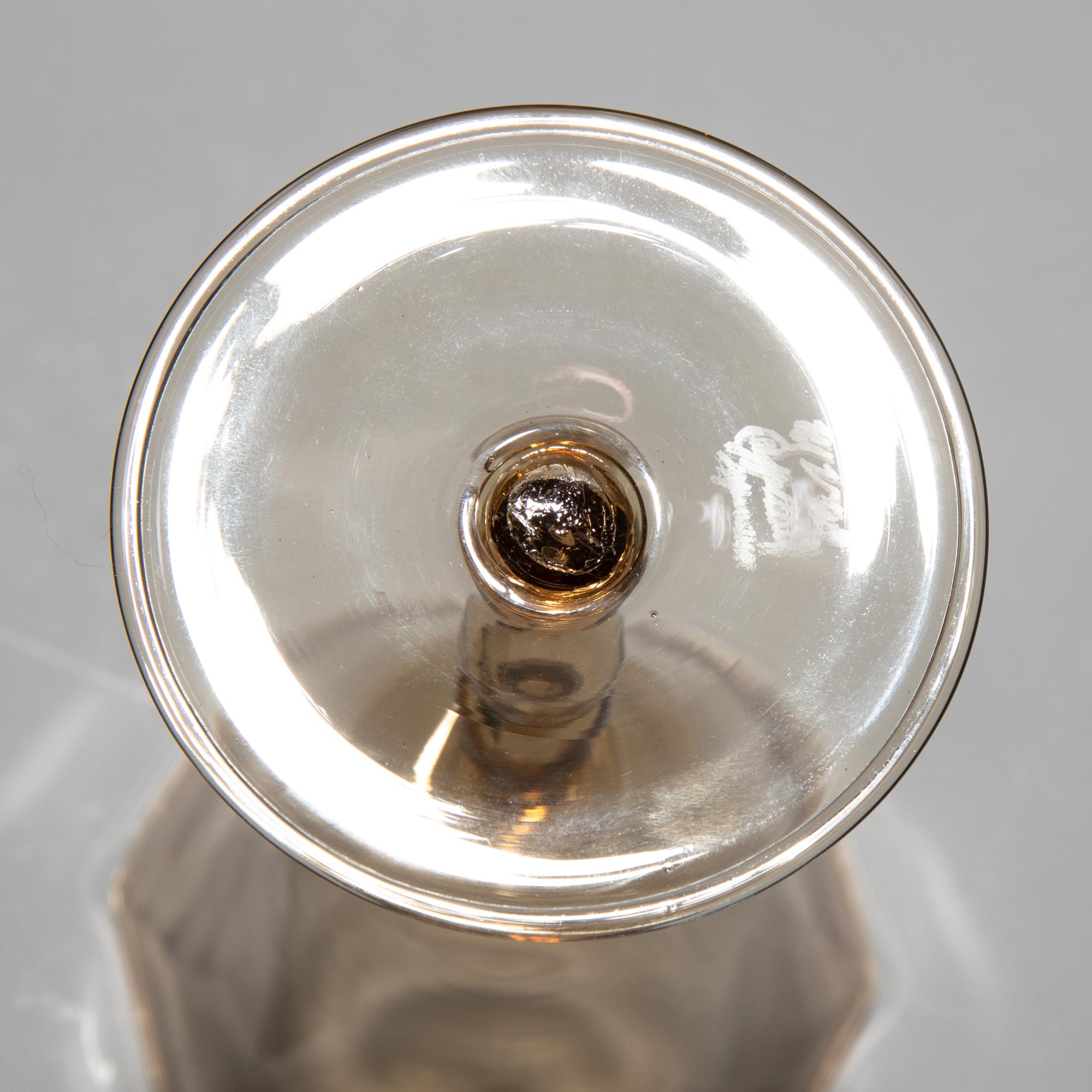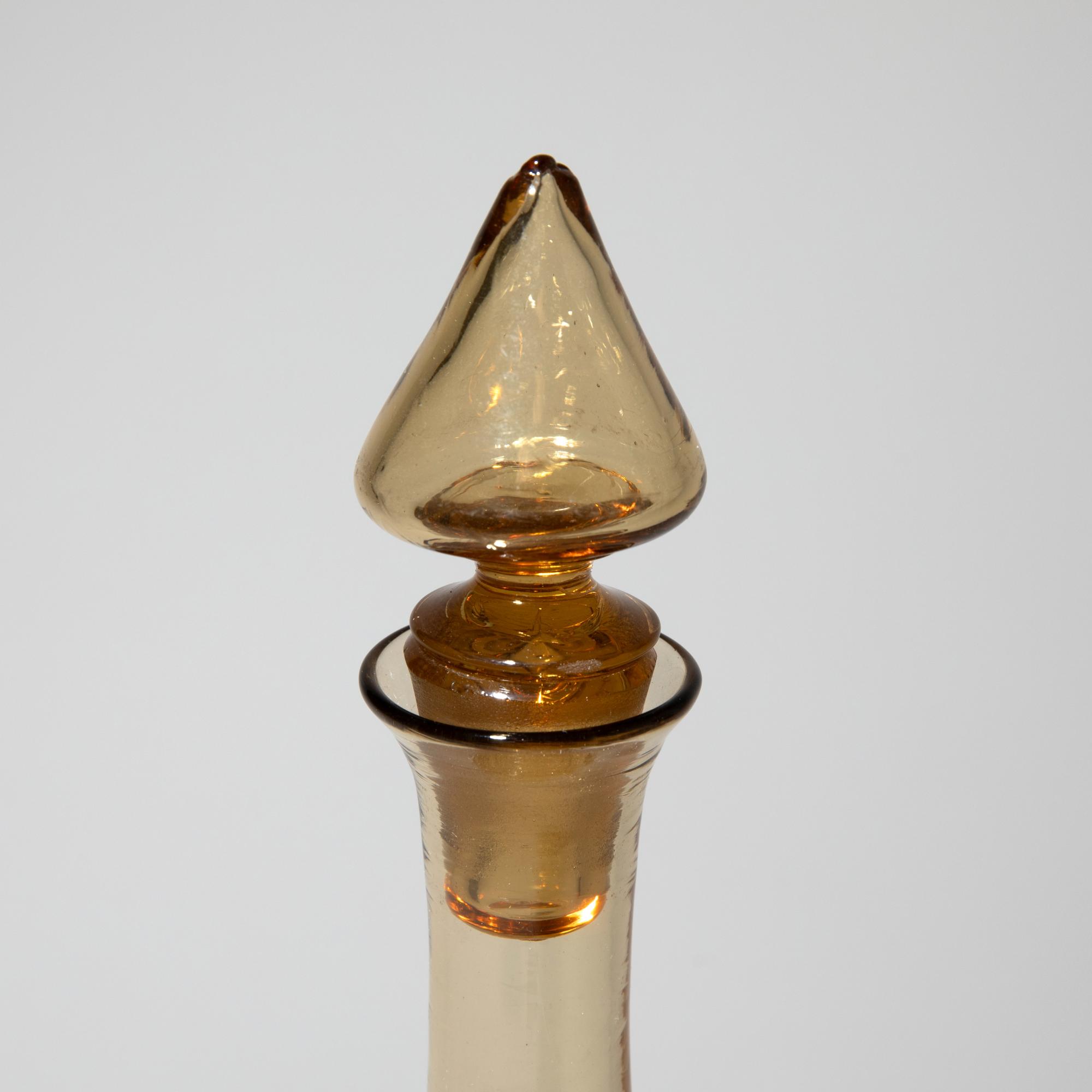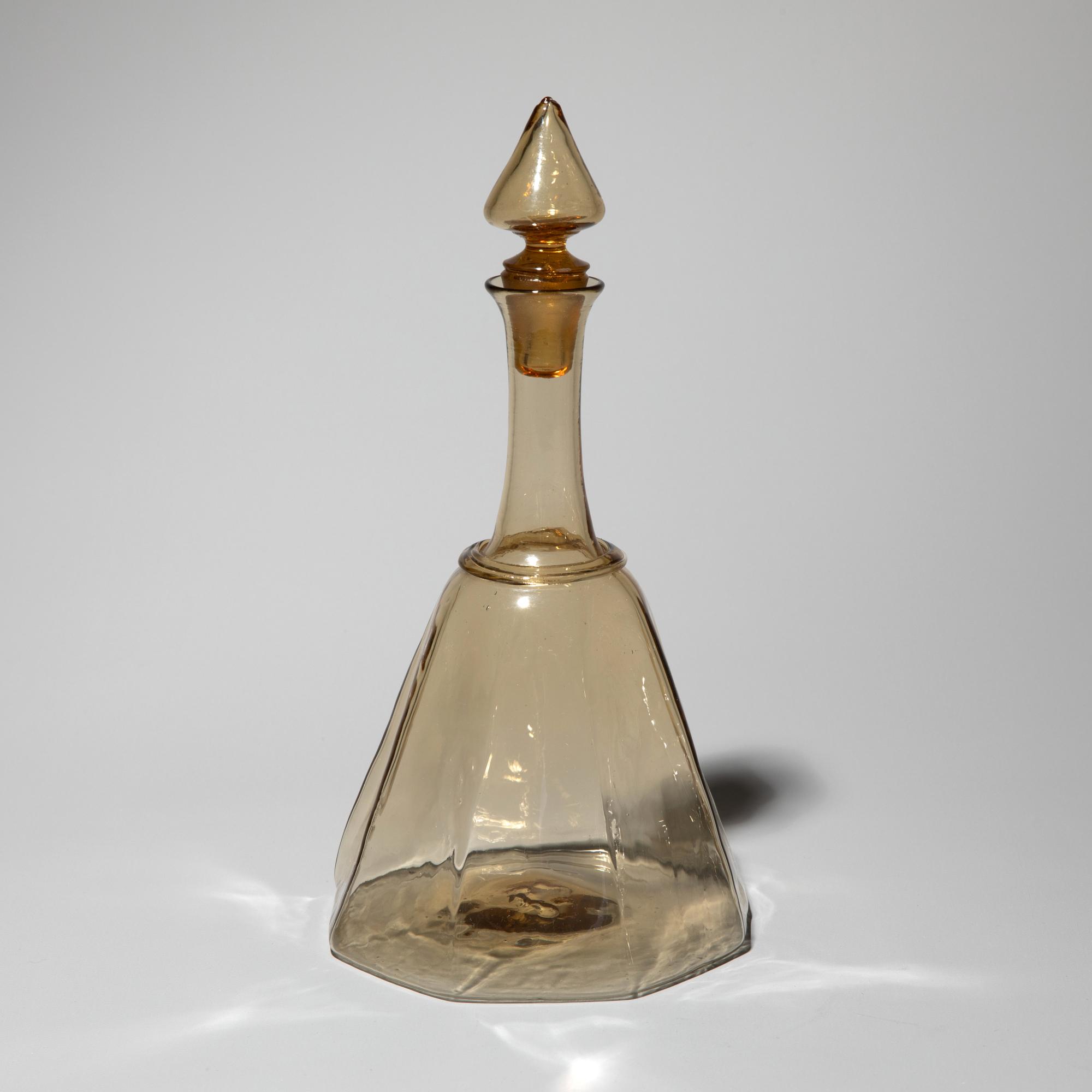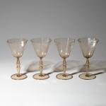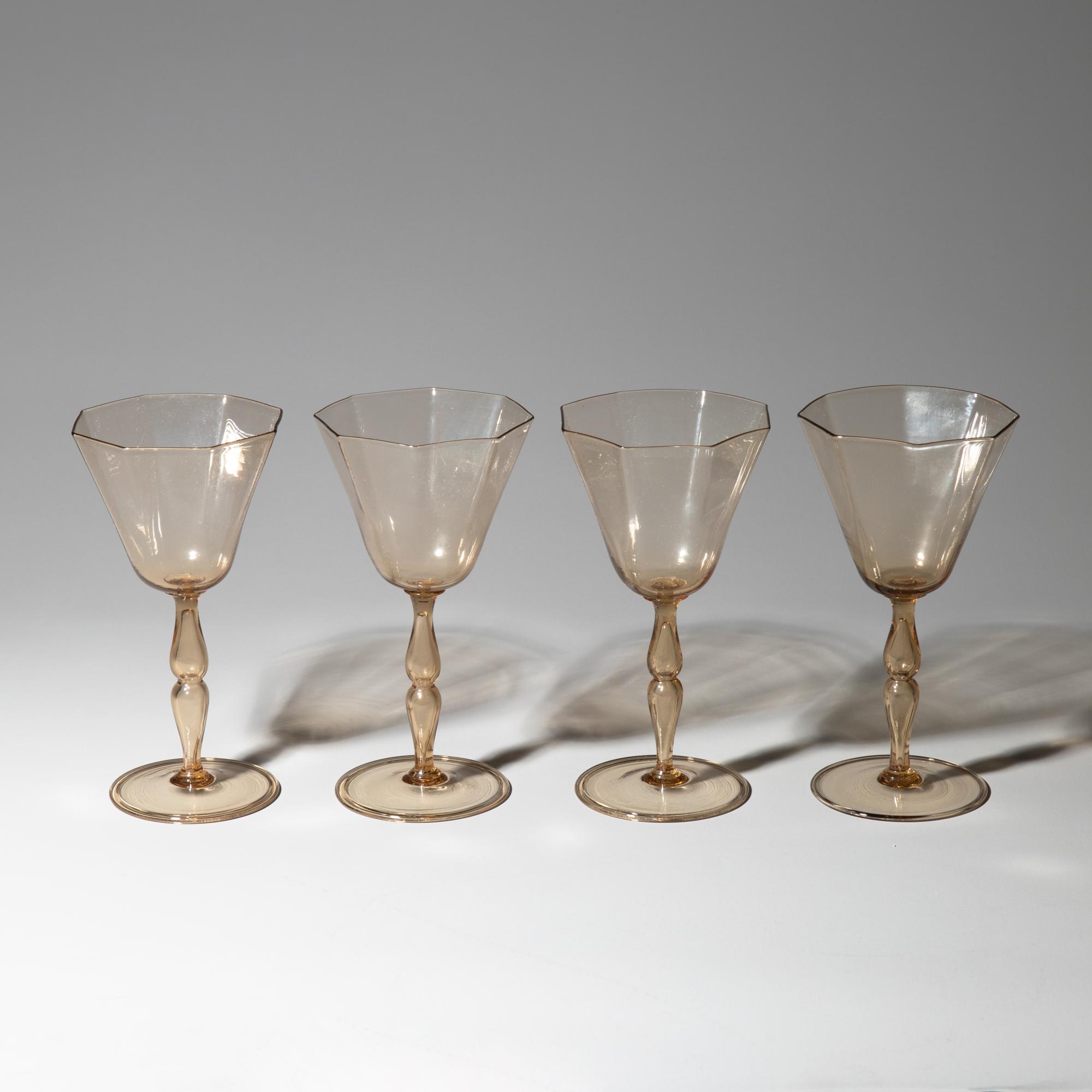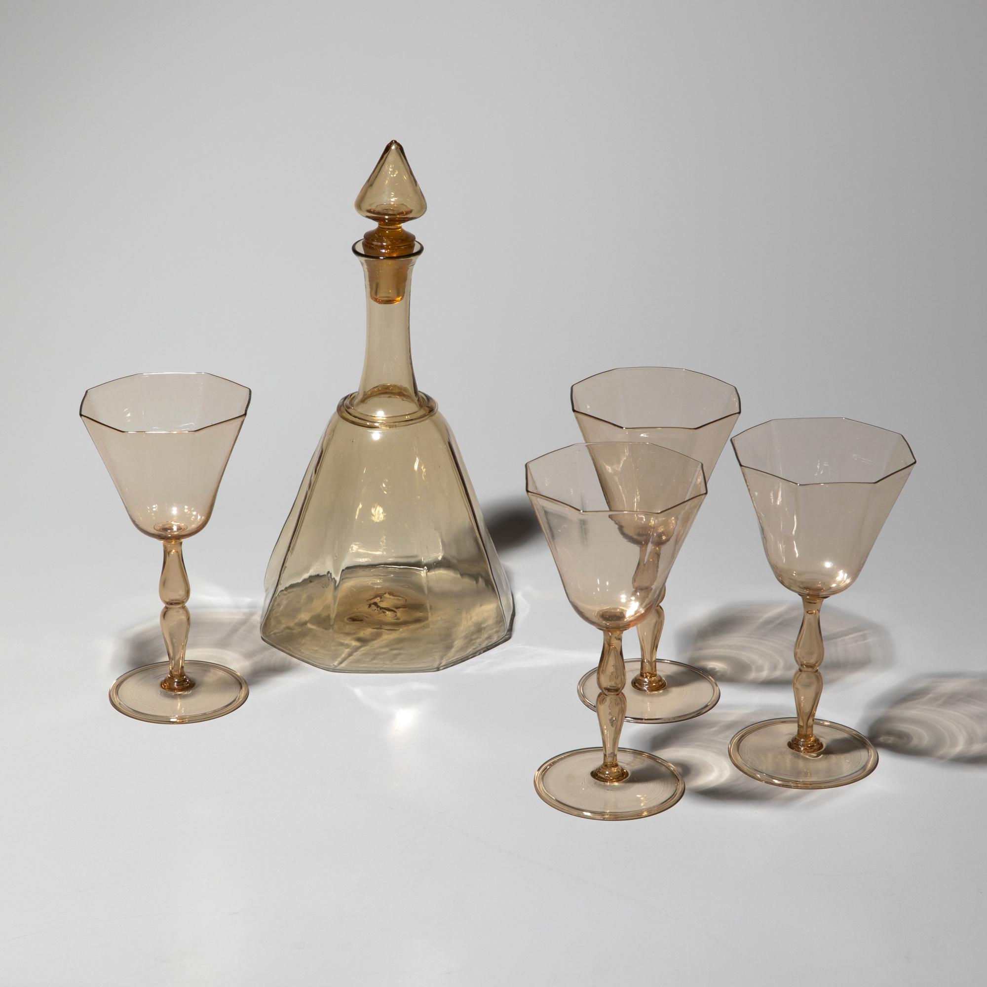 Entwurf um 1922. Ausführung Cappellin, Murano. Strohgelbes Glas. Karaffe mit Stopfen, H. 27 cm. Gläser, H. 16,5 cm. Bezeichnet: MVM Cappellin Murano (Ätzstempel).