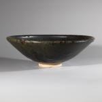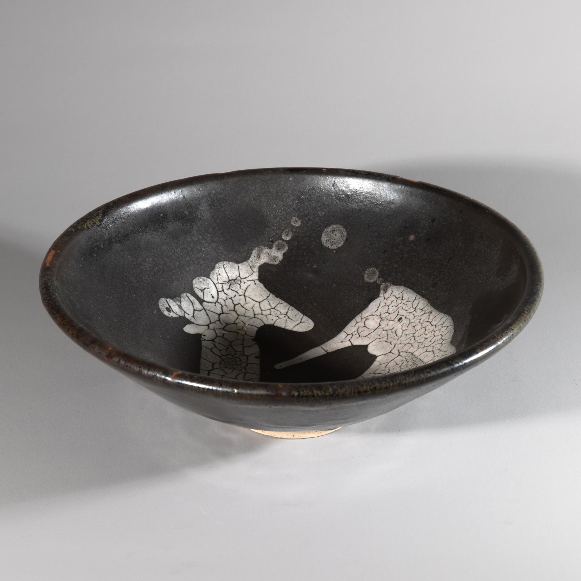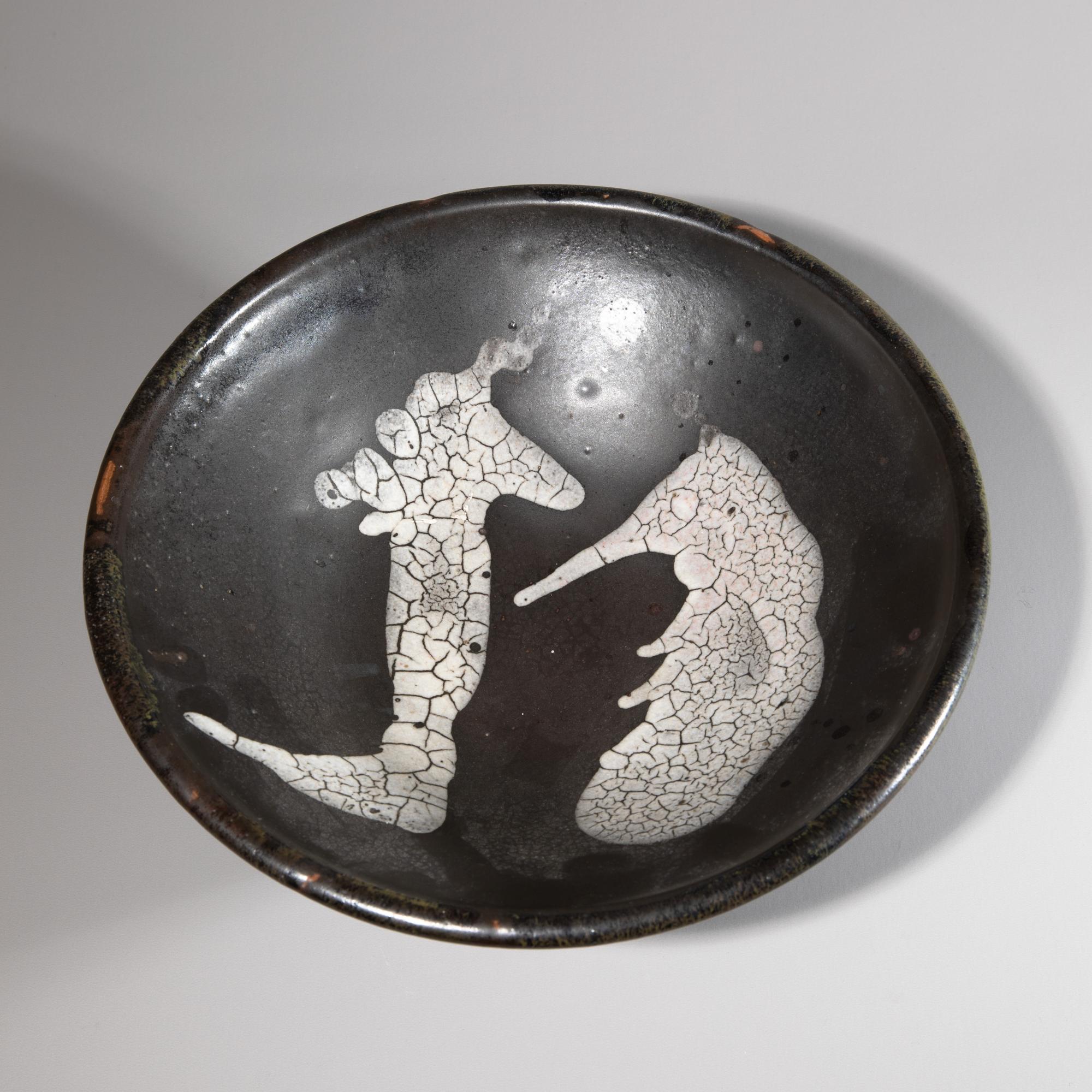 Runde Keramikschale. Glasiert in Schwarz- und Grautönen. H. 10,2 x 31,4 cm. Unterseitig bezeichnet mit Künstlermonogramm und Datierung: WP, 63 sowie weitere unleserliche Bezeichnungen.