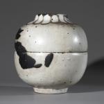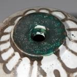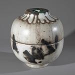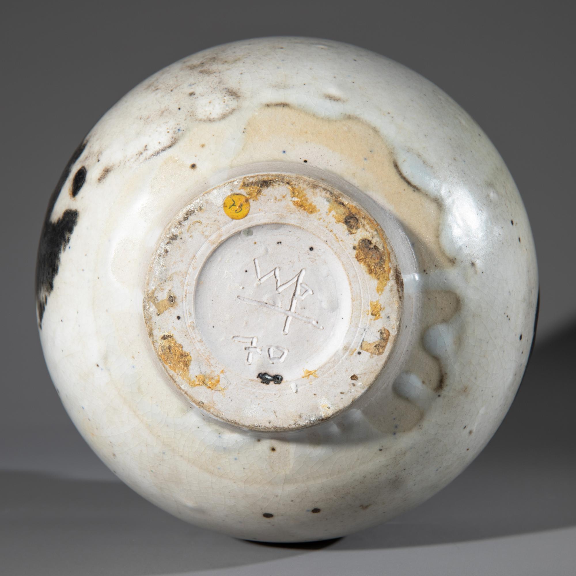Keramik, glasiert. Kugelvase mit leicht eingeschnürtem Korpus und breiter, abgeflachter Mündung. H. 18,5 cm, D. 16,5 cm. Unterseitig monogrammiert und datiert: WP, 70 (geritzt).