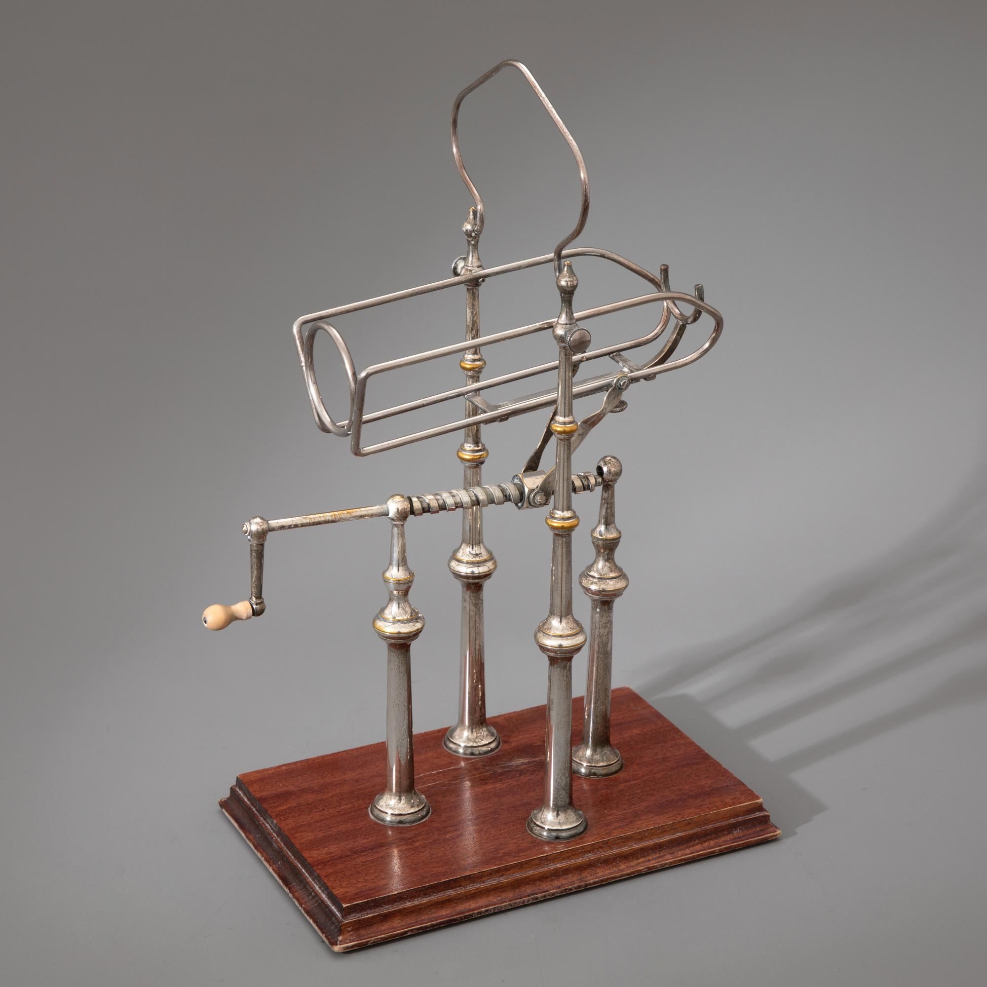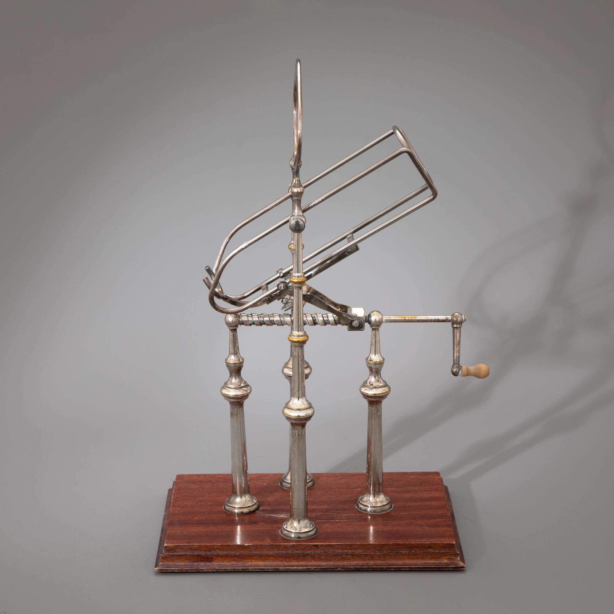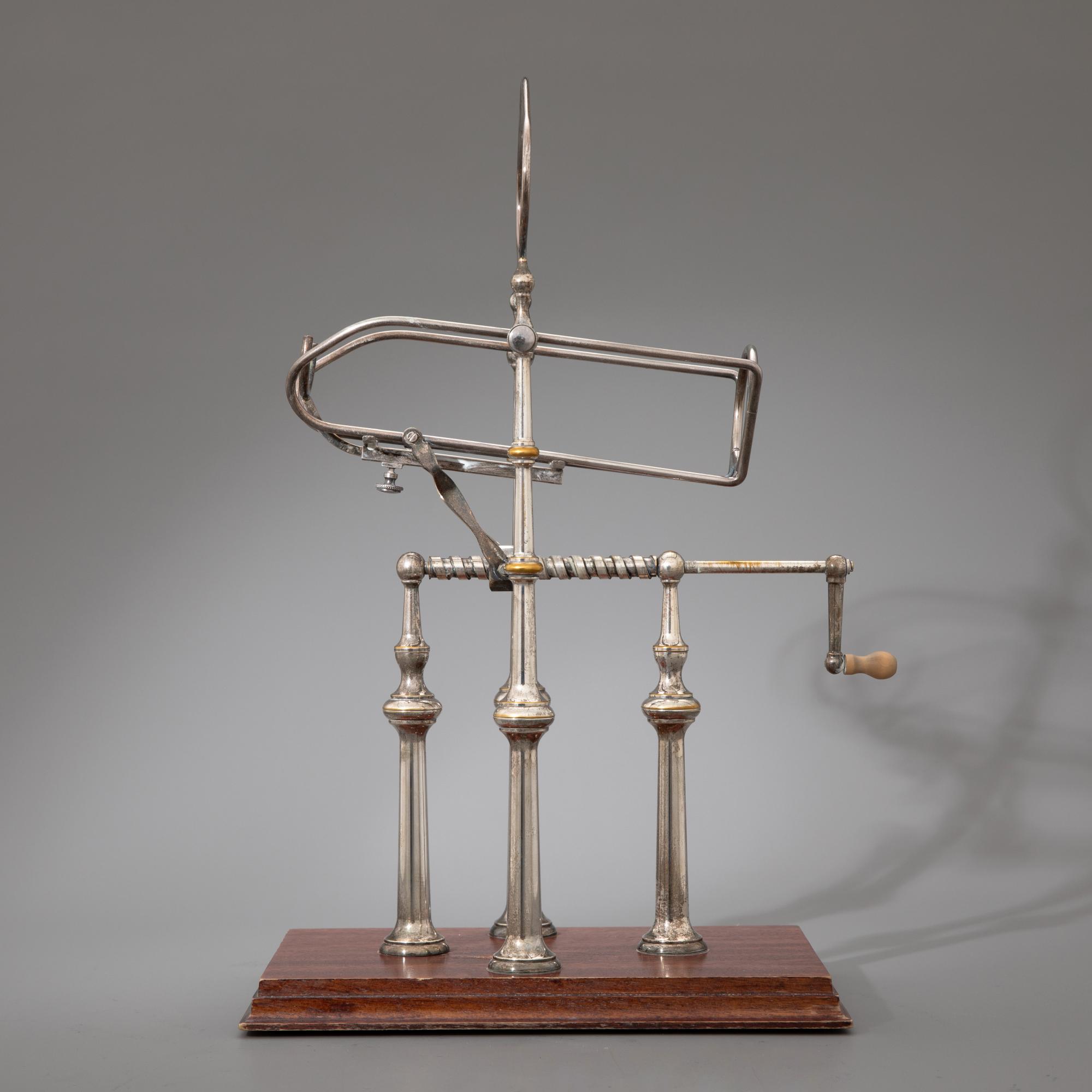 Messing, versilbert. Auf rechteckigem, profiliertem Holzstand vier balusterförmige Pfeiler, die eine Weinwiege mit einem Gewindemechanismus tragen, an dessen