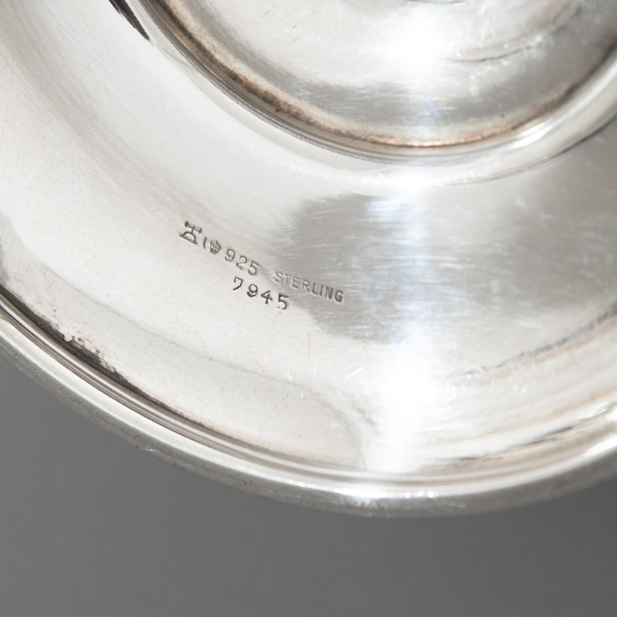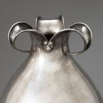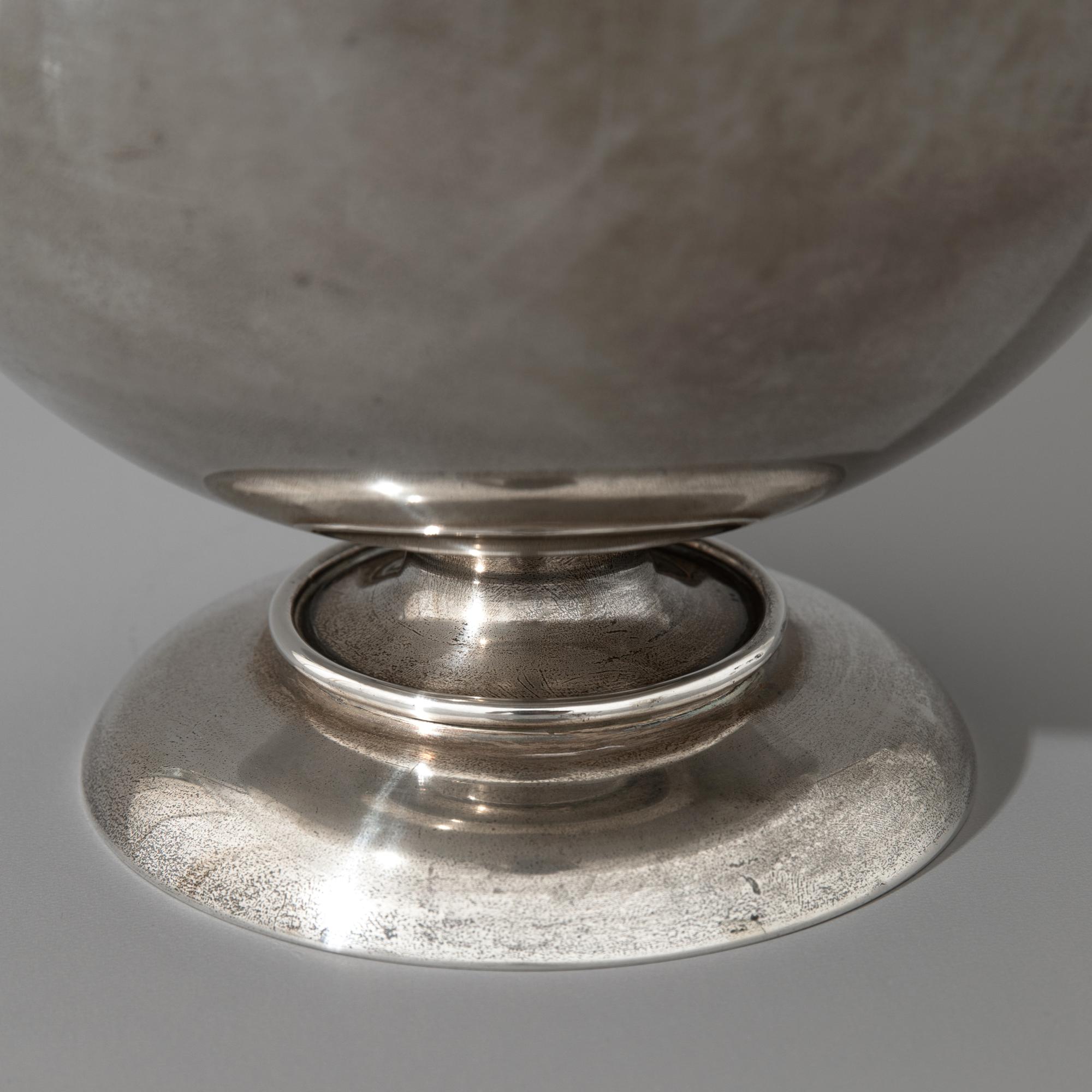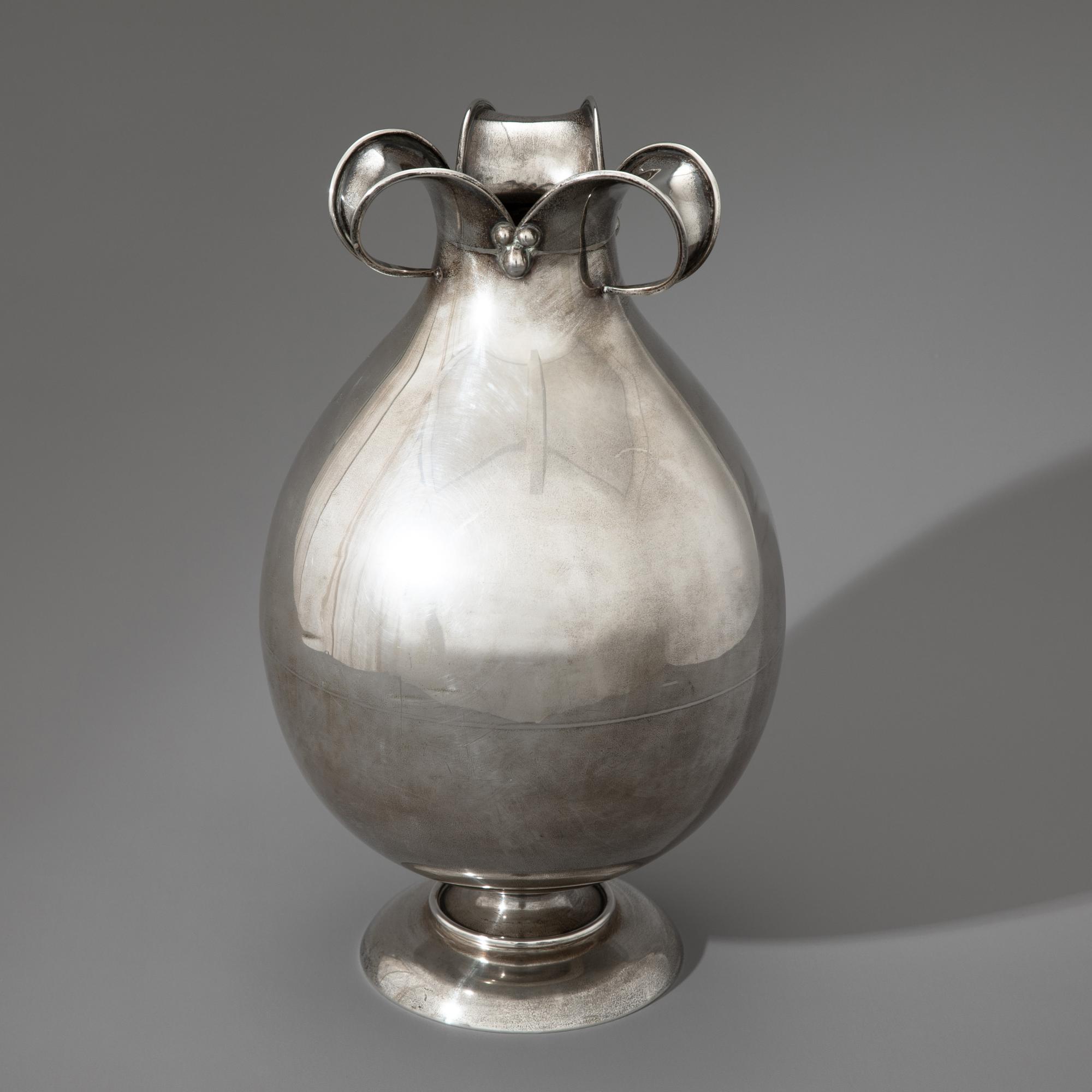 Sterlingsilber. Bauchige Vase mit rundem Stand und dreifach nach außen gebogener Mündung. H. 34,5 cm, D. 15 cm. Gewicht 1.531 g. Unterseitig bezeichnet mit Herstellermarke von M. H. Wilkens & Söhne, Bremen, Halbmond und Krone, Sterlingsilber und Modellnummer 7945.