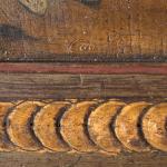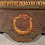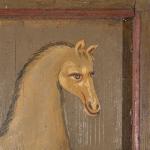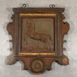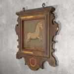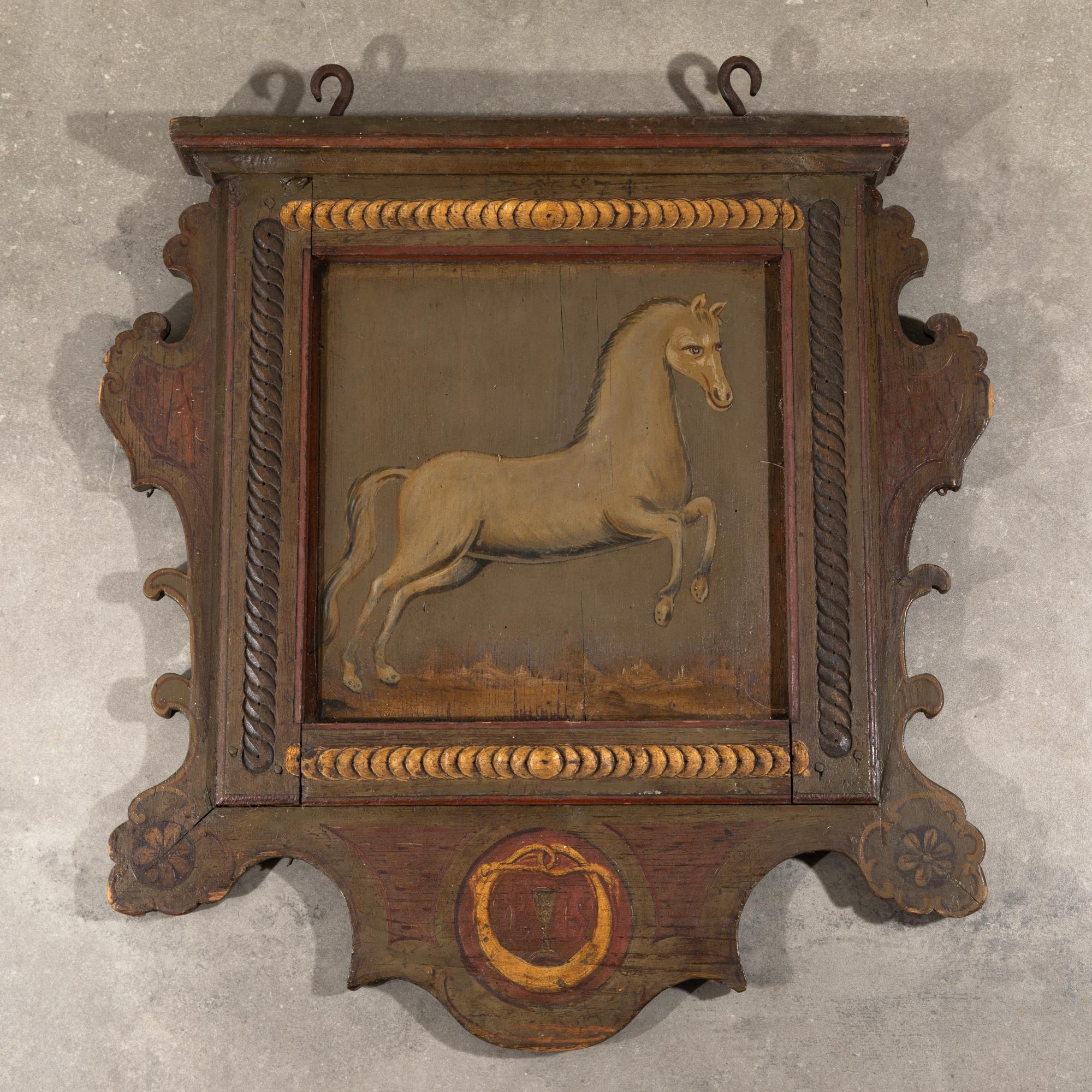 Holz, farbig bemalt. Kartuschenförmiges, quadratisches Schild mit einer Rahmung aus Voluten. Der gerade obere Abschluss mit zwei Eisenösen. Beidseitig dekoriert mit je einem springenden Pferd in Landschaft. Reste einer Datierung. 83 x 76 cm.