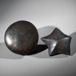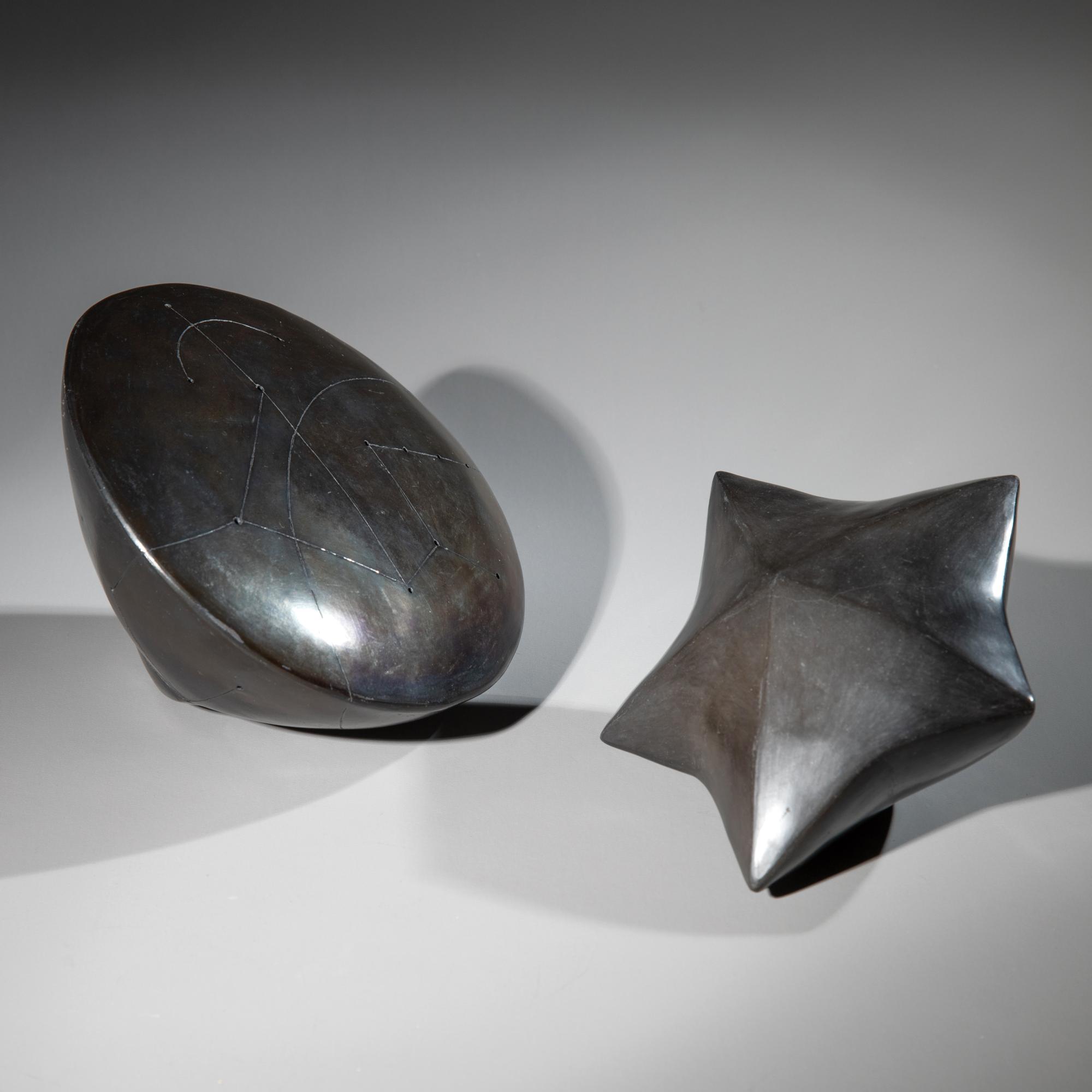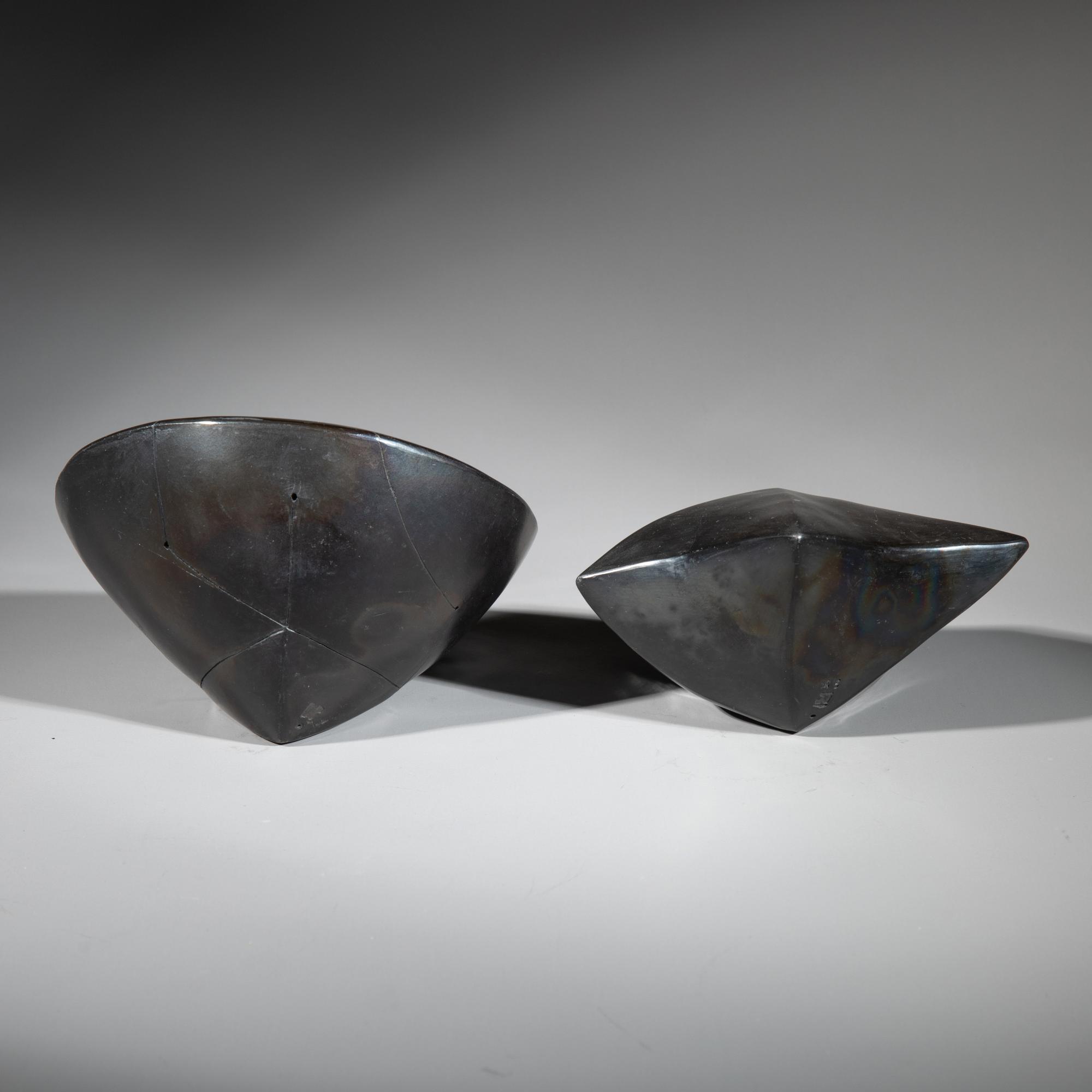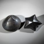 Keramik. Skulpturale Elemente, teilweise poliert, graviert und perforiert. 10,7 x 15 x 10,5 cm / 9,5 x 12 x 8 cm. Jeweils bezeichnet mit Werkstattmarke.