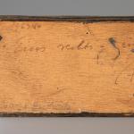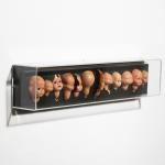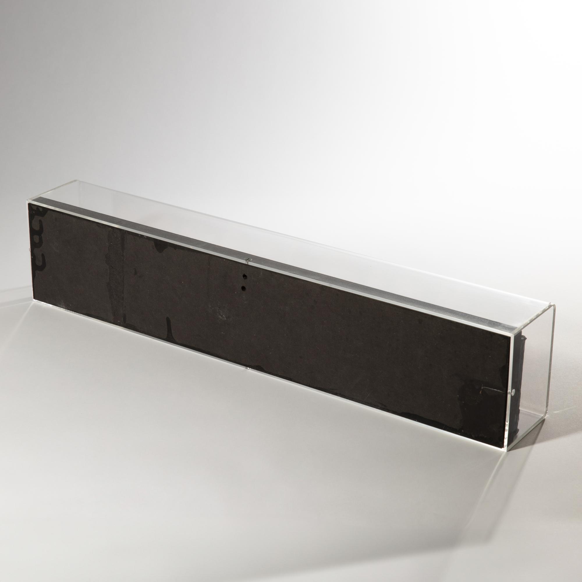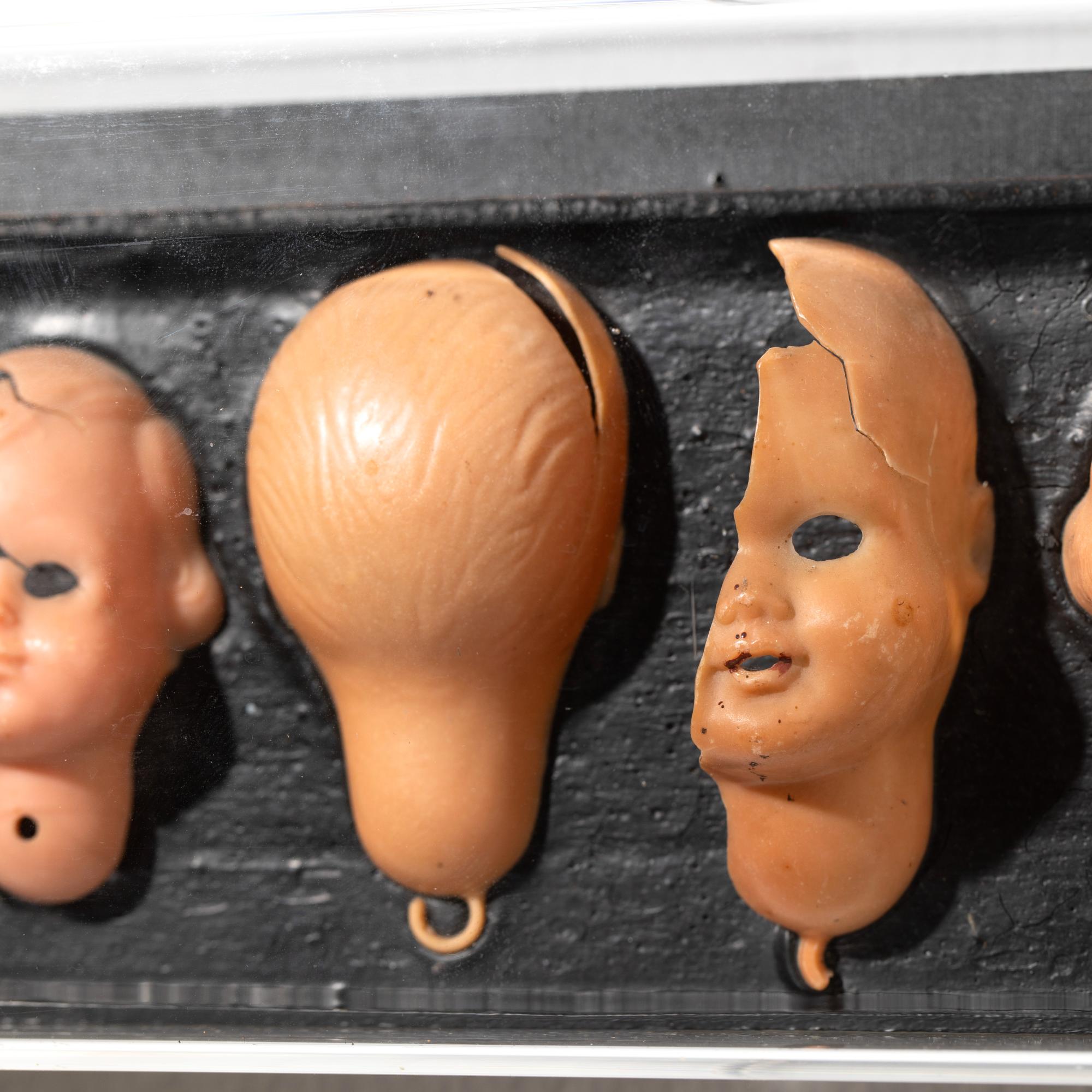 Kollagierte Plastikpuppenköpfe auf geschwärztem Holz. 9,5 x 56 x 5 cm. Verso datiert, bezeichnet und signiert: 1963/64 / 'Eins rechts - eins links' / A. Luther.