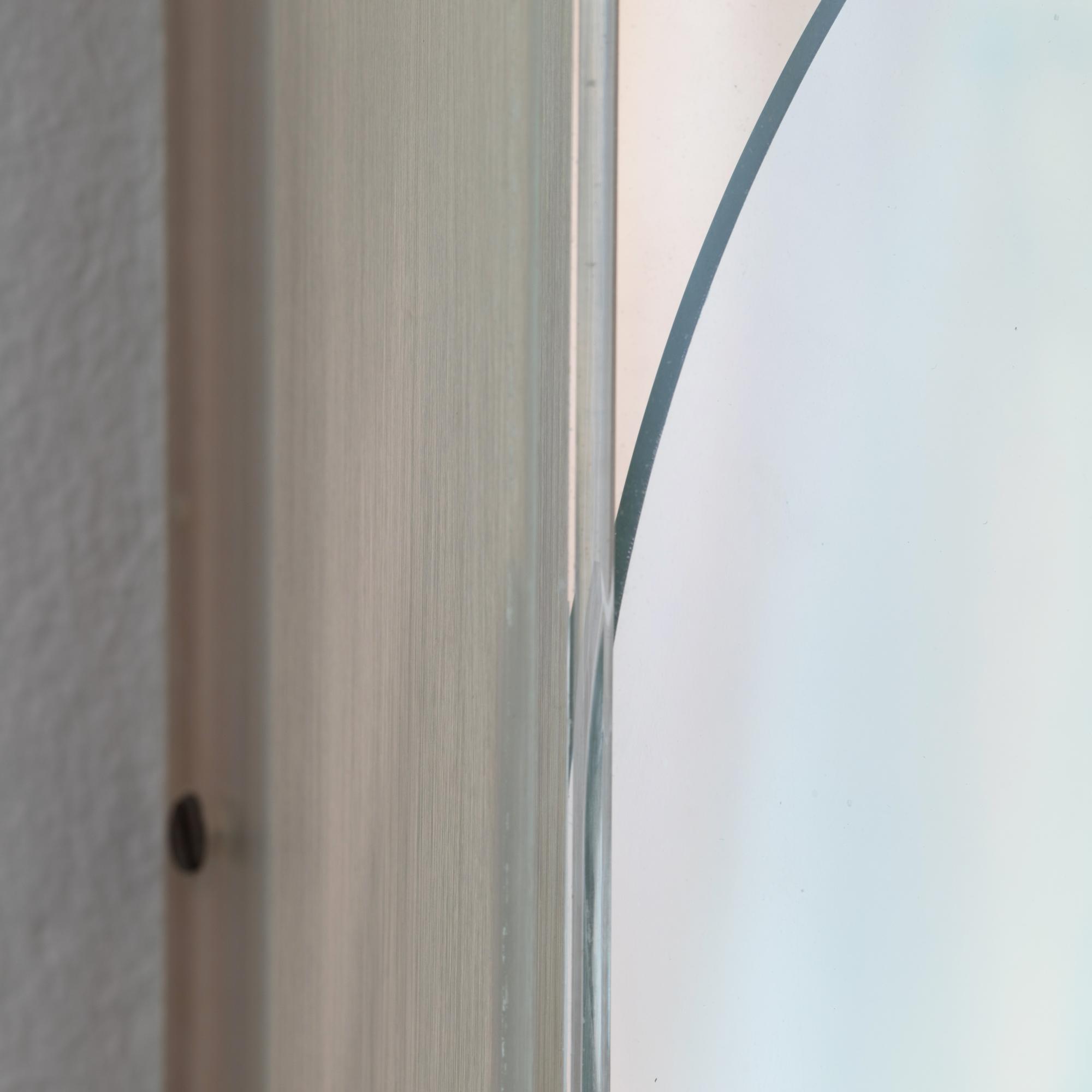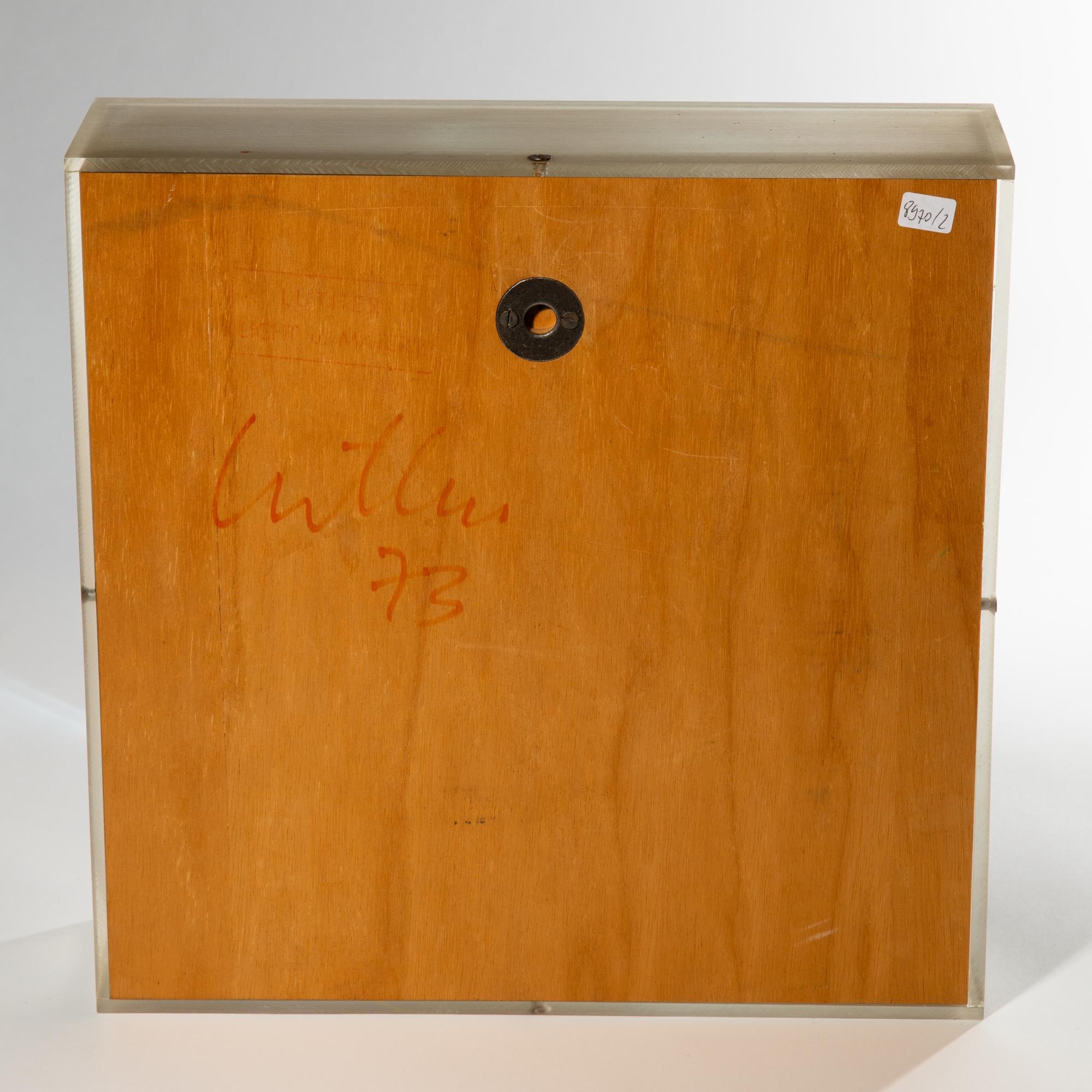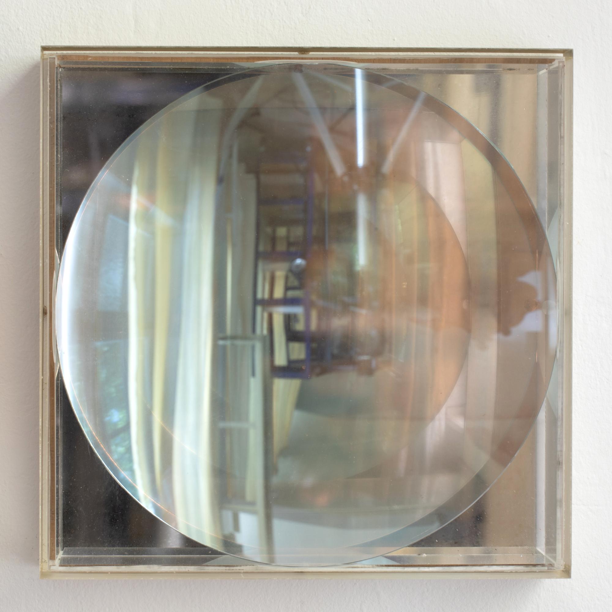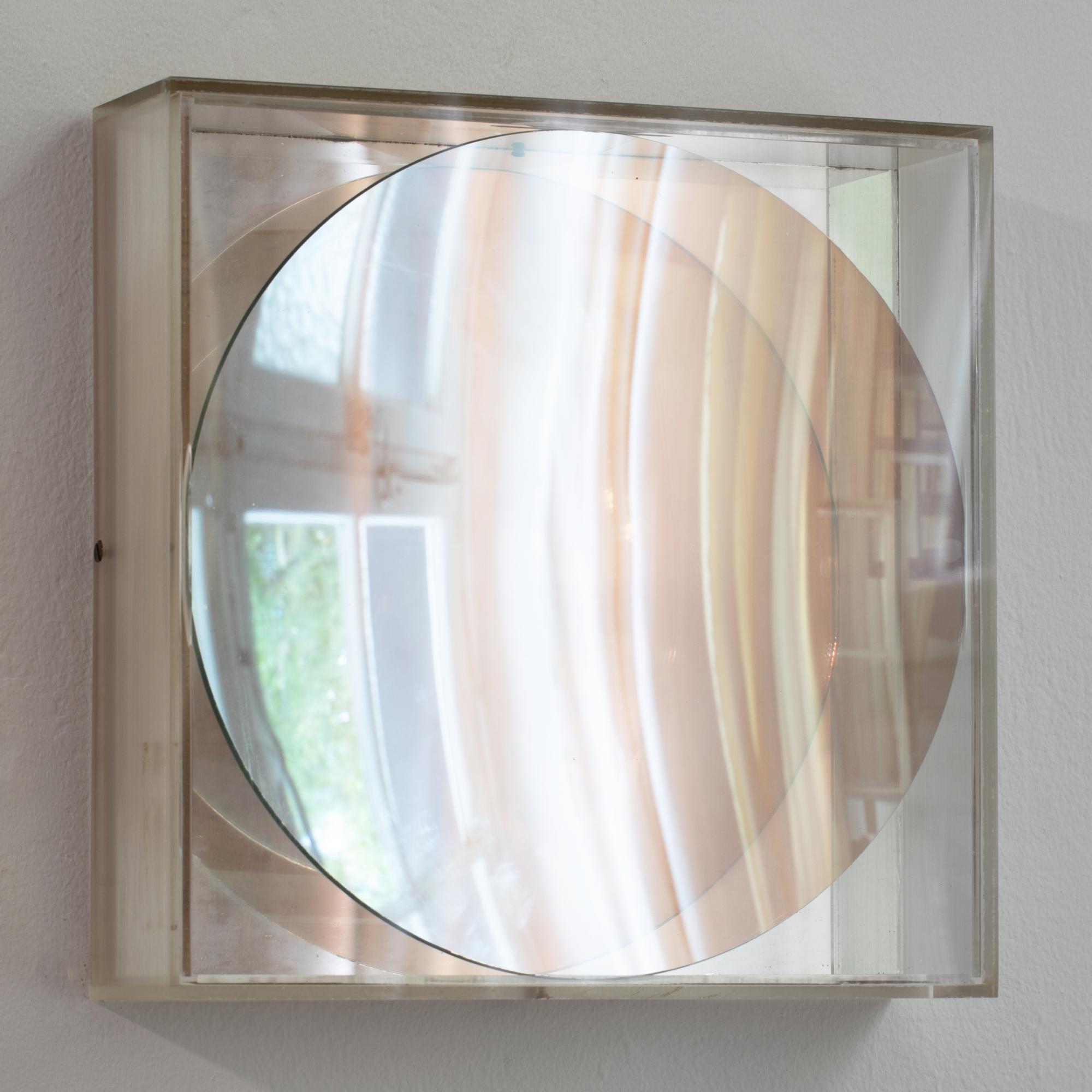 Plexiglaskastenrahmen mit runder, konkaver Linse vor quadratischem Spiegel auf Sperrholz. 31,5 x 31,5 x 8,2 cm. Verso mit Filzstift signiert und datiert : Luther 73.