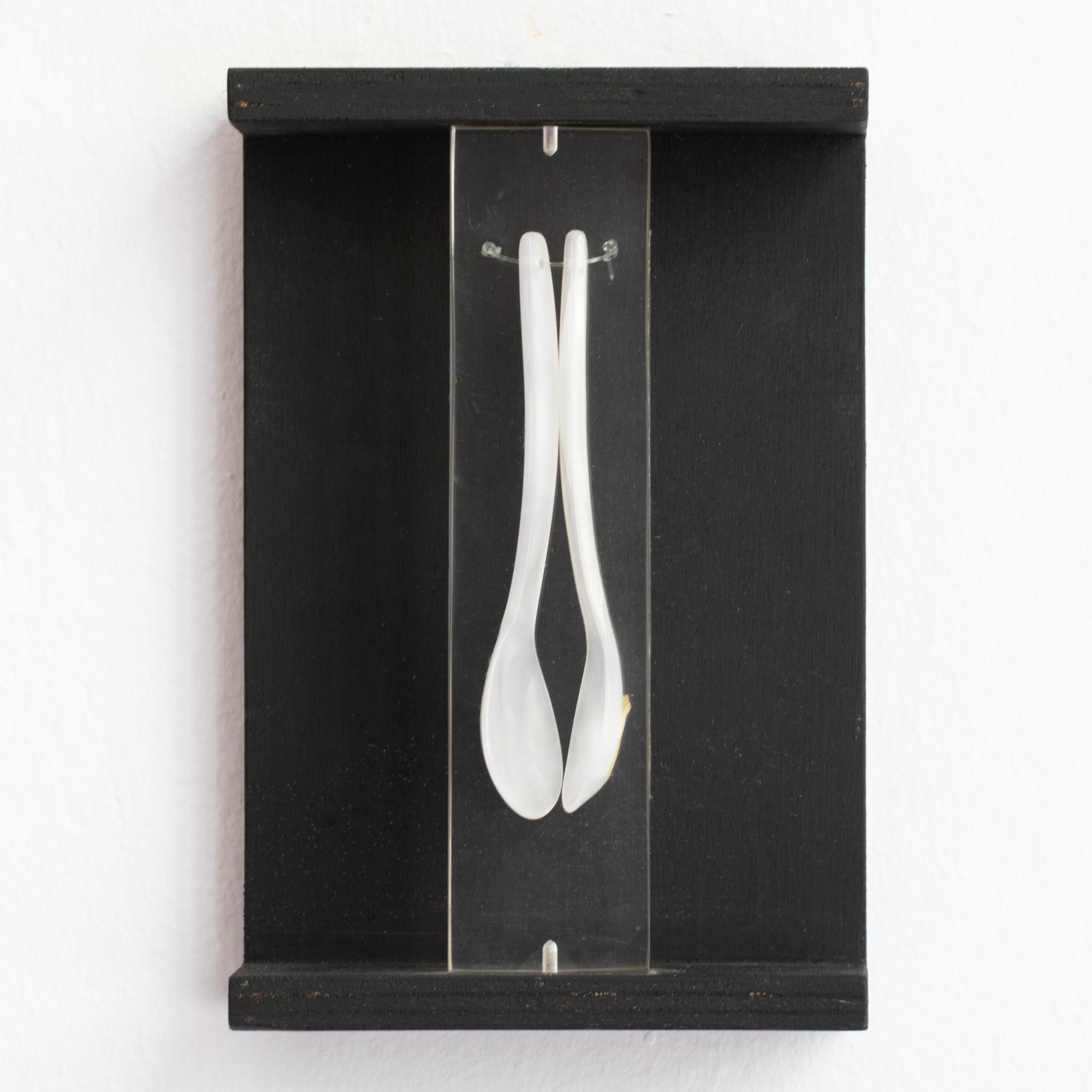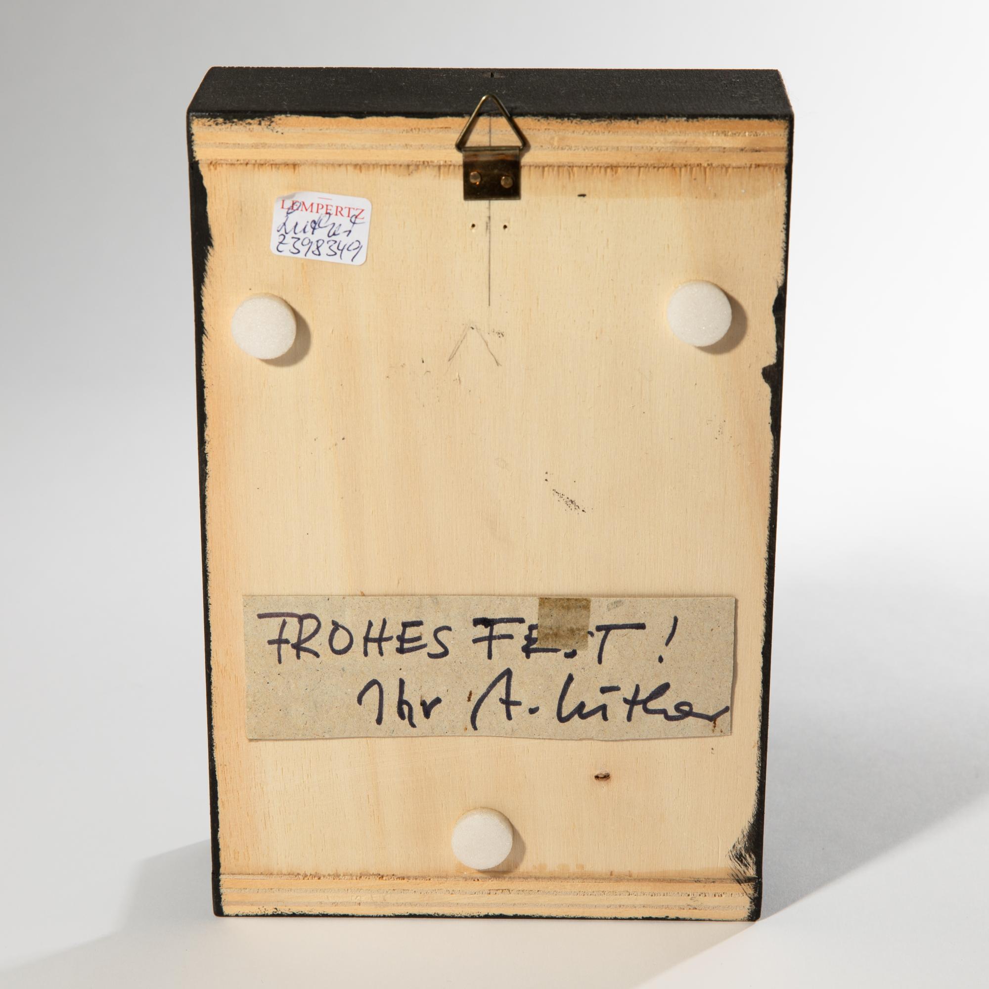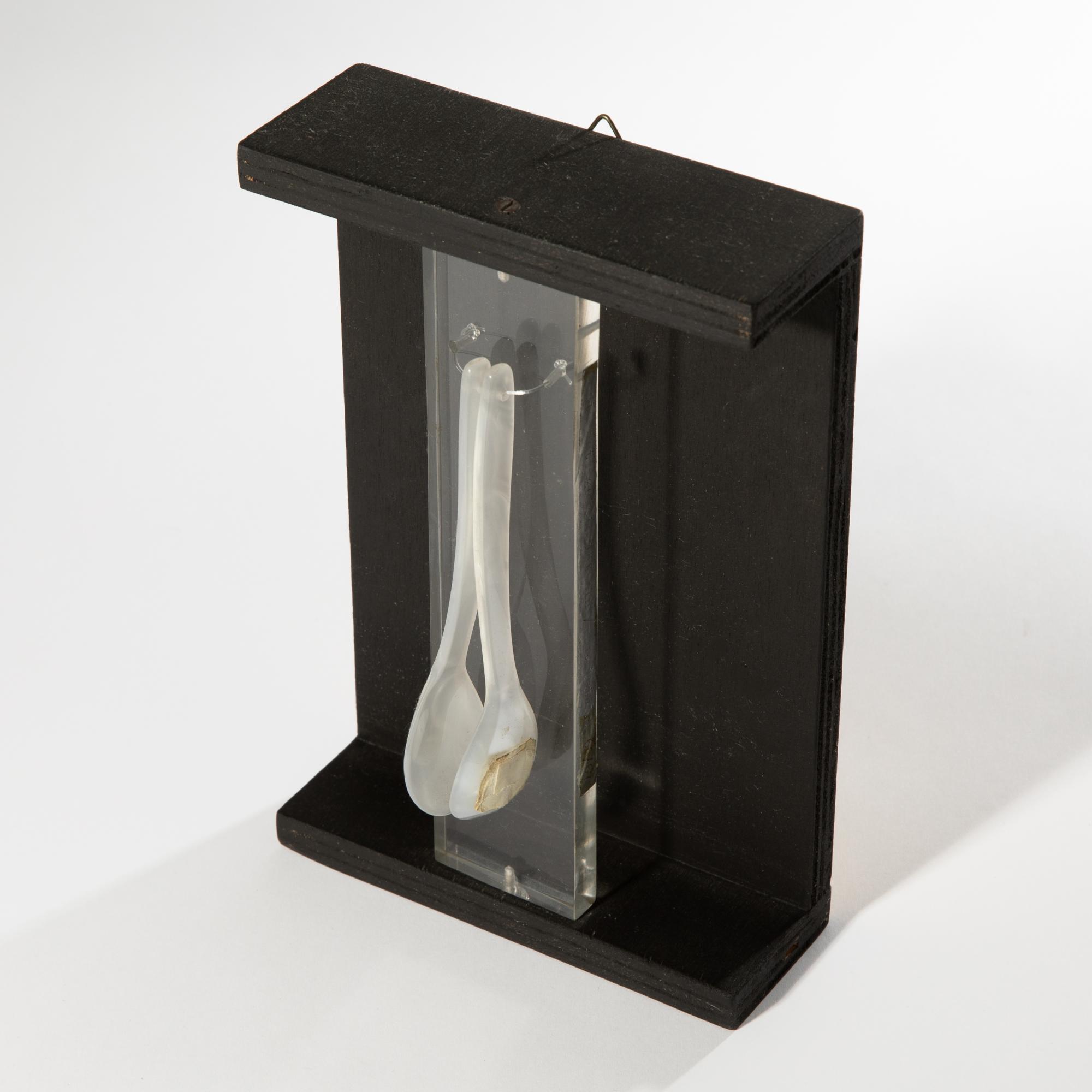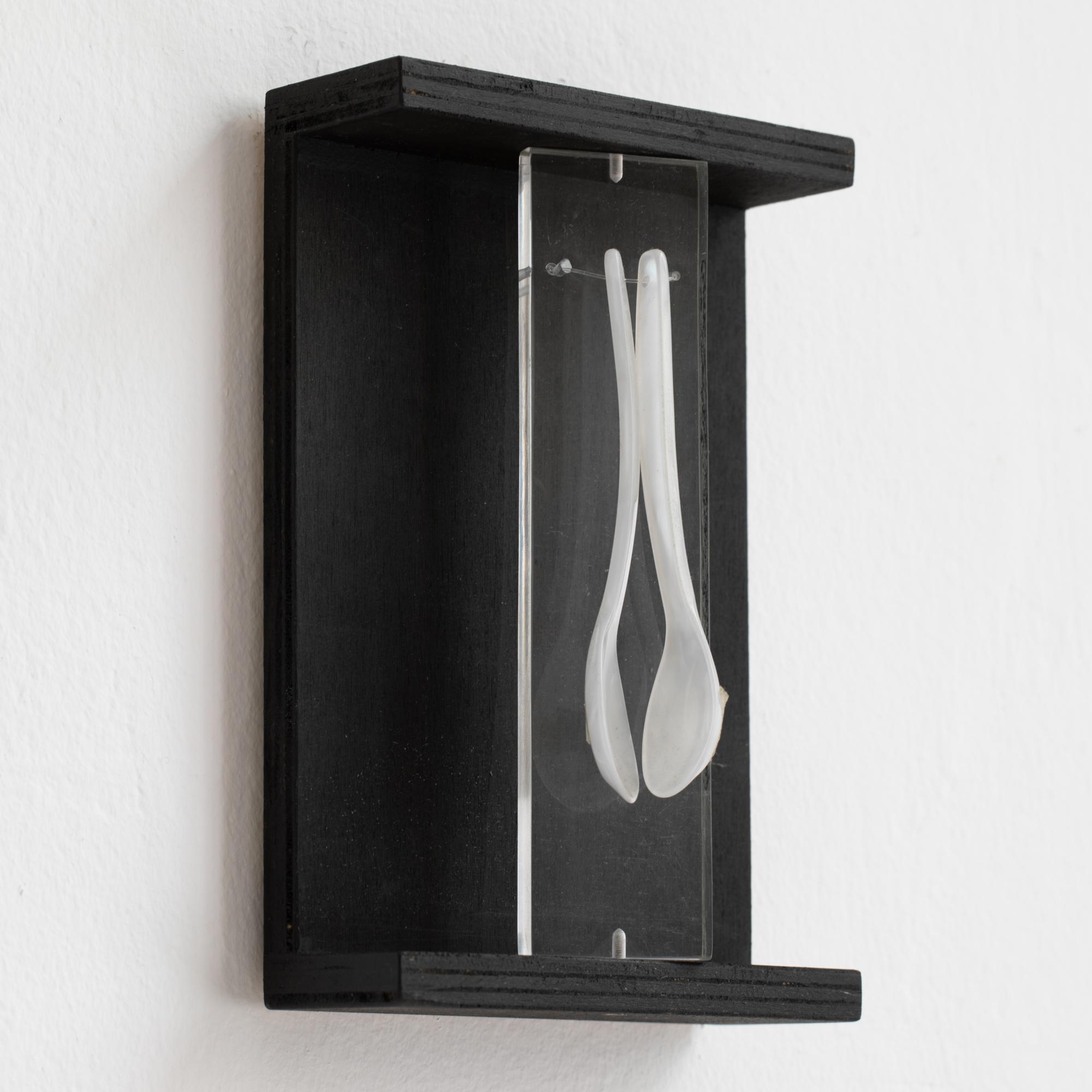 Wandobjekt. Mischtechnik bestehend aus schwarz gebeiztem Holz, Plexiglas und zwei Plastiklöffeln. 21 x 14 x 6 cm. Verso auf Karton bezeichnet: FROHES FEST! ihr A. Luther.