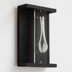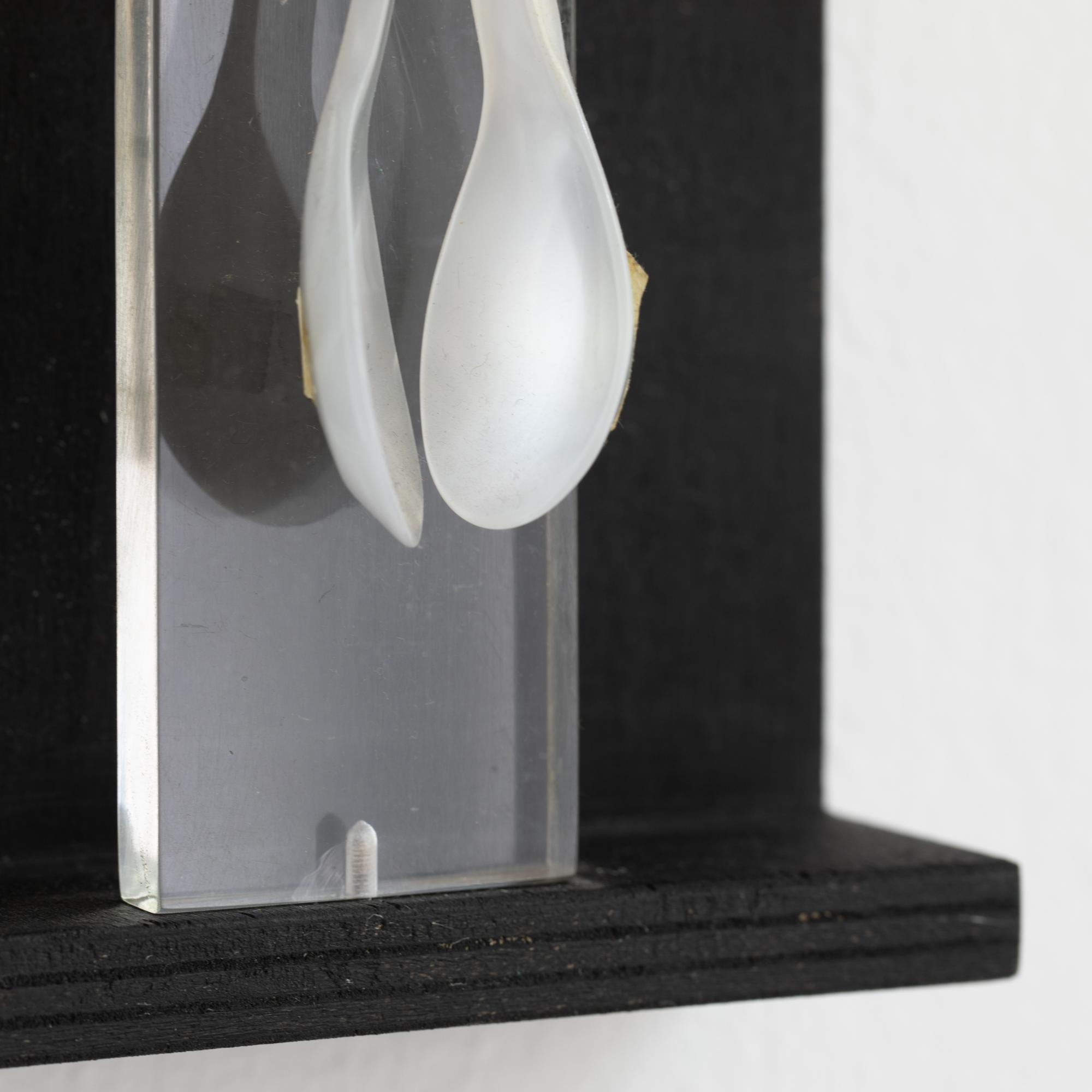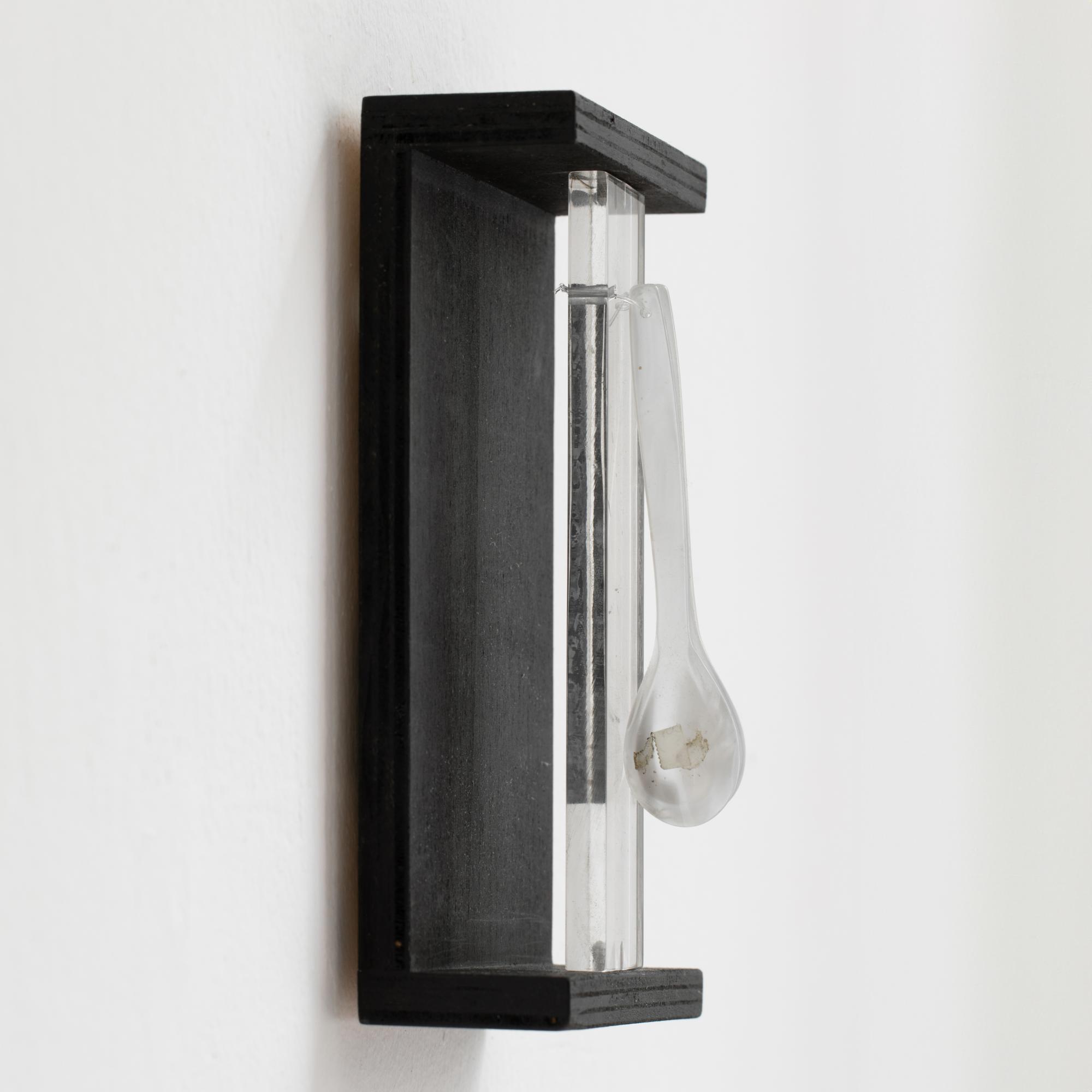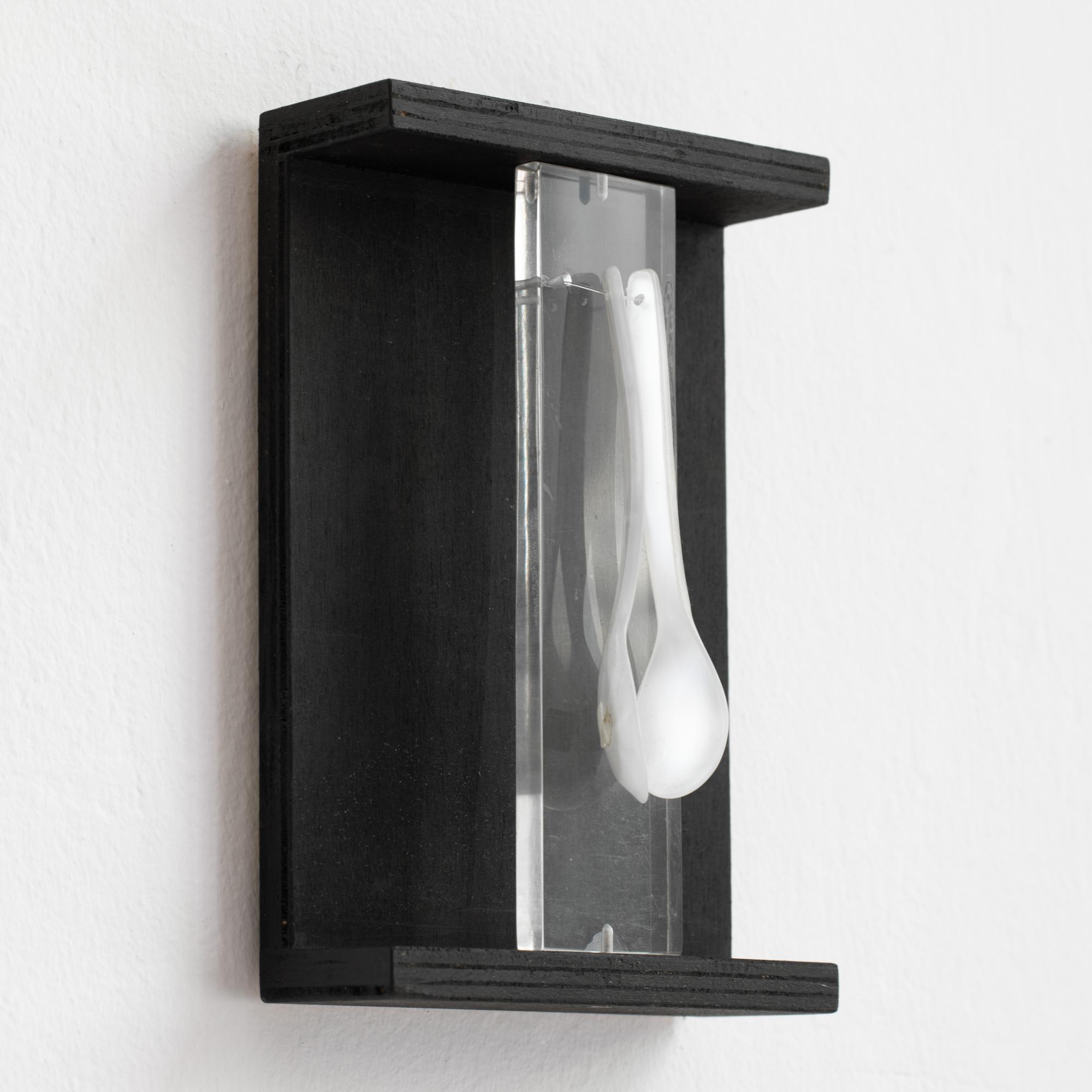 Wandobjekt. Mischtechnik bestehend aus schwarz gebeiztem Holz, Plexiglas und zwei Plastiklöffeln. 21 x 14 x 6 cm. Verso auf Karton bezeichnet: FROHES FEST! ihr A. Luther.
