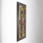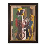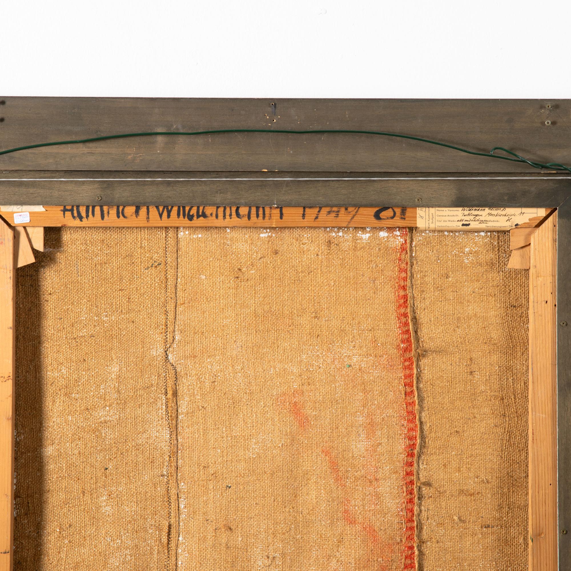 Öl auf Leinwand. 103 x 72 cm. Recto oben recht monogrammiert: hw 49. Verso auf Klebeetikett bezeichnet: Württ. Kunstverein / Stuttgart / Wildemann Heinrich / Tuttlingen Messkircherstr. 11 / akt mit erhobenem arm / Öl.