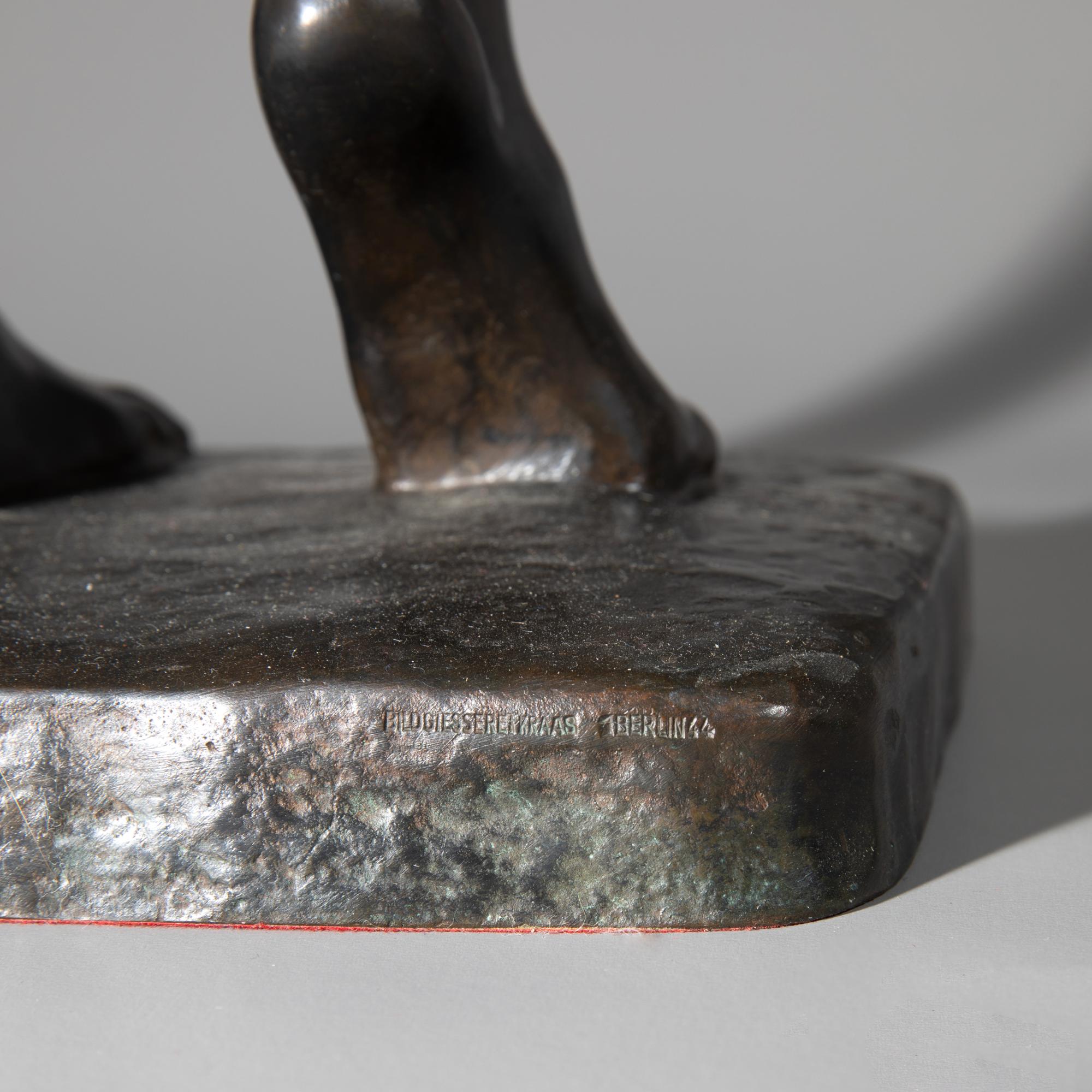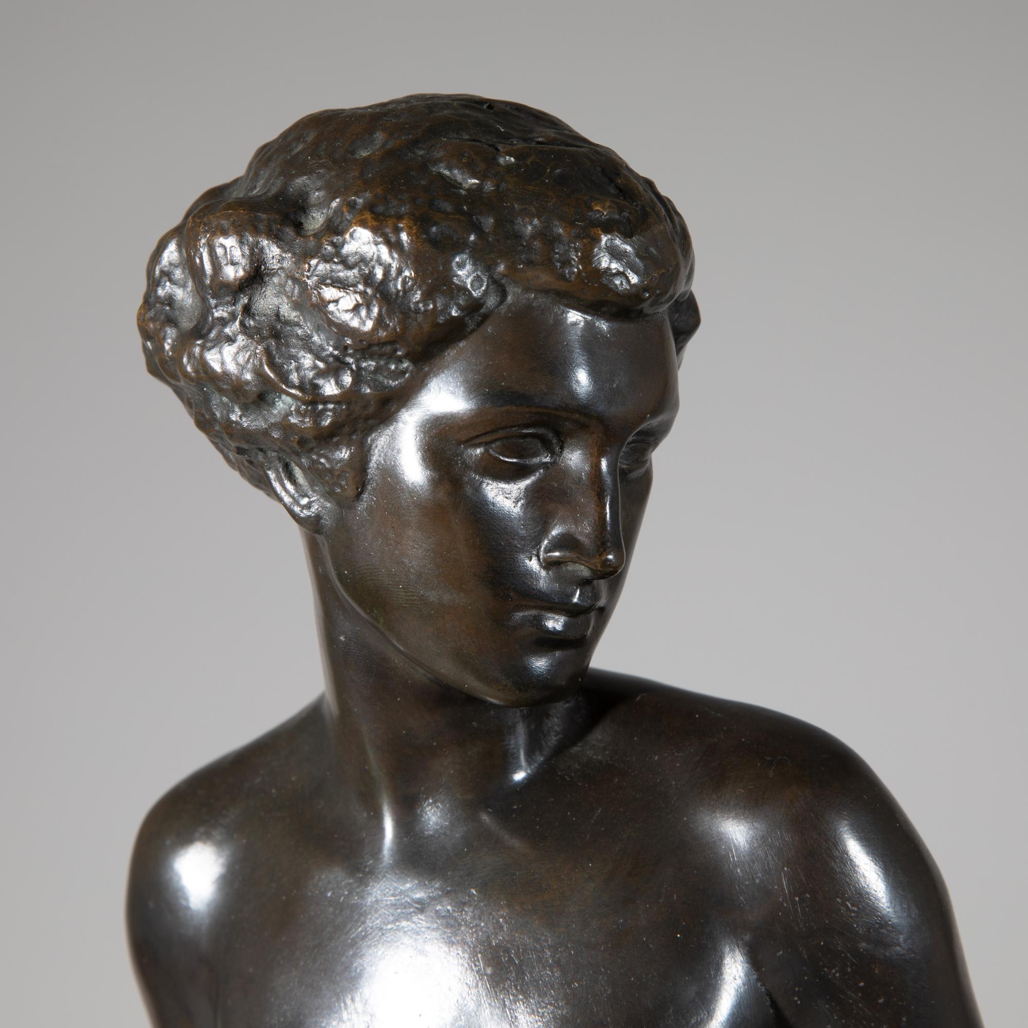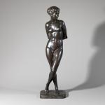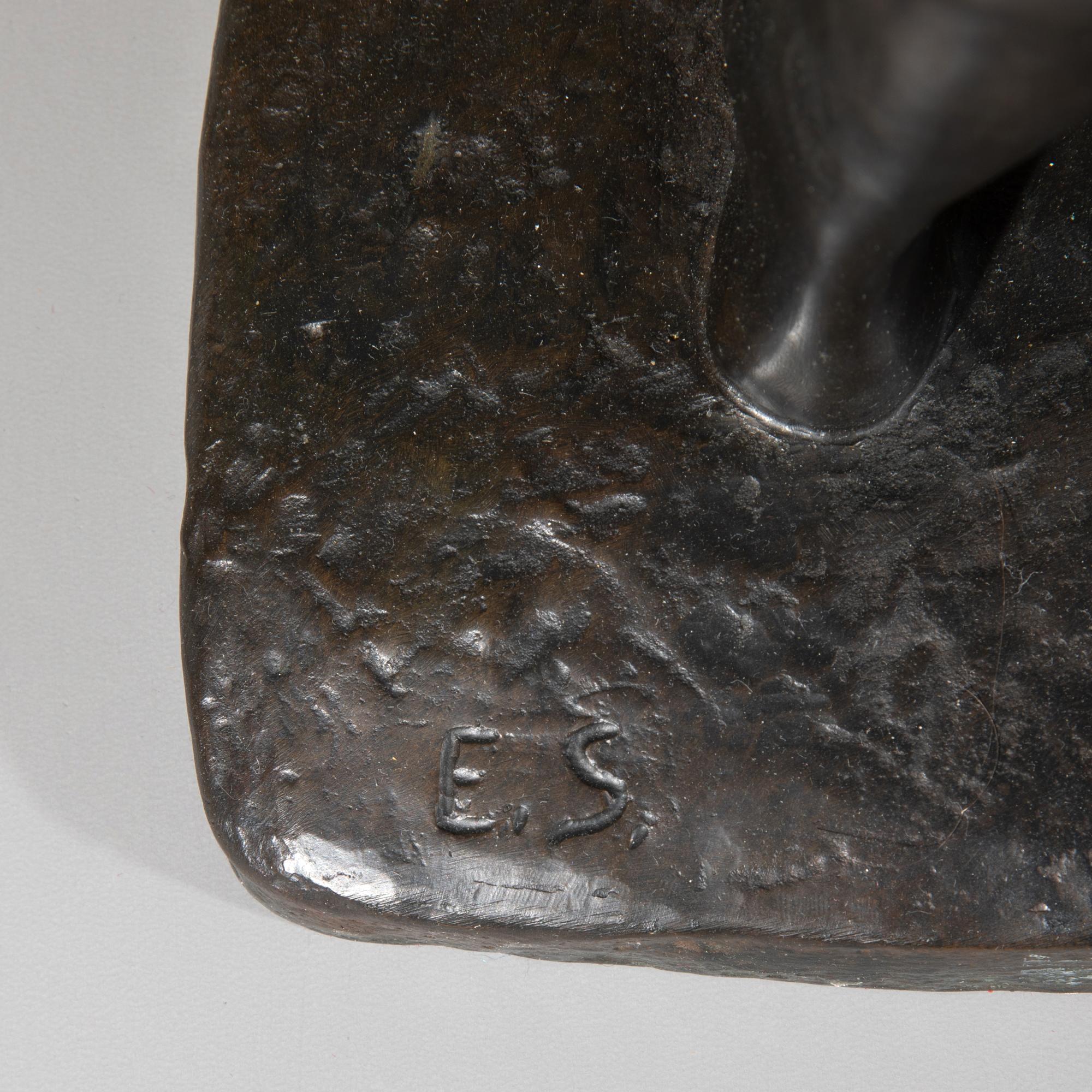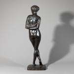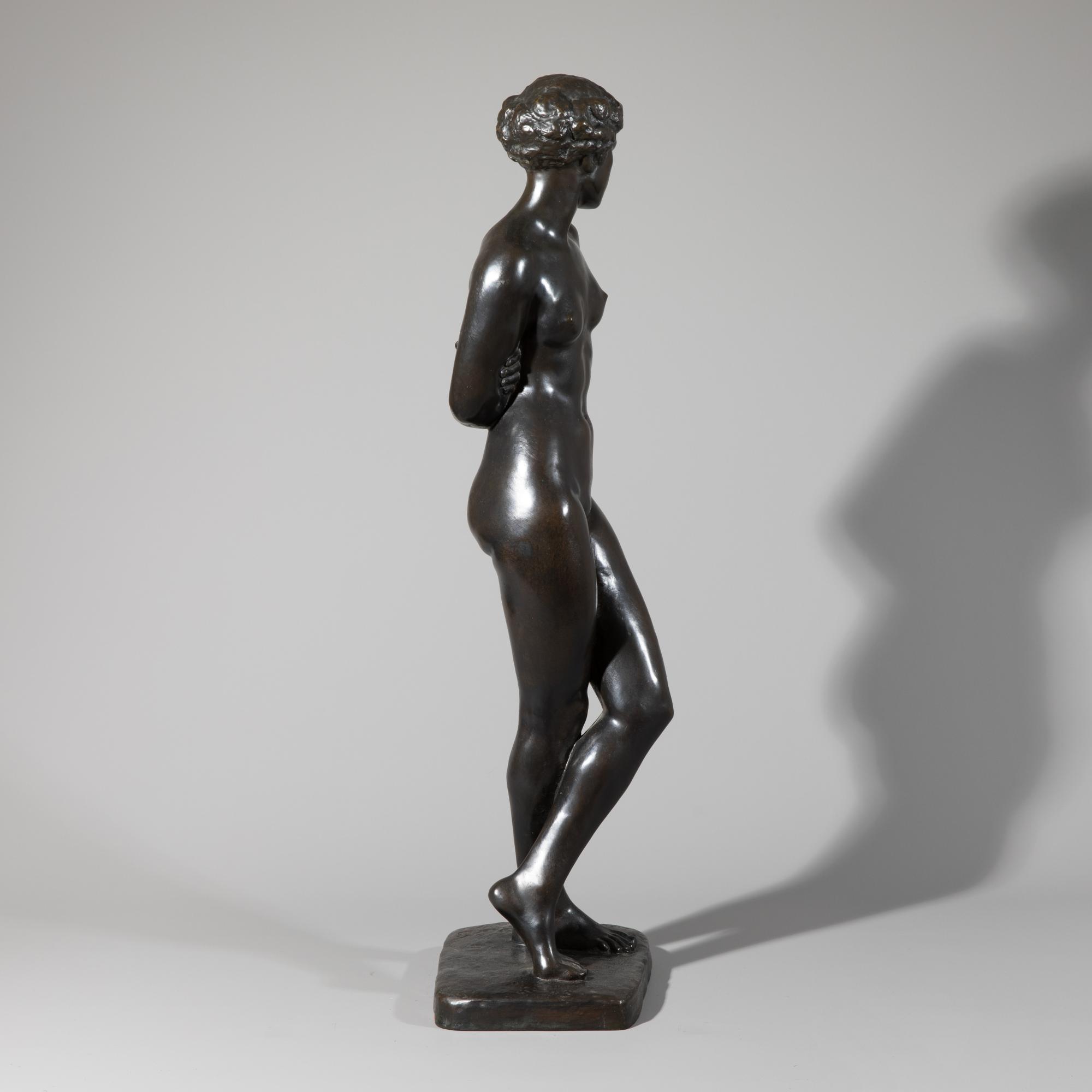 Bronze, schwarz patiniert. Unbekleidete Frau mit hinter dem Rücken verschränkten Armen. Sockel bez.: E. S. (geritzt). Rückseitig auf der Sockelkante Gießerstempel: Bildgiesserei Kraas 1 Berlin 44. H. 72,5 cm.