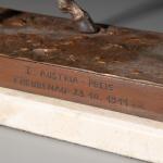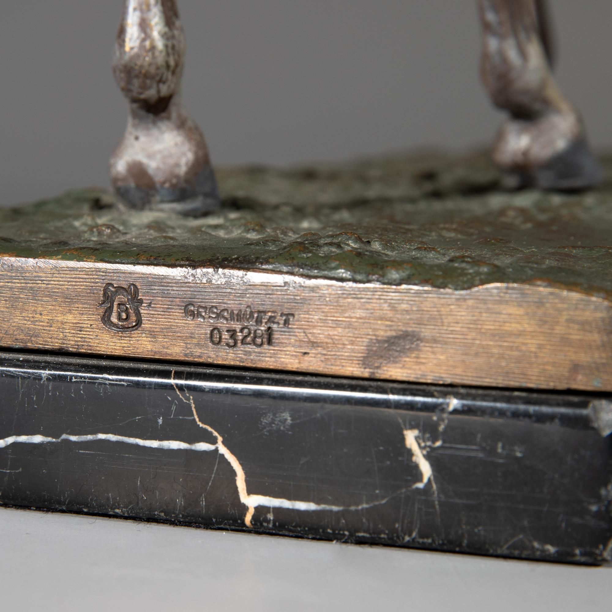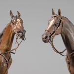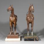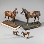 Bronze, kalt bemalt. H. 31,5 x 33 x 12 cm / H. 31 x 32 x 12,5 cm (je mit Sockeln) / H. 10,5 x 12 x 2,5 cm / H. 8 x 9,5 x 2 cm. Sockel des größten Pferdes bez.: Werkstattmarke GESCHÜTZT 03281; 2. Pferd mit Bezeichnung am Sockel: I. AUSTRIA-PREIS FREUDENAU 23.10.1911.