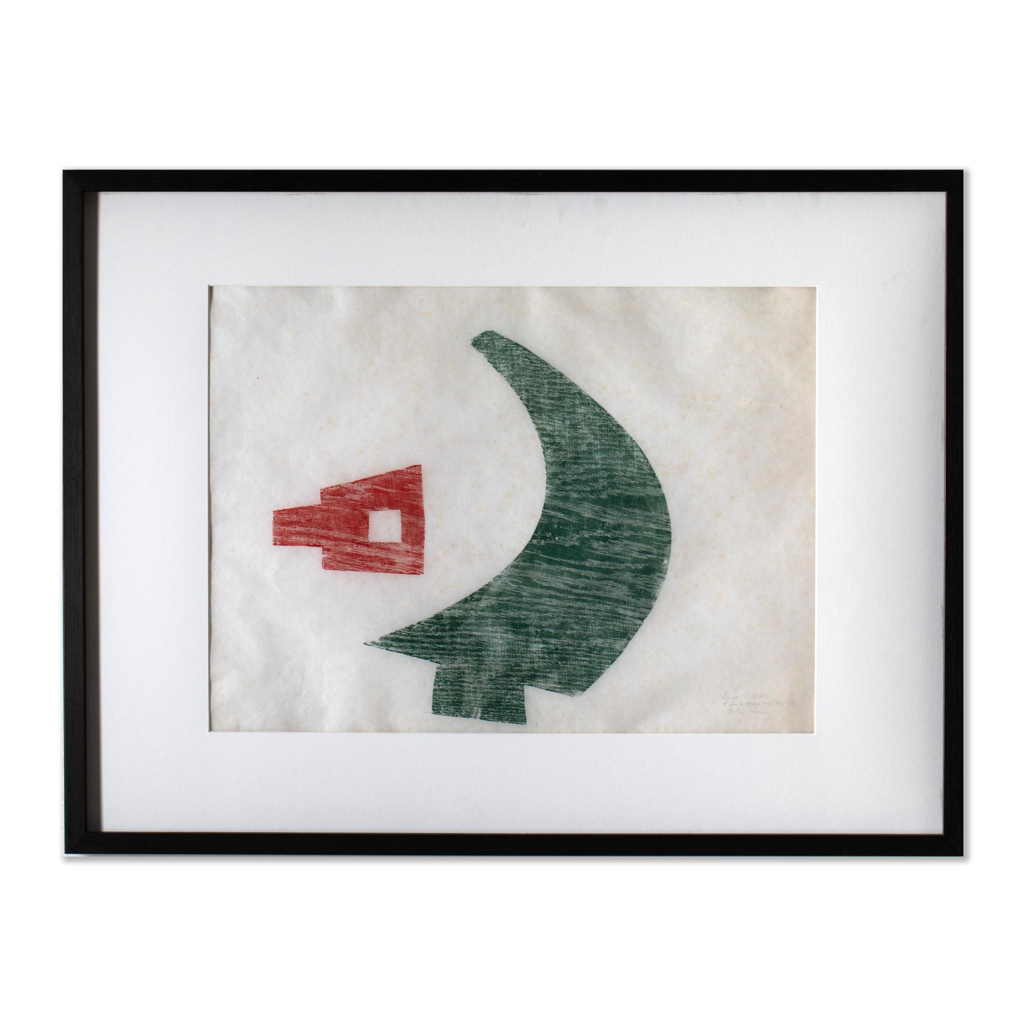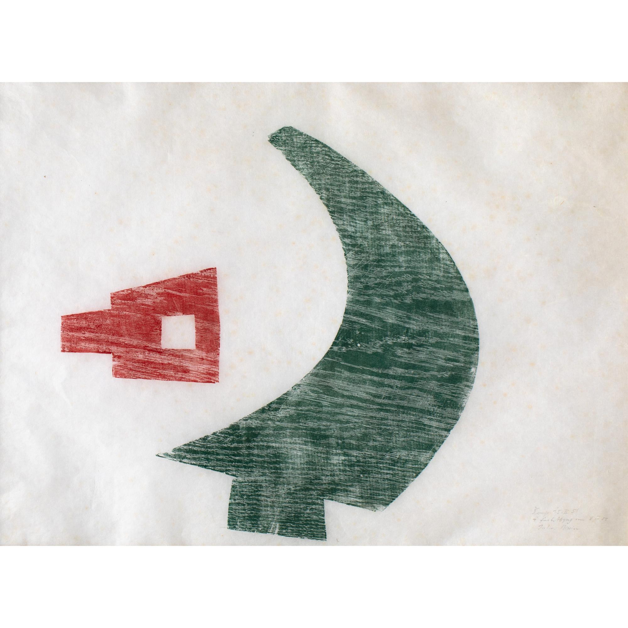 Farbholzschnitt auf vellum. 41 x 55,5 cm (Blattausschnitt). Rechts unten mit Bleistift bezeichnet, datiert und signiert: 'Komposition 15.II.51' / 1 farb. Abzug vom 8. III 55 / Julius Bissier. Hinter Glas im Passepartout gerahmt und so beschrieben.