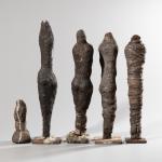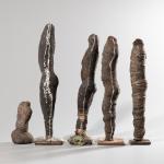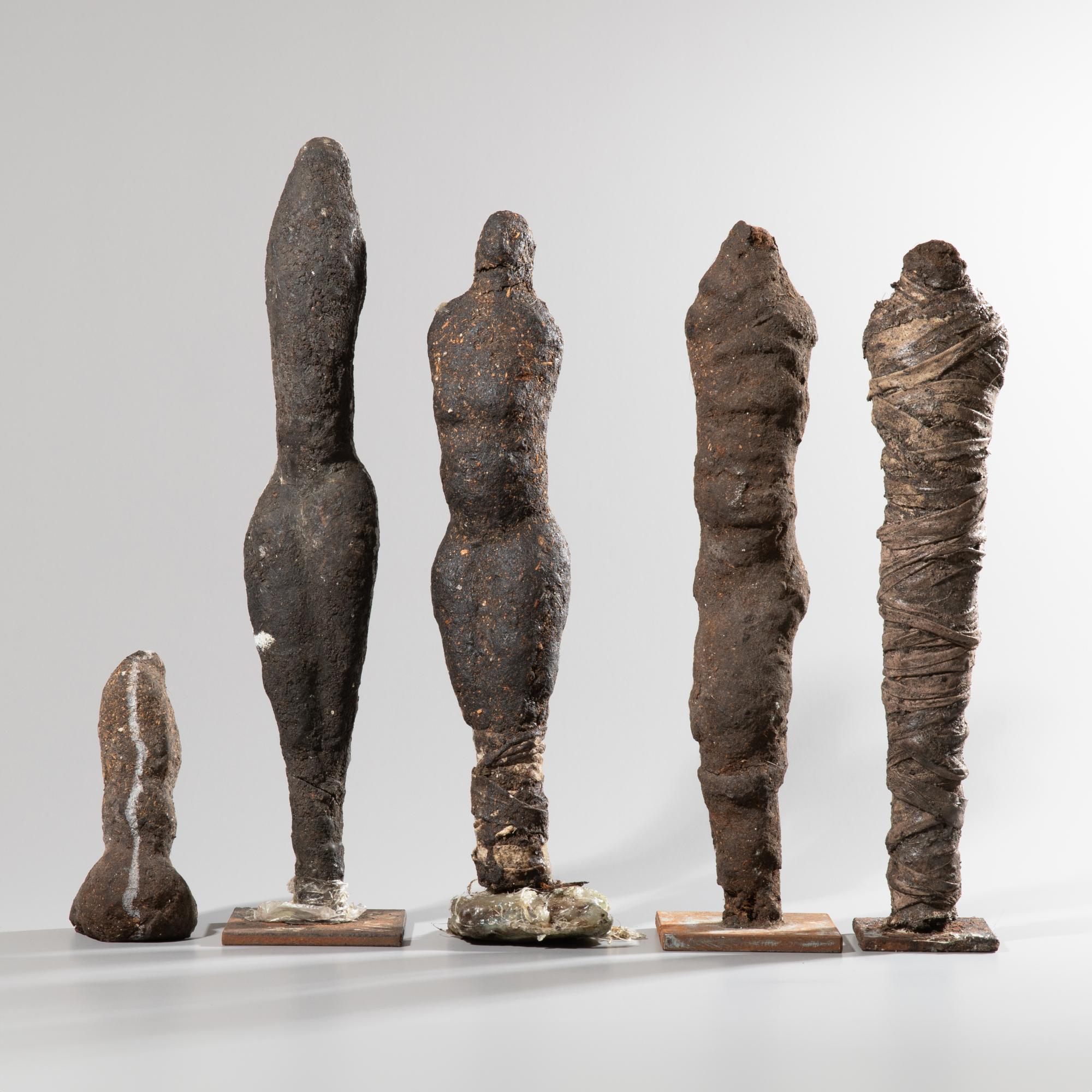 Lehm mit Sägespänen, teilweise mit Textil umwickelt, weiß bemalt und mit Leim. H. 13 - 36 cm. Vier Skulpturen auf Eisensockel. Eine Skulptur nummeriert und datiert: 4/5, 91.