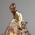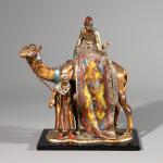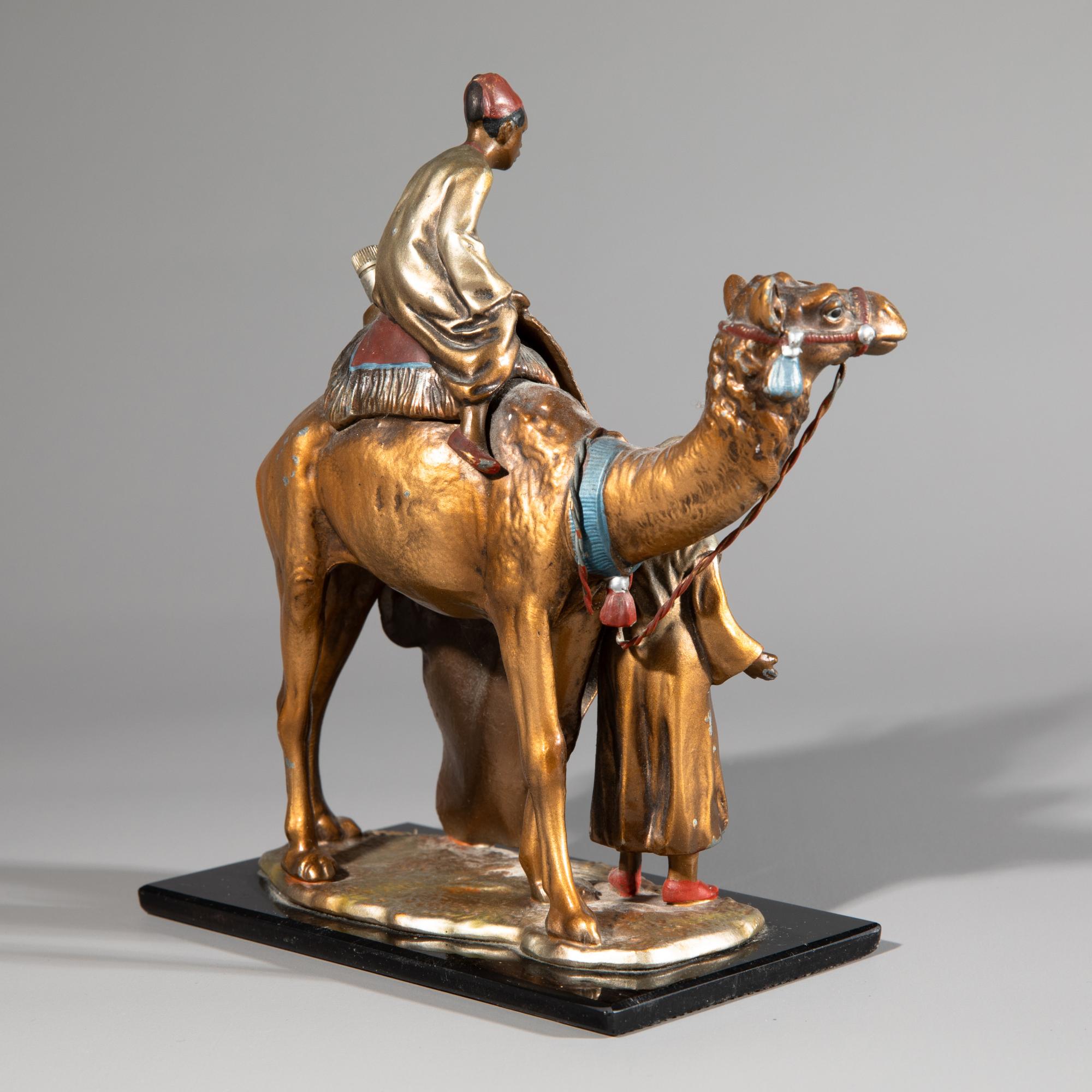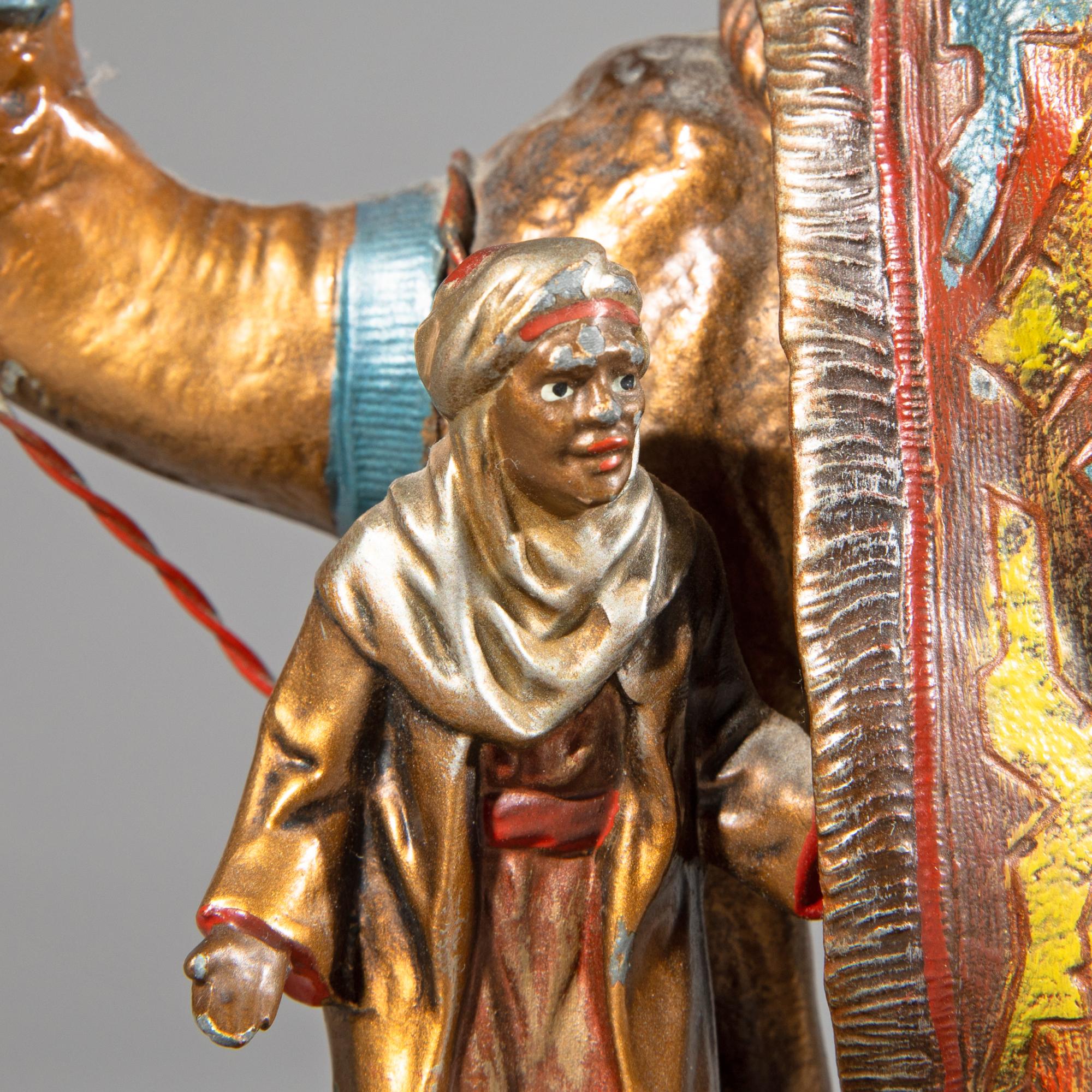 Zinkguss, kalt bemalt. Zwei arabische Teppichhändler auf einem Kamel. Auf schwarzen Glassockel montiert. Rückseitige Zündvorrichtung nicht auf Funktionalität überprüft.