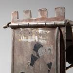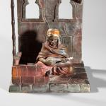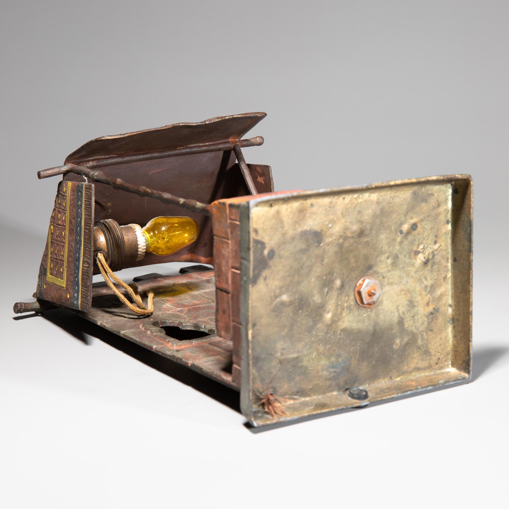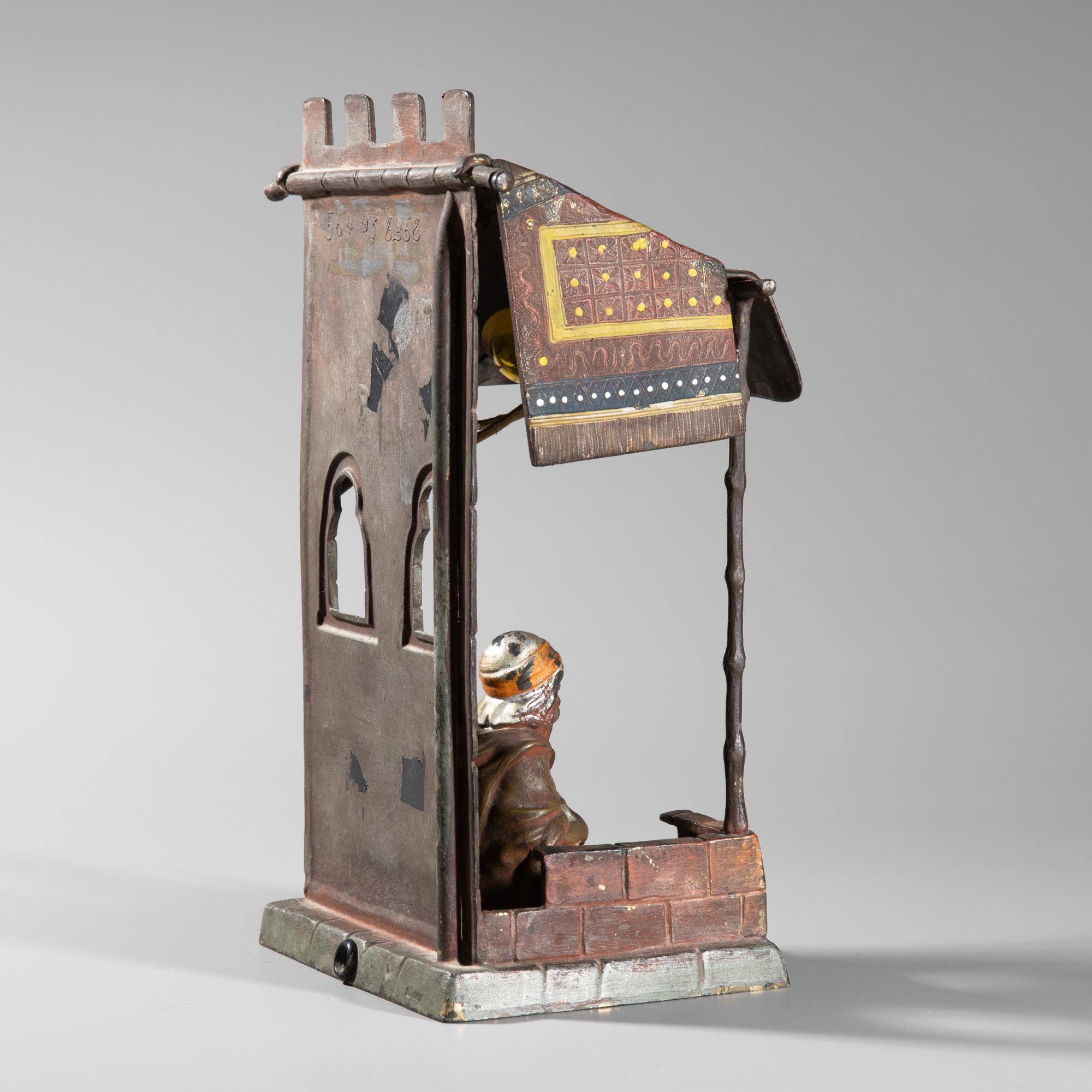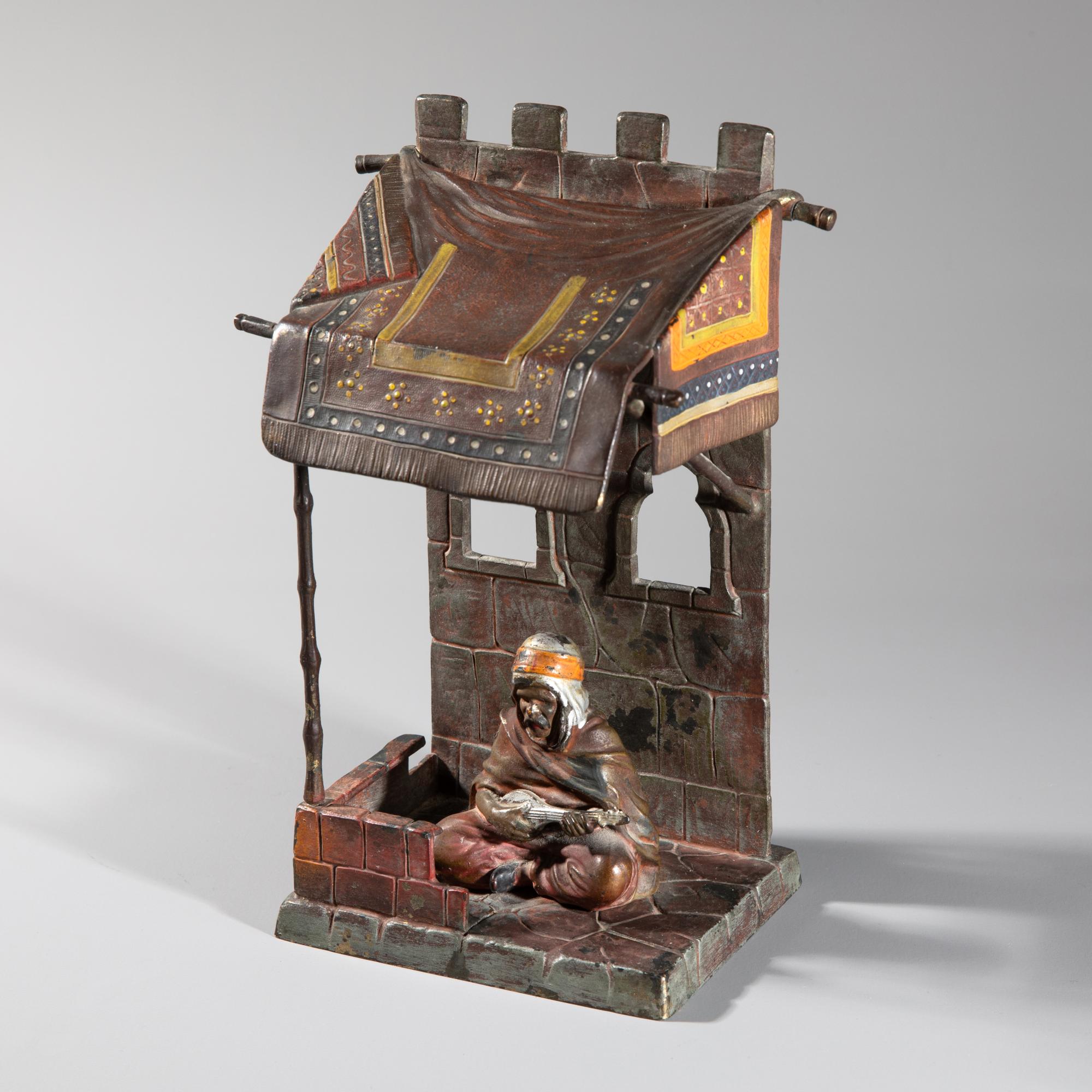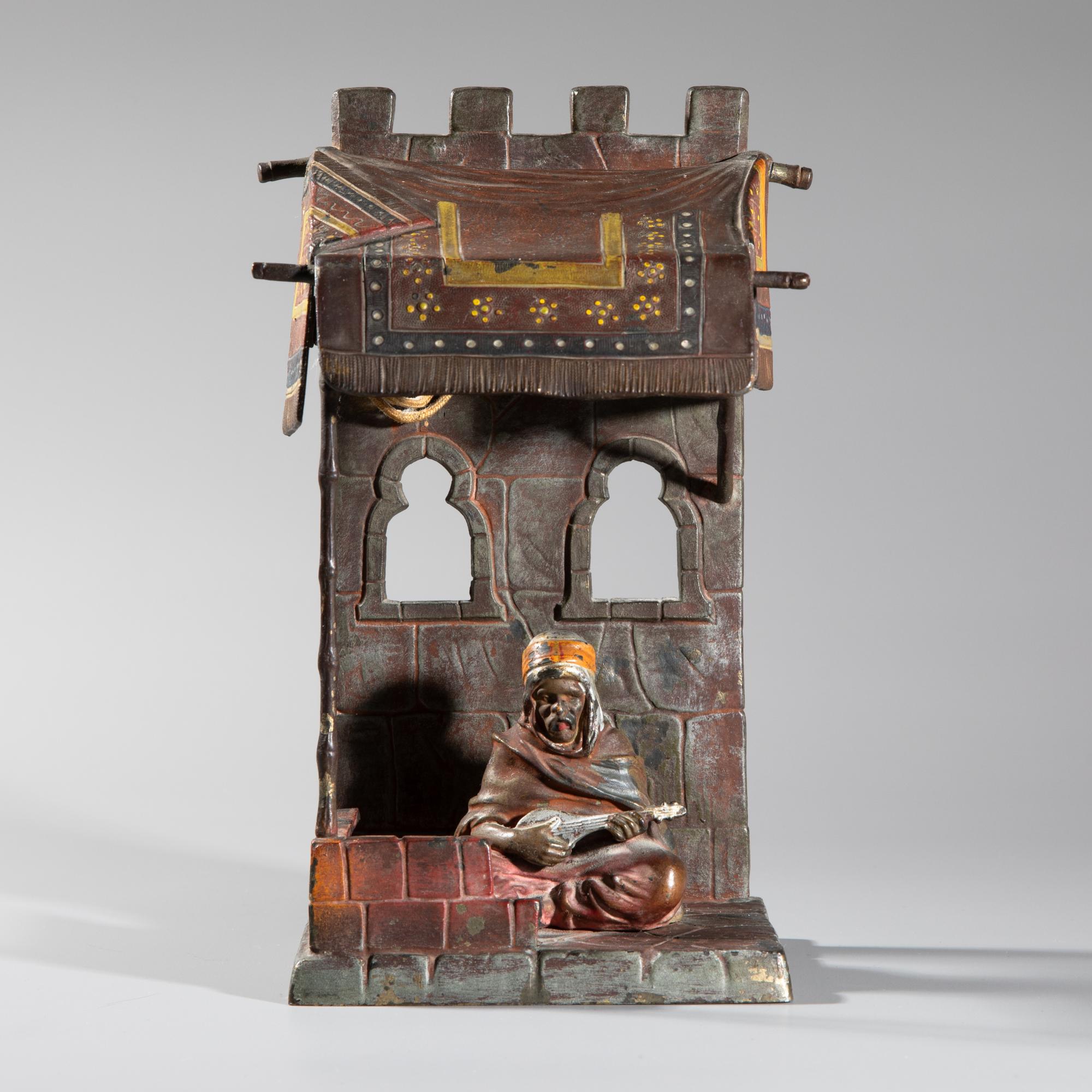 Zinkguss, farbig bemalt. 25 x 13 x 10 cm. Musizierender Araber in der von einem Teppich abgedeckten Loggia eines Hauses sitzend. Leuchtvorrichtung nicht auf Funktionalität überprüft.