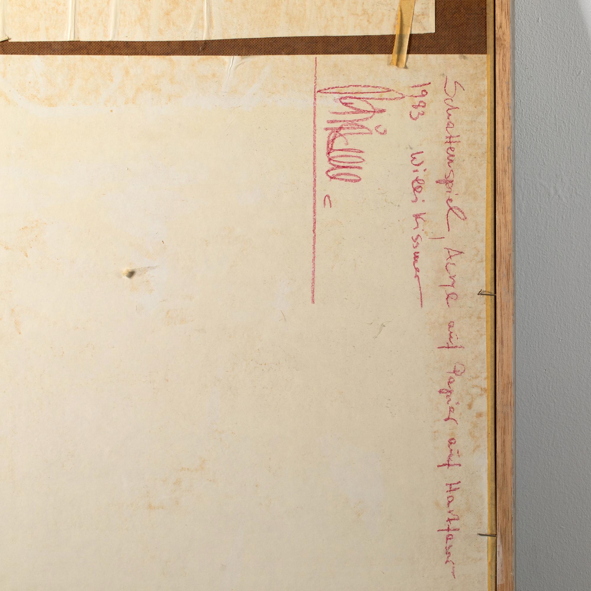 Acryl auf Papier, auf Hartfaserplatte. 80 x 81 cm. Verso u.a. signiert, datiert und betitelt: Willi Kissmer 1983 Schattenspiel (roter Wachsstift). Unter Glas gerahmt und so beschrieben.