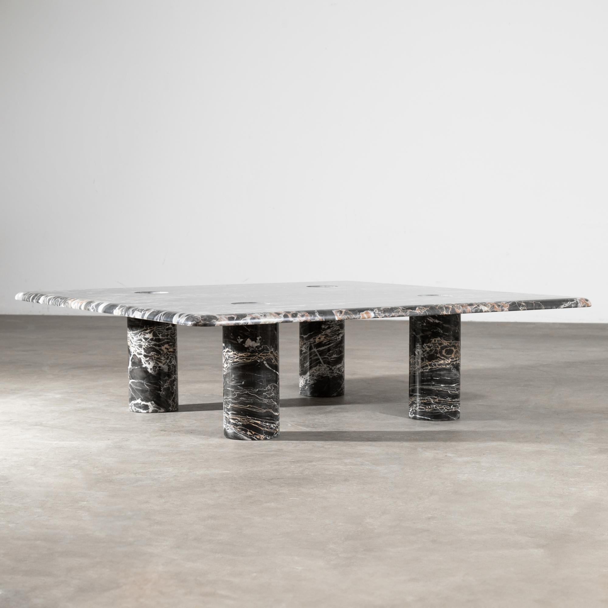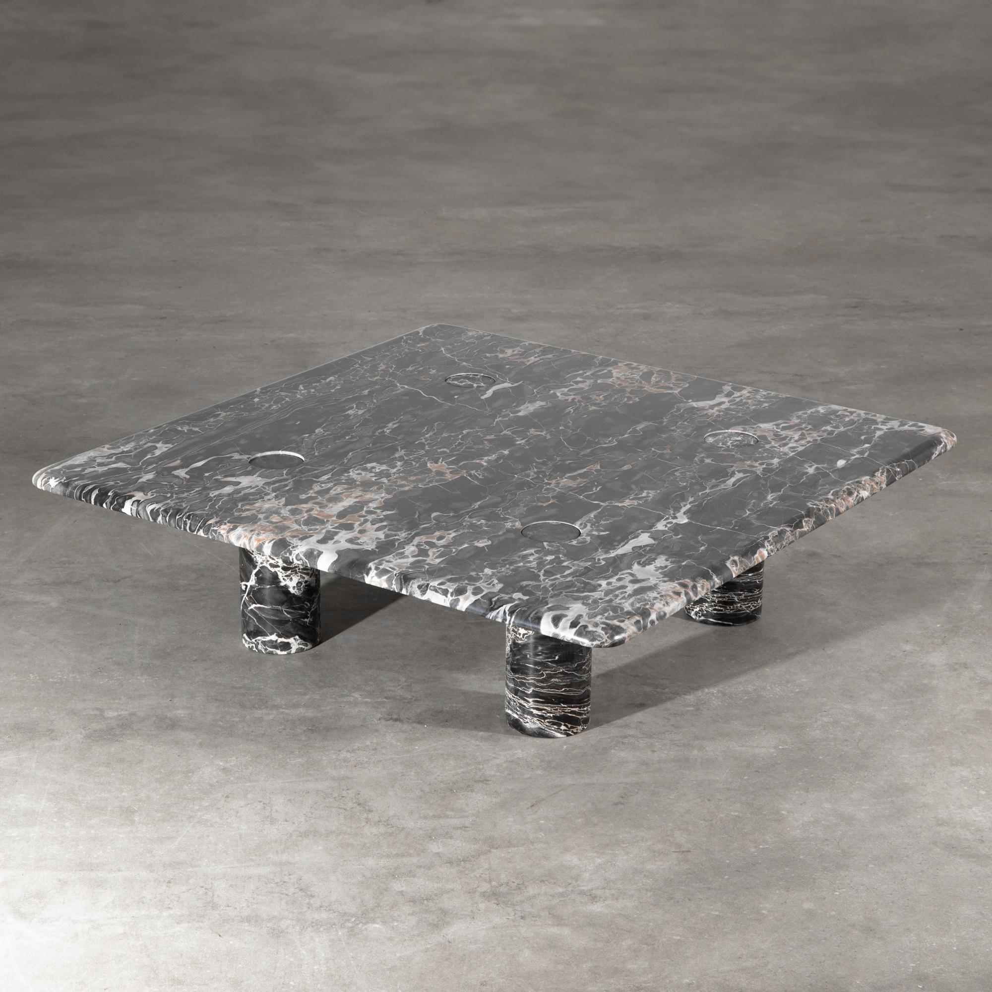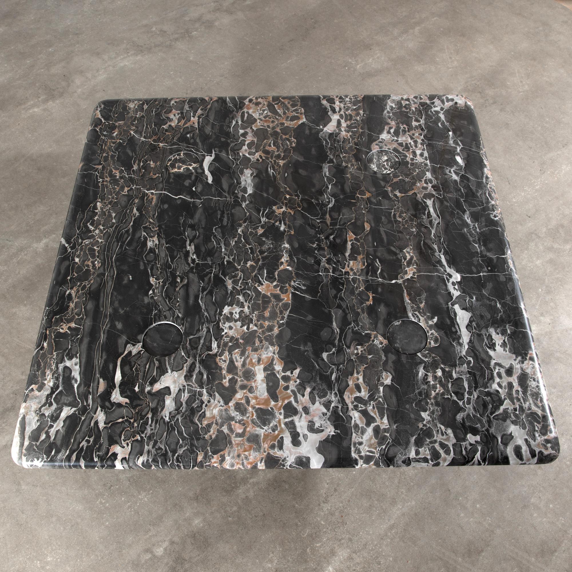 Entwurf aus den 1970er Jahren. Ausführung Up & Up. Schwarzer Marmor mit hellen Adern, lose eingesteckte Beine. 28 x 100 x 100 cm.