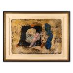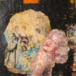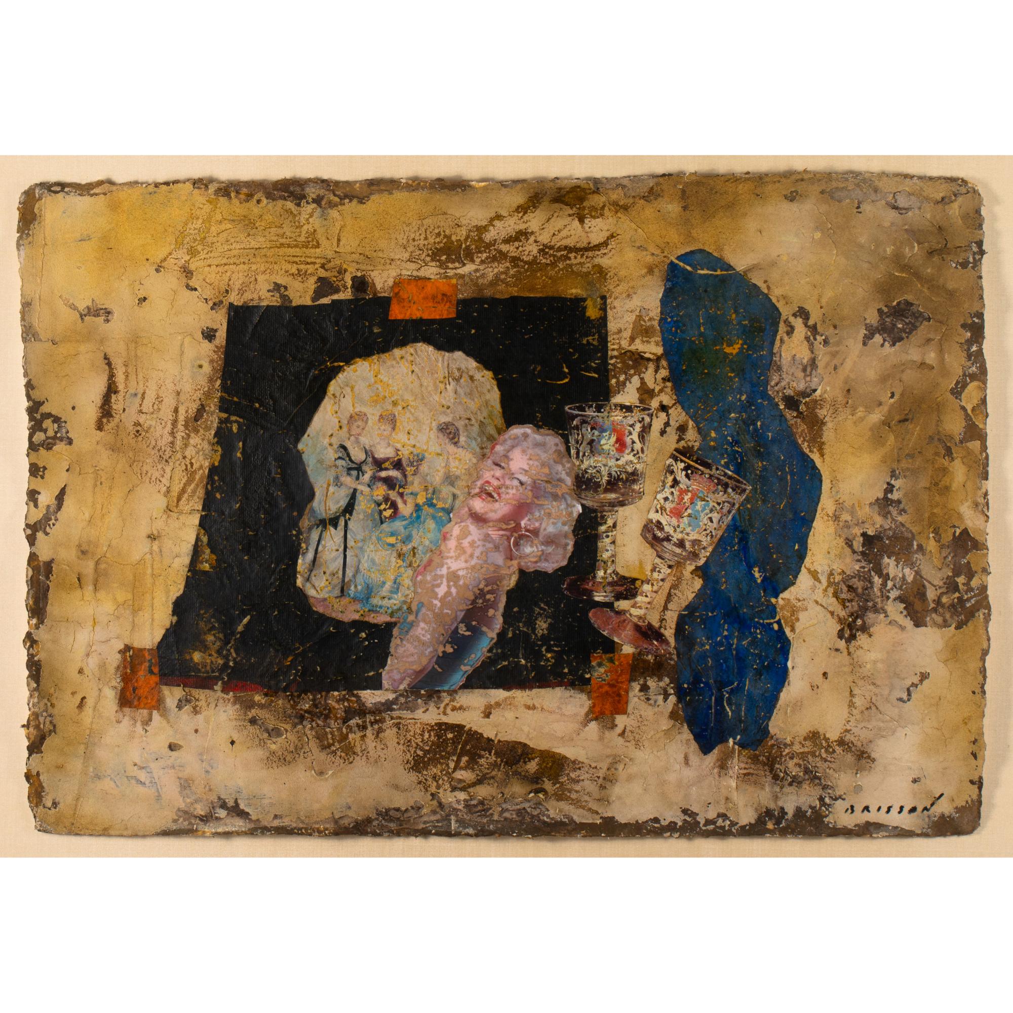 Collage, Mischtechnik auf Bütten. 63,5 x 93 cm. Unten rechts signiert: BRISSON (schwarzer Faserstift), verso auf einem Klebeetikett u.a. betitelt: Champagne Marilyn (schwarzer Faserstift) sowie Widmung auf der Rückwand: Brisson Pour Andrea et Fritz à Marilyn (schwarzer Faserstift). Unter Glas im Passepartout gerahmt und so beschrieben.