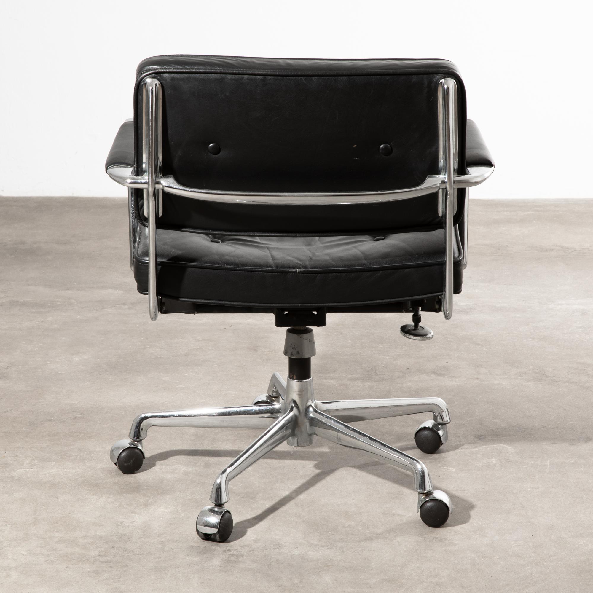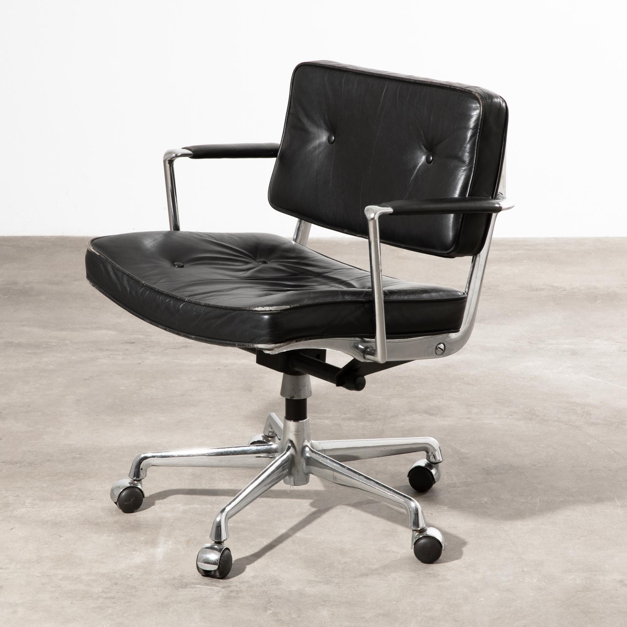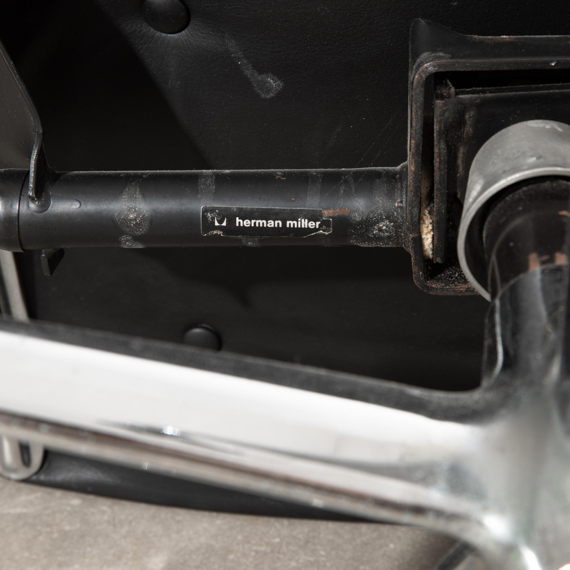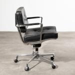 Entwurf 1968. Ausführung Hermann Miller. Verchromter Aluminiumguss, schwarzes Leder. 79-84 x 64 x 62 cm. Auf der Verstelllinse der Wippe mit Herstellerlogo bezeichnet.