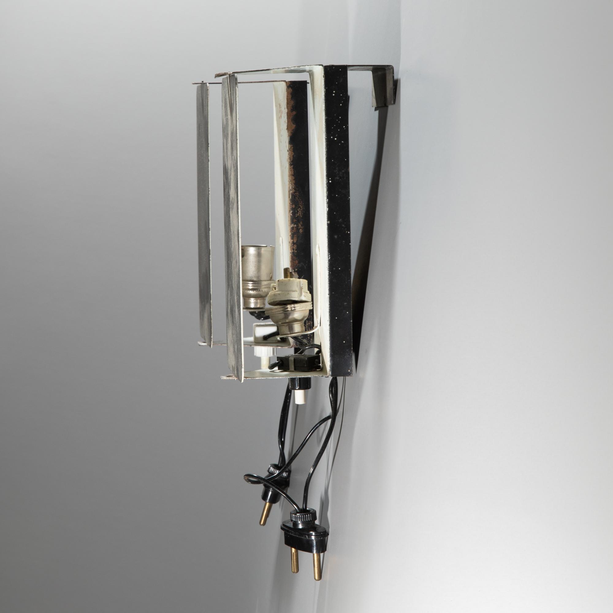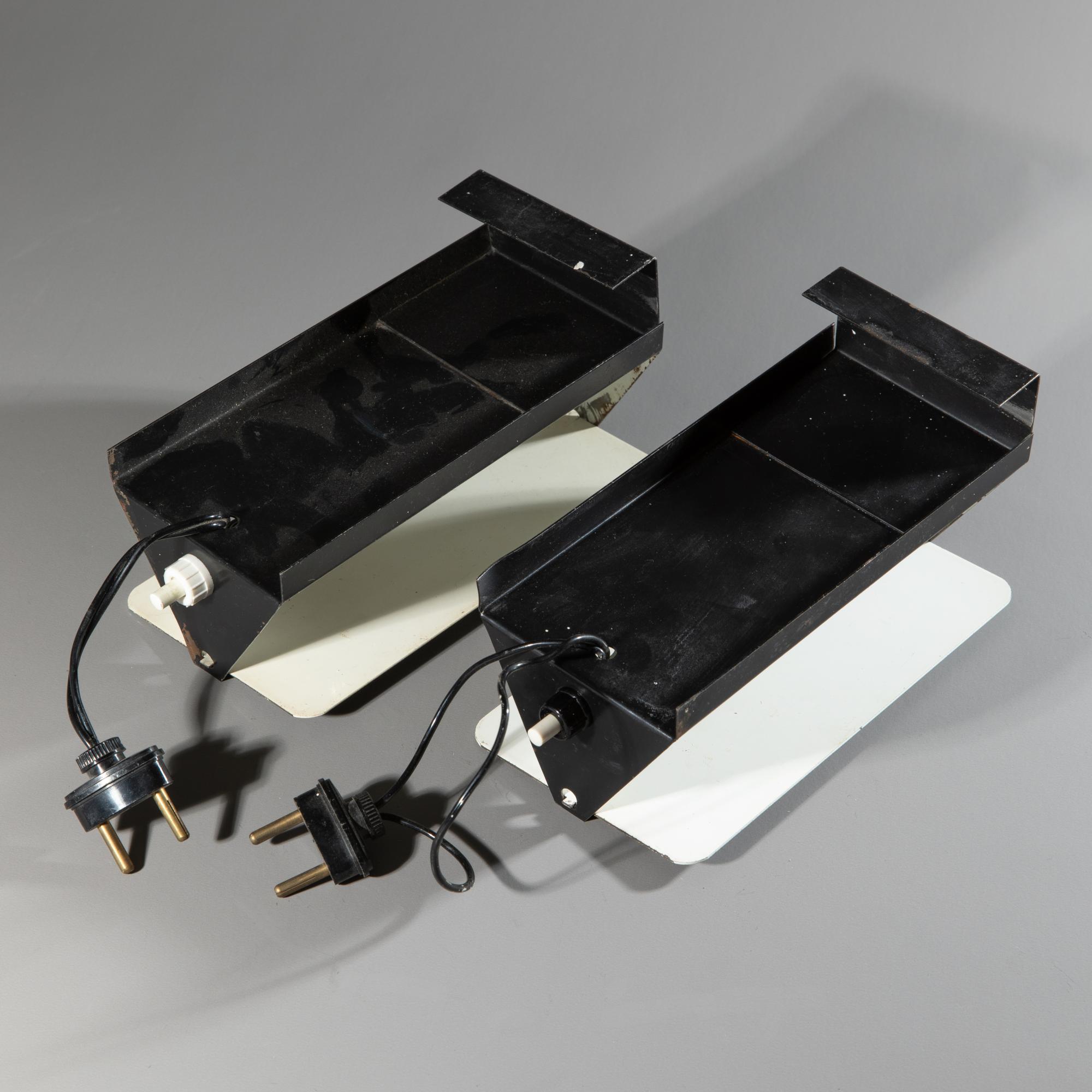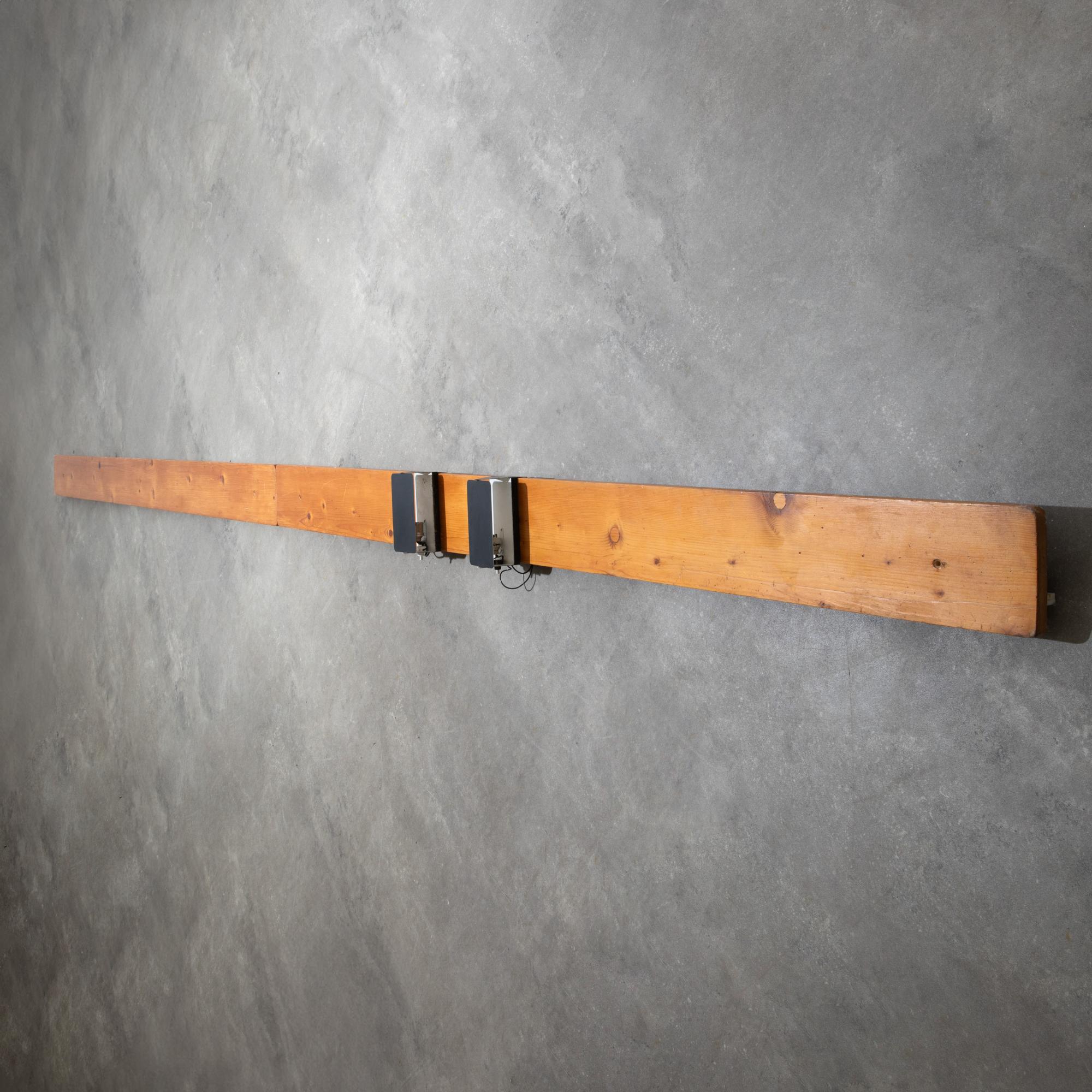Entwurf 1963. Metallblech, weiß und schwarz lackiert. 18 x 9 x 9 cm. Wandleiste aus einem Gebäude in Les Arcs. Kiefer mit Elektroschiene und verschiebbaren Anschlüssen für die Stecker der Leuchten. Somit können die Leuchten beliebig auf der Leiste aufgesteckt werden. L. 450 cm.