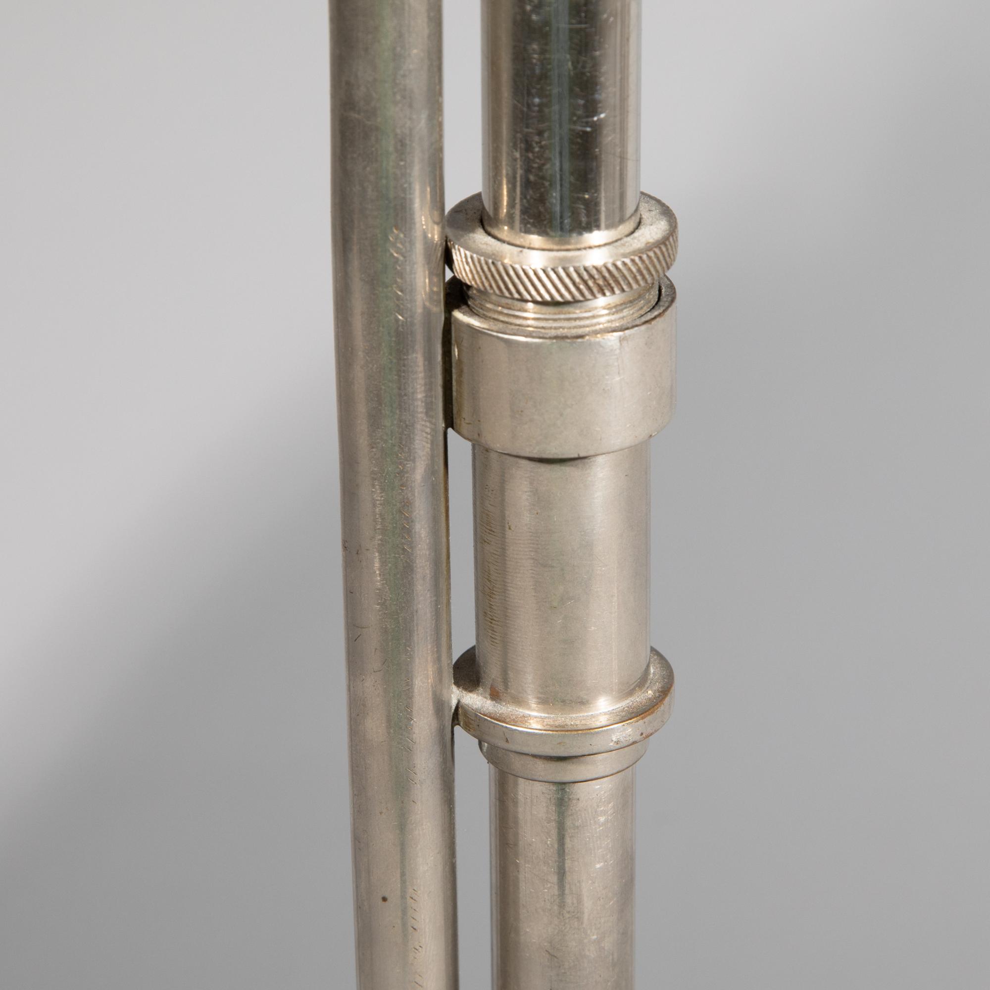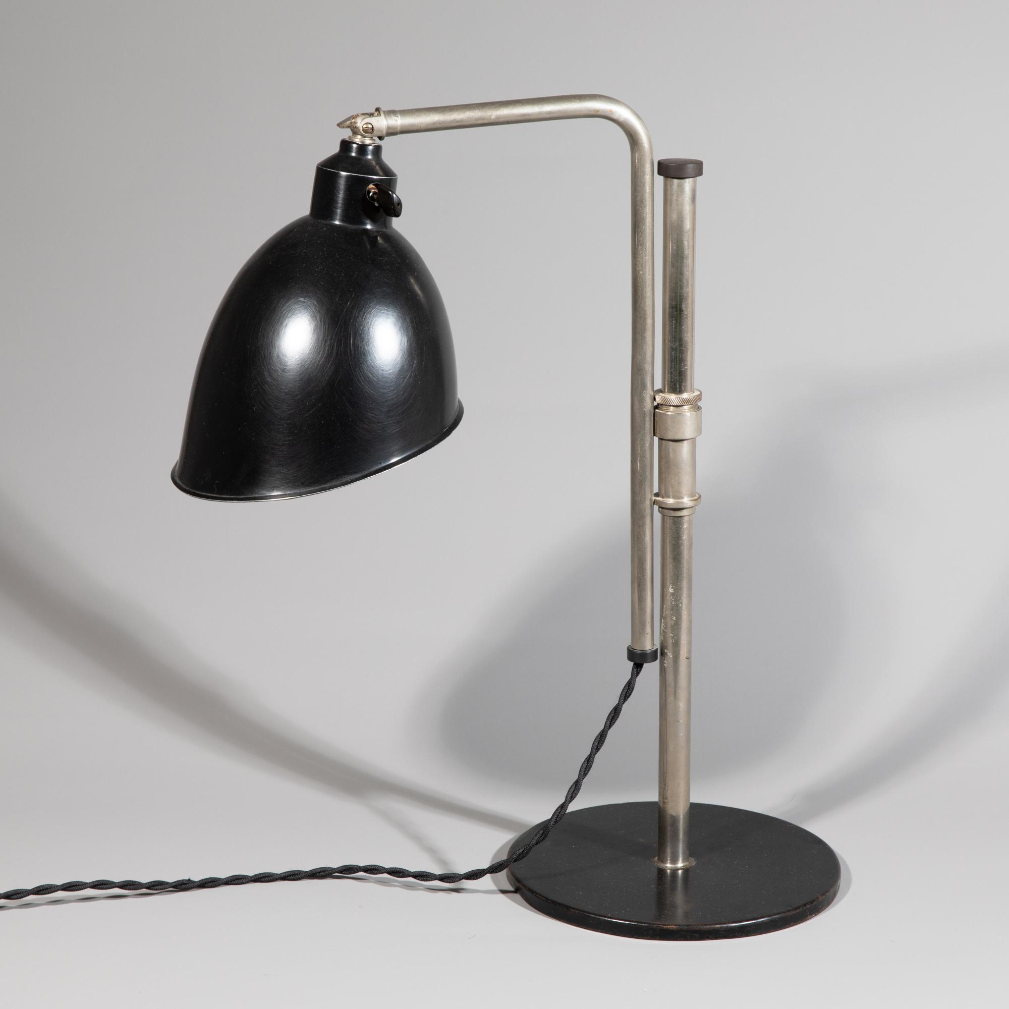 Entwurf 1927/28. Ausführung Rondella Beleuchtungskörperfabrik GmbH. Lackiertes Metall, vernickeltes Messing, lackiertes Aluminium, höhenverstellbar. 41-75 x 19 x 43 cm.