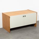 Entwurf 1957. Ausführung Vitsoe & Zapf. Holz, lackierte Fronten, Kunststoffgriffe. 59 x 117 x 60 cm.