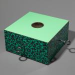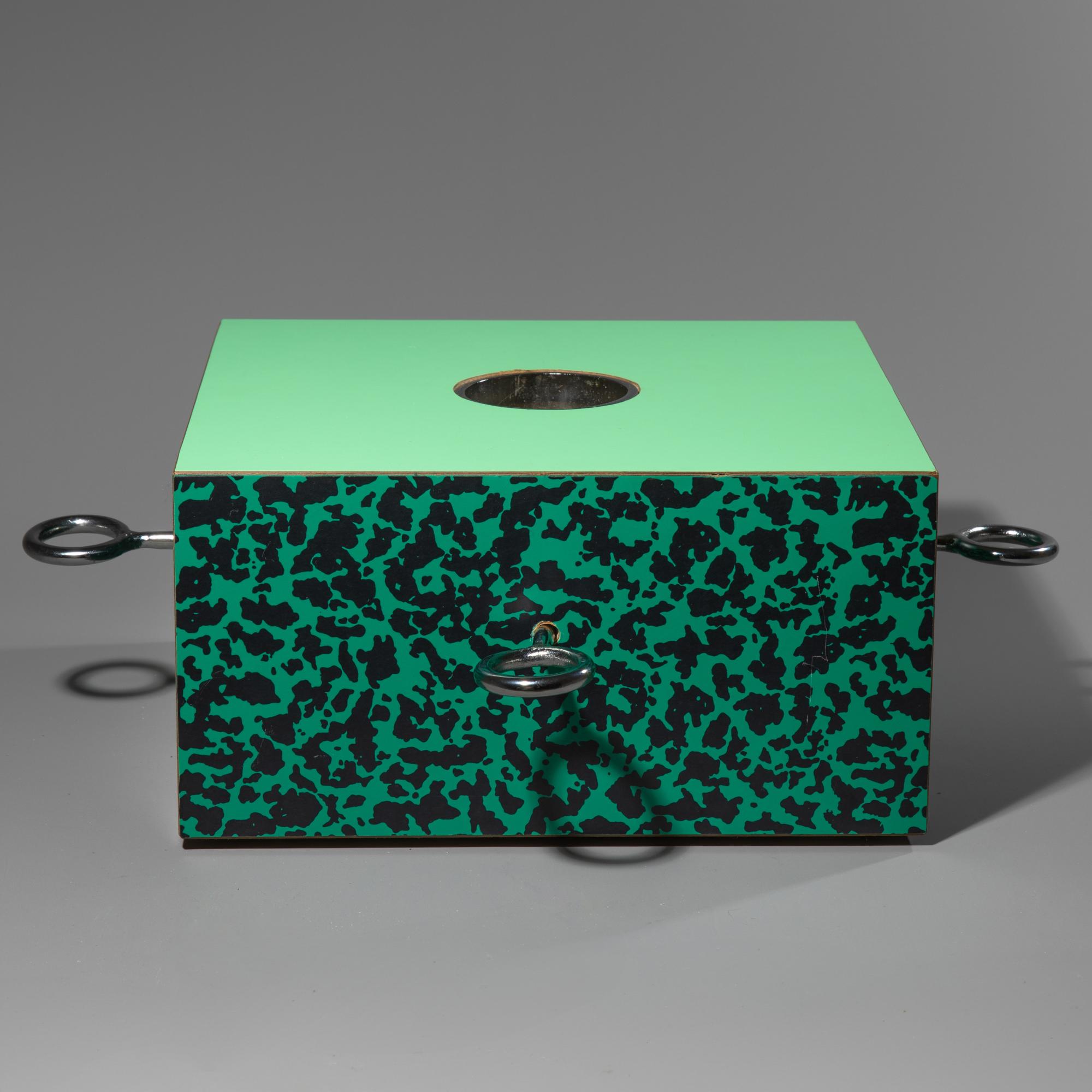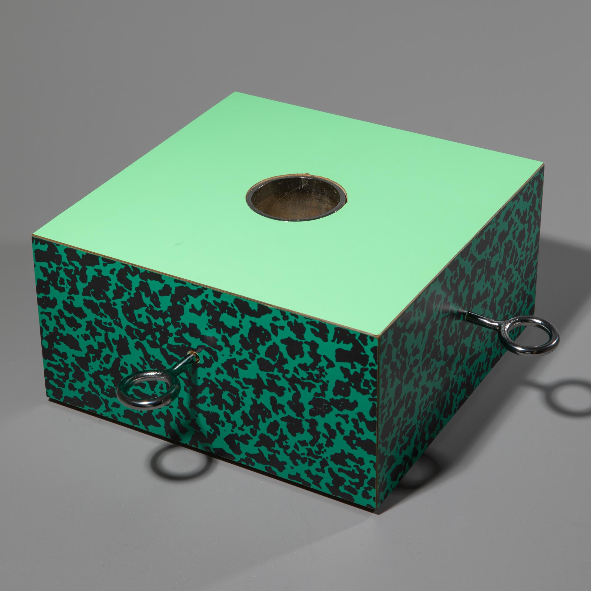 Entwurf 1988. Ausführung Anthologie Quartett, Bad Essen, 1988. Spanholz, grünes 'Bacterio'-Laminat, Metallschrauben, Metallblech. H. 15,5 x 45 x 45 cm. Bez.: handschriftliche Bezeichnung und Signatur Ettore Sottsass, Anthologie Quartett (Stempel), Prototyp 1980, 0/50.