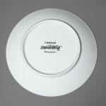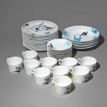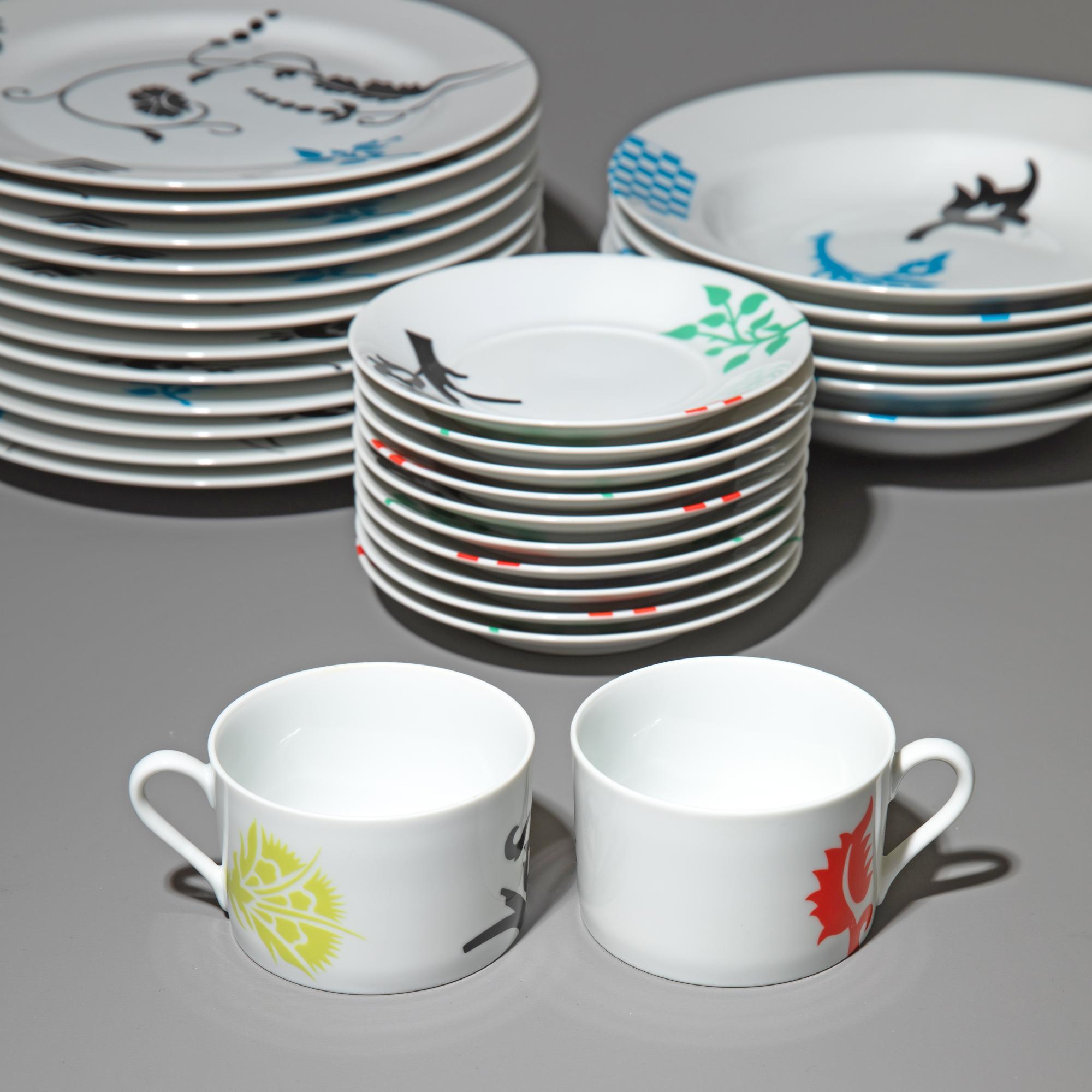Entwurf um 1985. Ausführung Swid Powell, New York. 10 Tassen, H. 5,5, D. 8,2 cm; 10 Untertassen, H. 2,2, D. 14,7 cm; 12 Speiseteller, D. 23 cm und 6 Suppenteller, D. 23.5 cm. Porzellan, weiß, glasiert, polychrome Lithographie. Bezeichnet: Faksimile-Signatur, Herstellermarke, Serientitel.