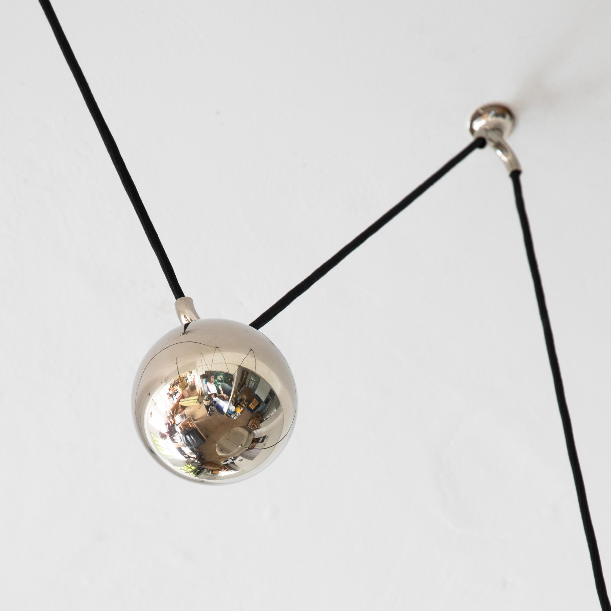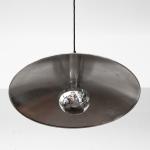 Entwurf 1960/70er Jahre. Ausführung Florian Schulz GmbH. Verchromtes Metall, schwarzes Stoffkabel. Maße Reflektor: H. 30 cm, D. 55 cm.