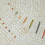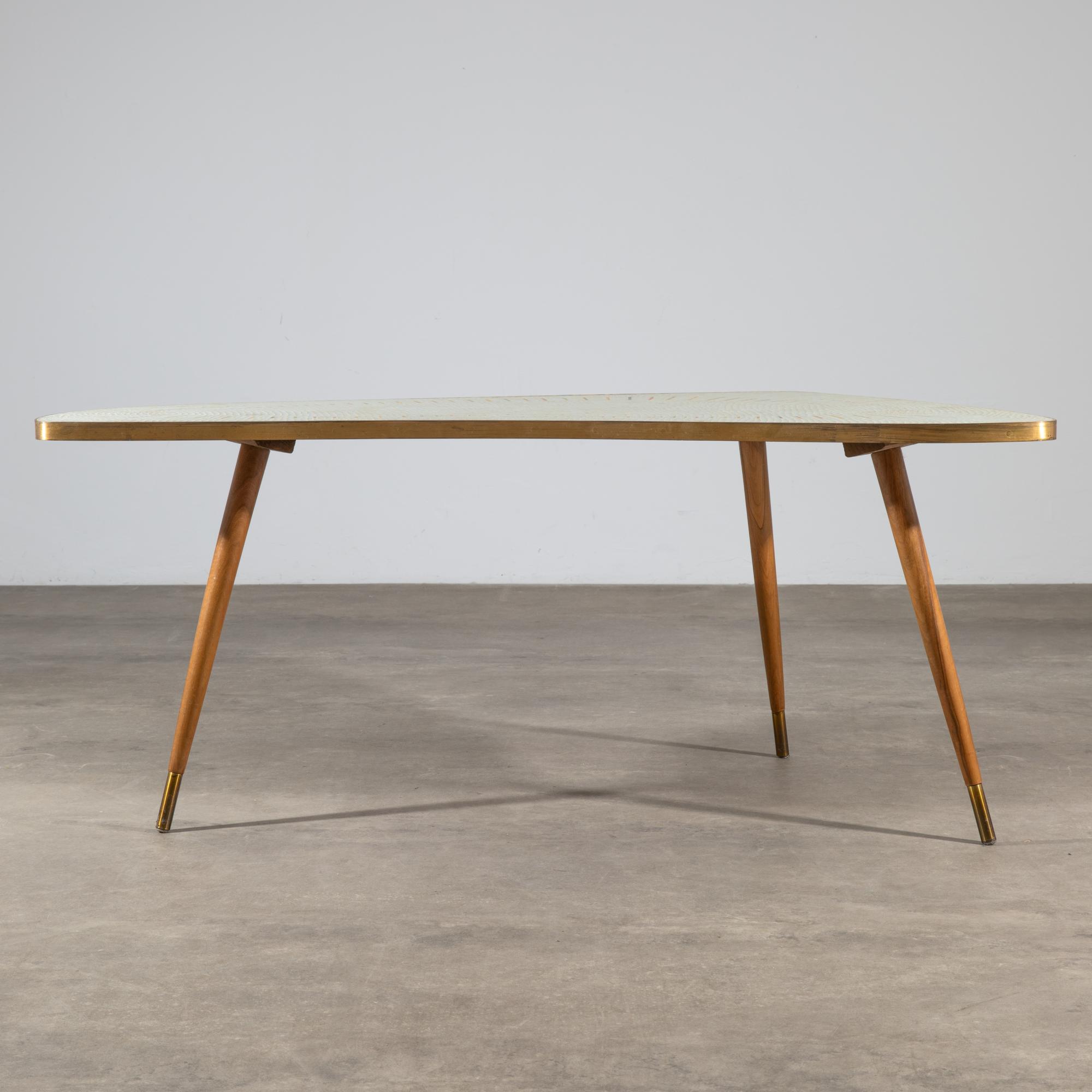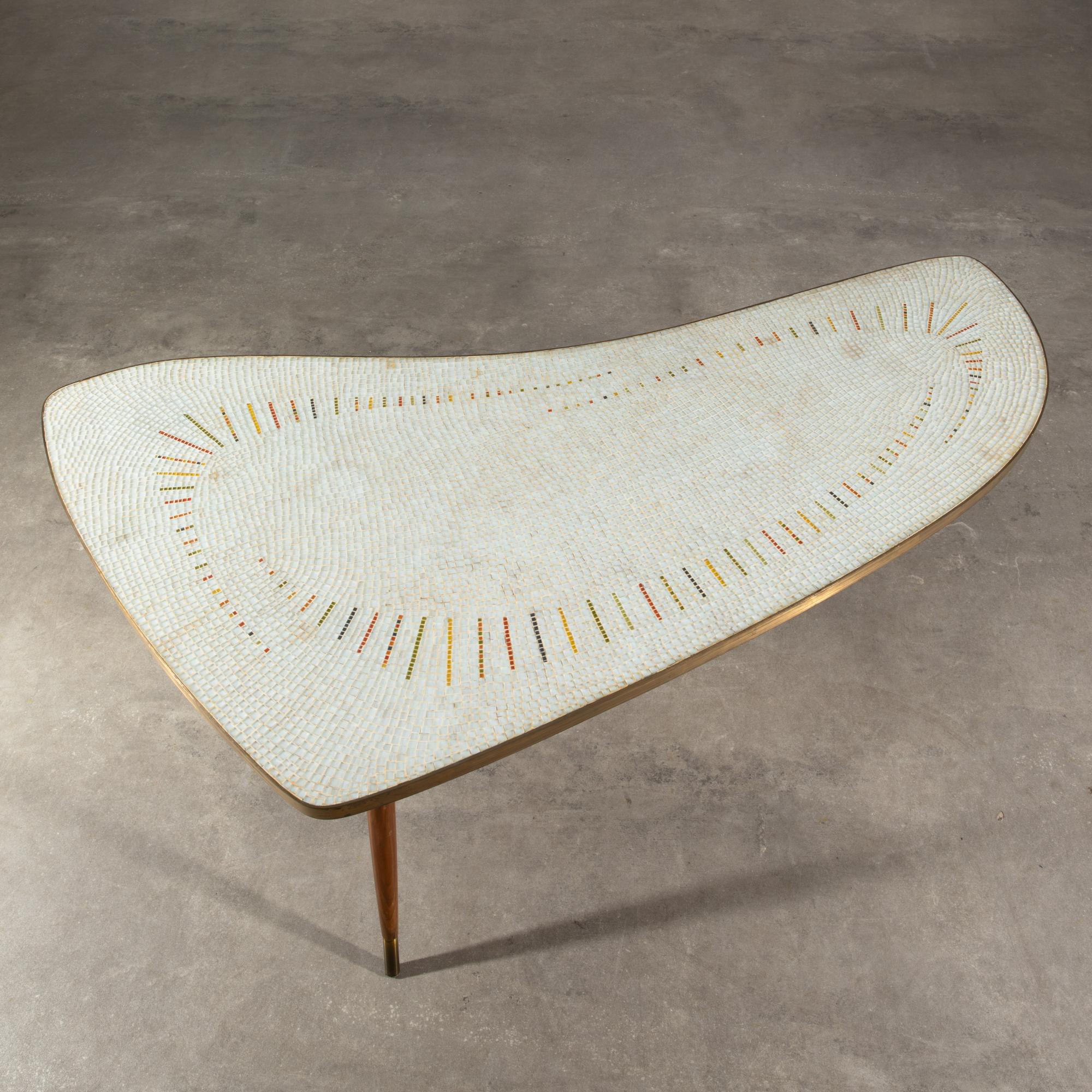 Entwurf 1950er Jahre. Frei geformte Platte mit Messingkante und Glasmosaik, Holzbeine. 56 x 134 x 70 cm.