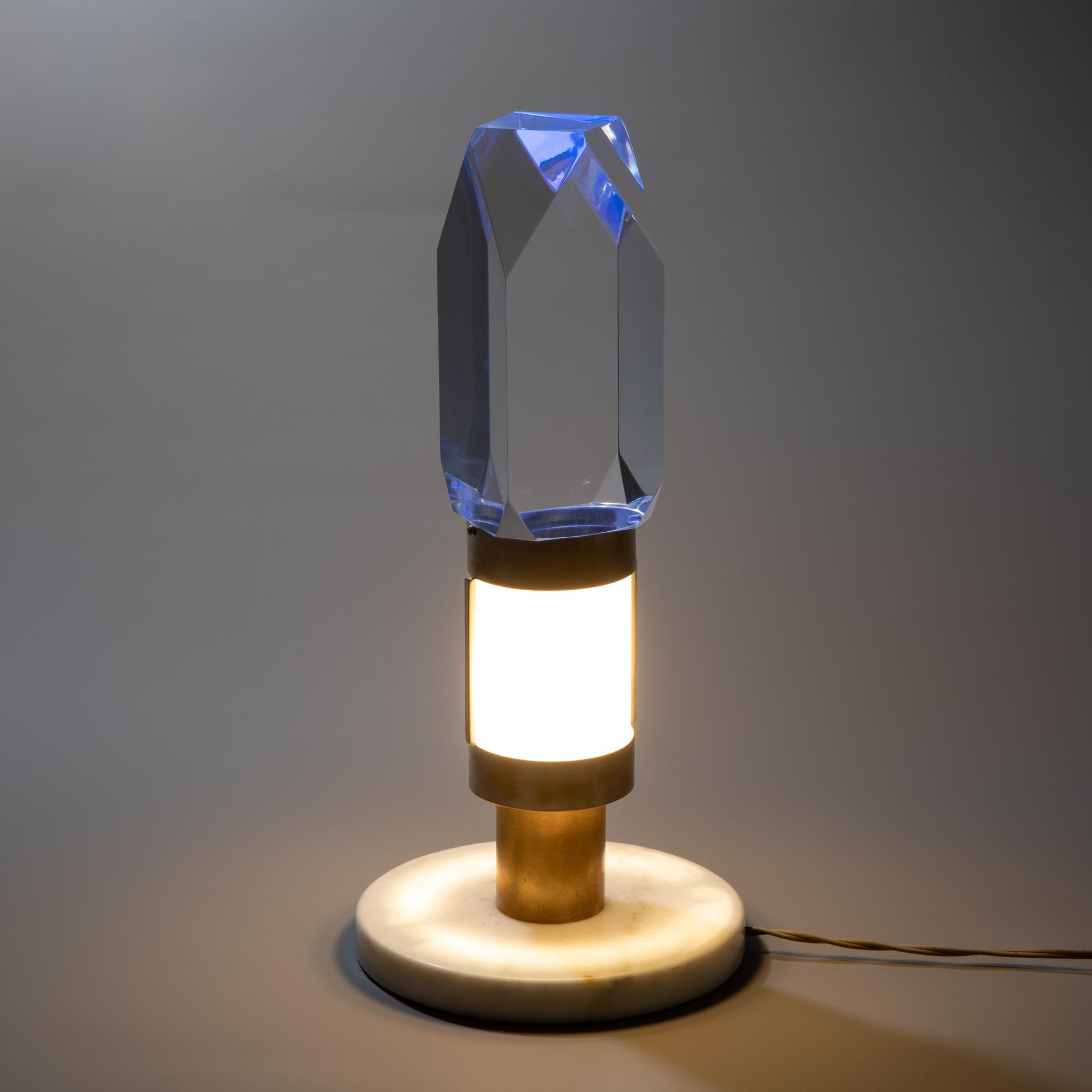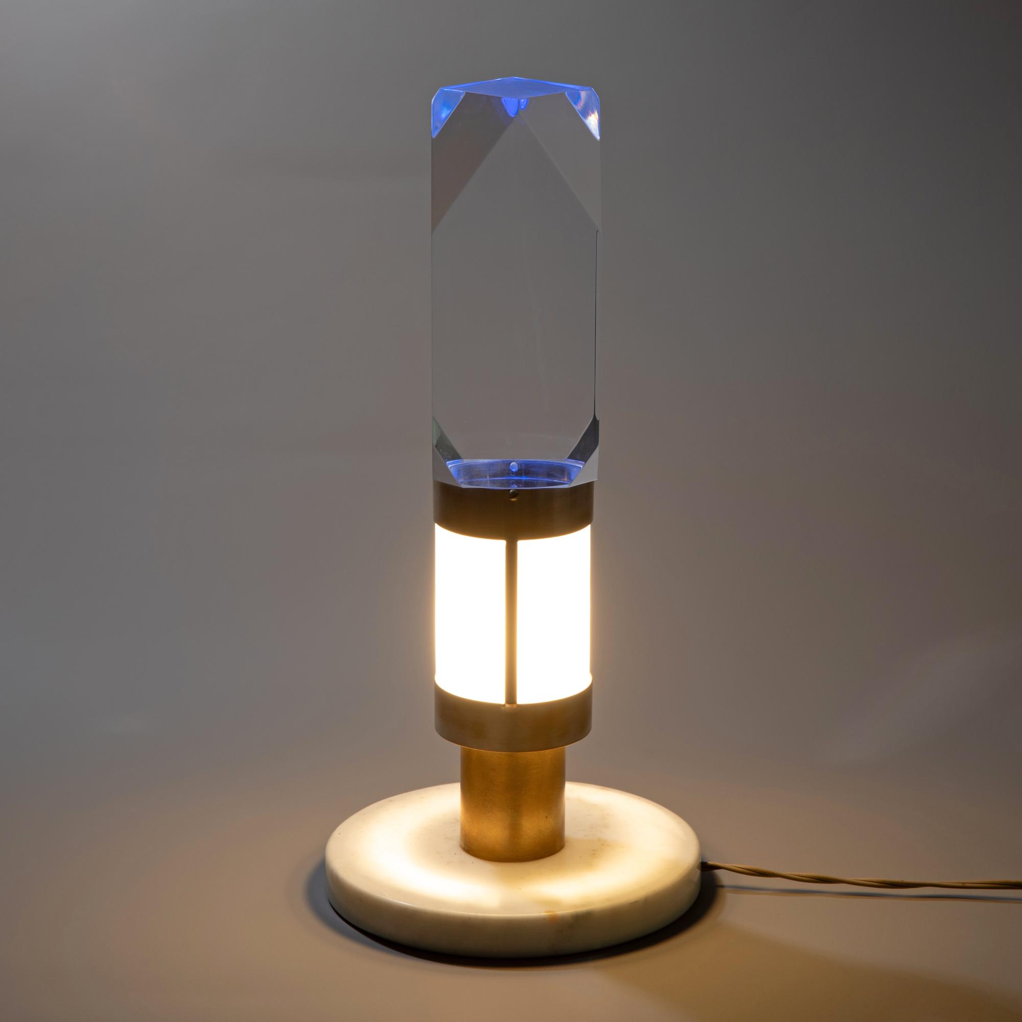 Entwurf um 1970. Ausführung Missaglia. Weßer Marmor, Metall, Glas und Leuchtkörper aus transparentem Acryl. H. 38 cm, D. 18 cm.
