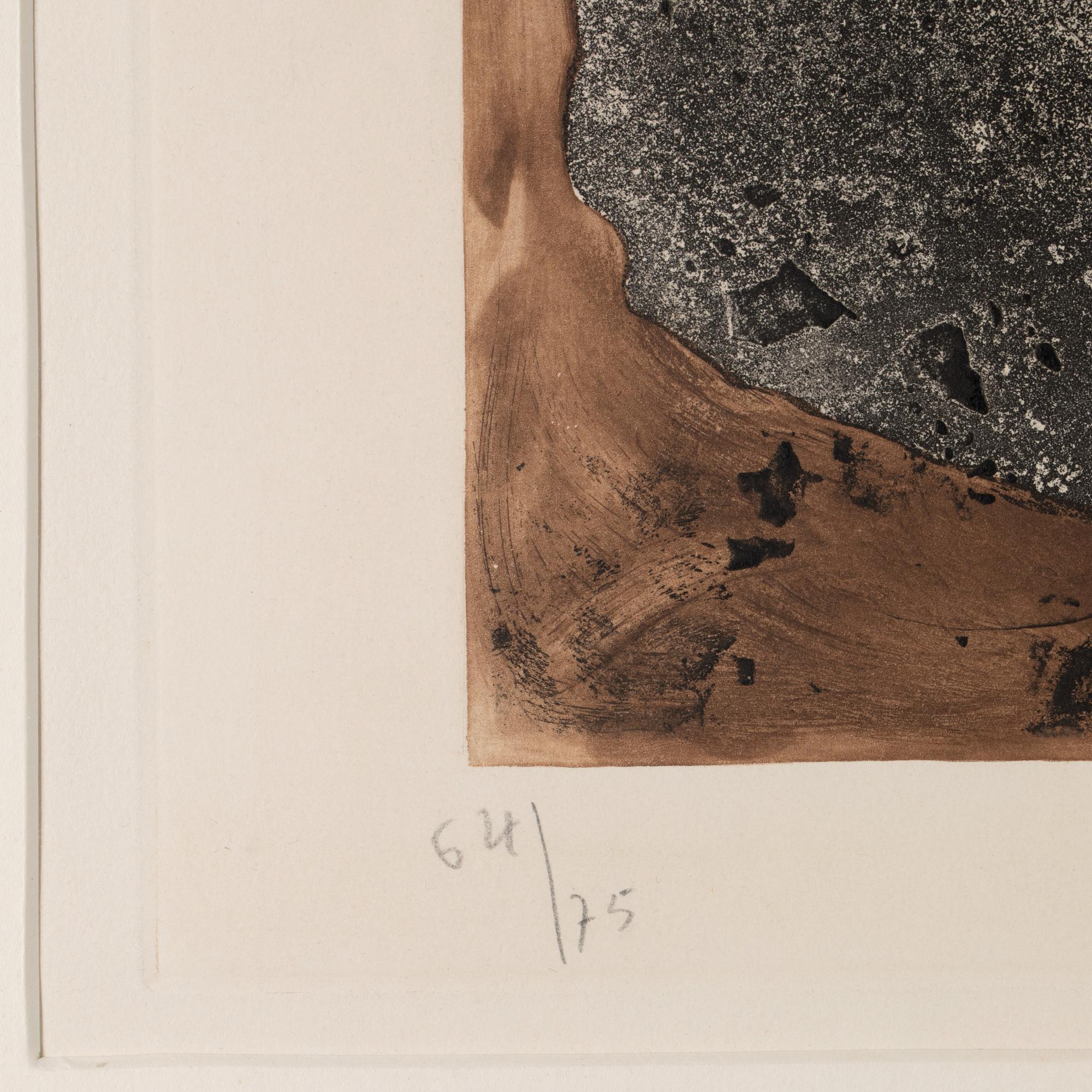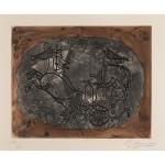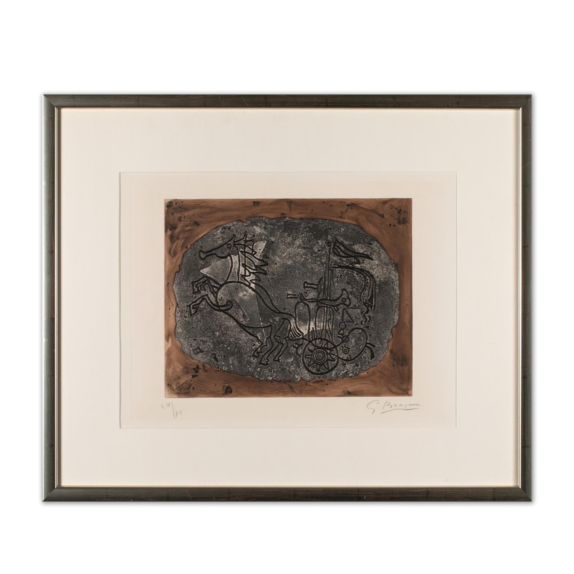 Farbradierung. Bildausschnitt 23,5 x 29,5 cm. Unten Links nummeriert: 64/75 und unten rechts mit Bleistift signiert: G Braque. Hinter Glas im Passepartout gerahmt und so beschrieben.