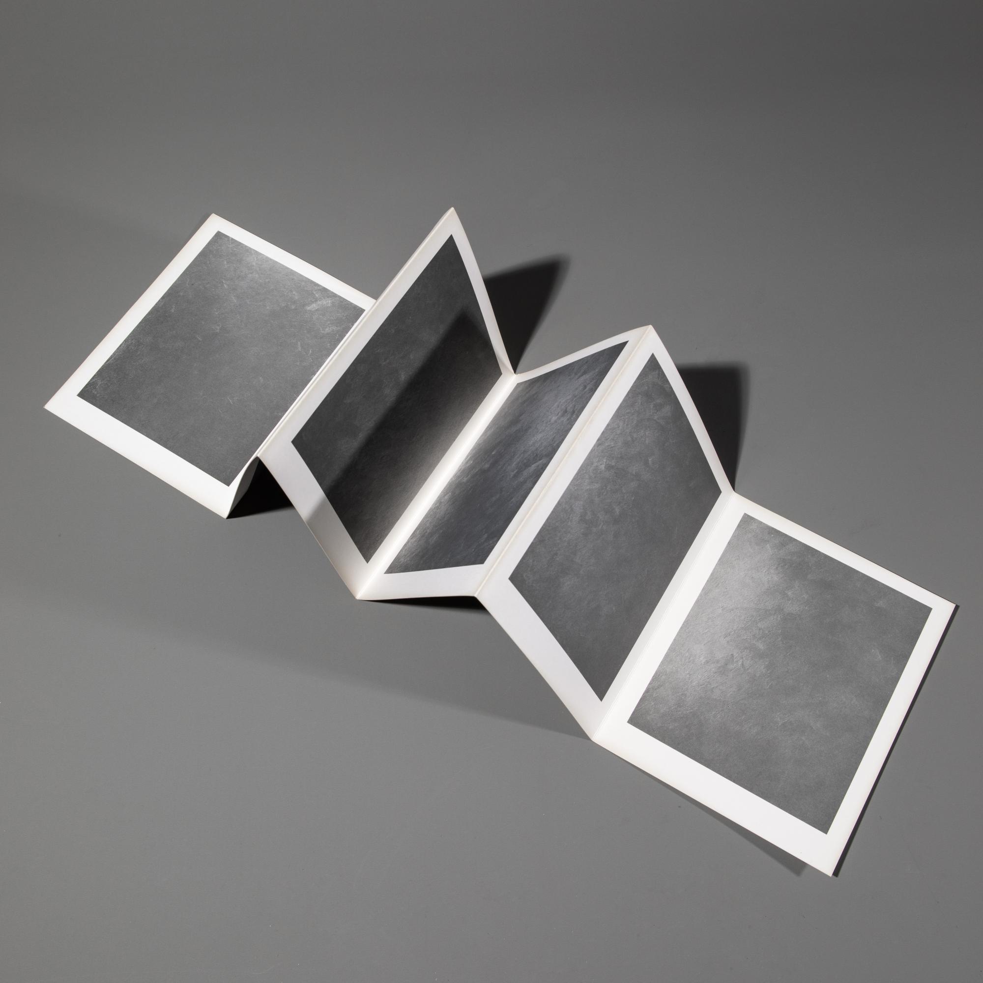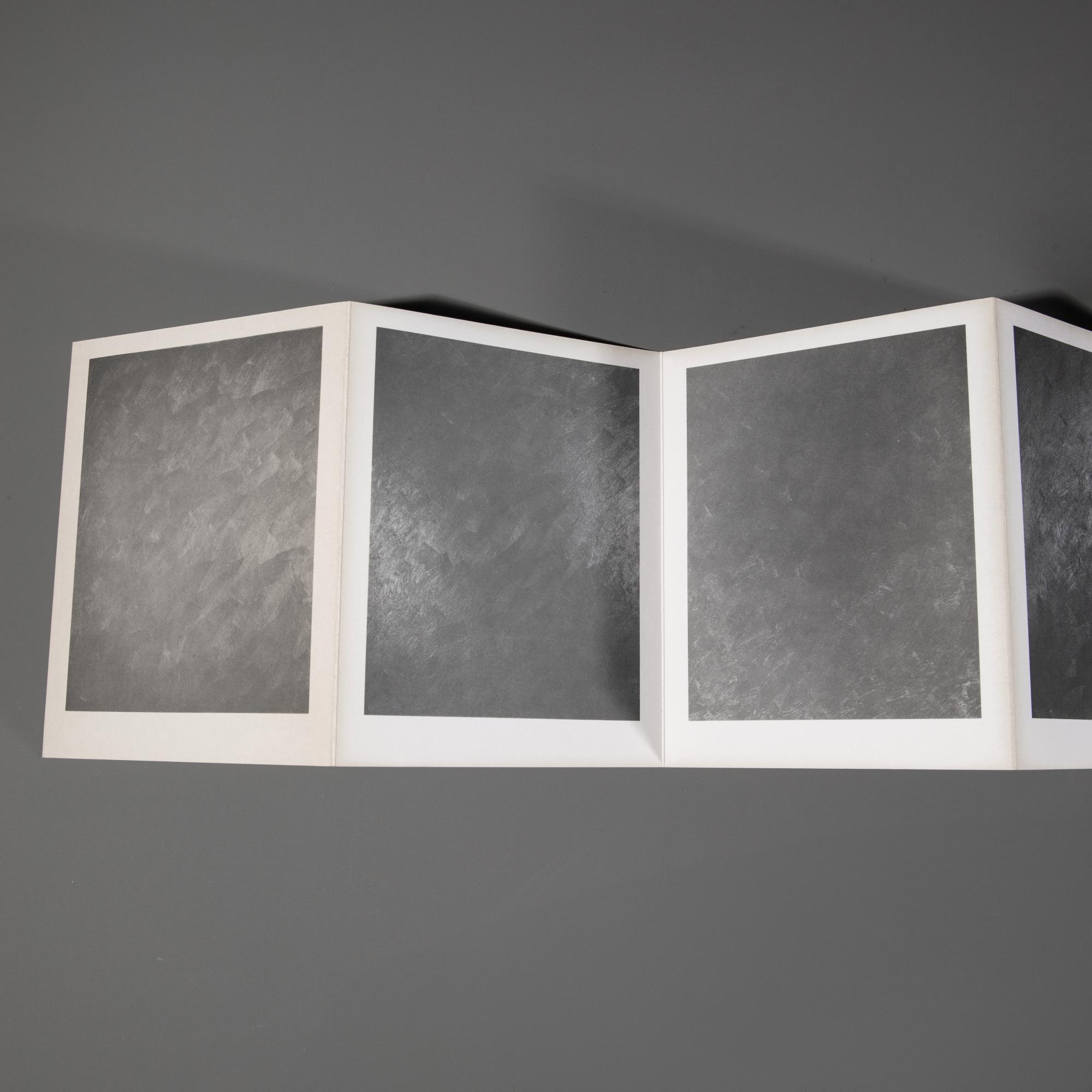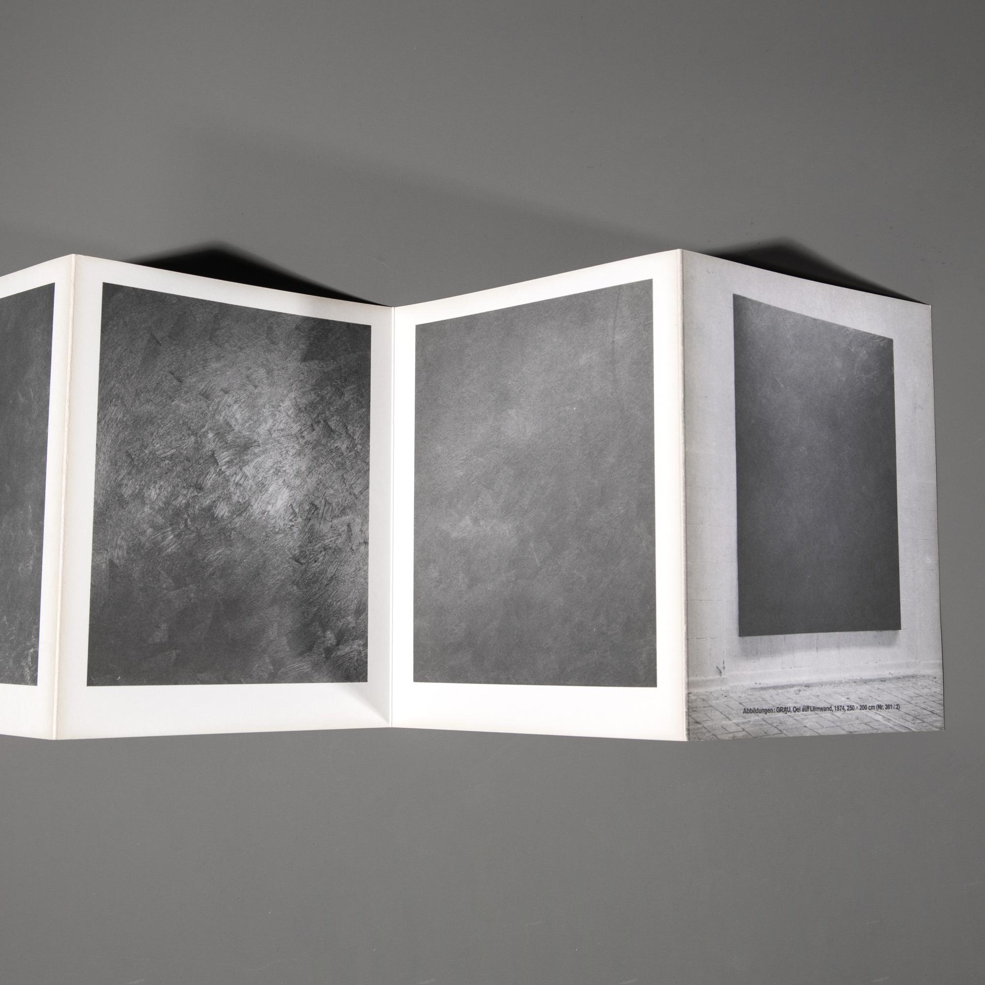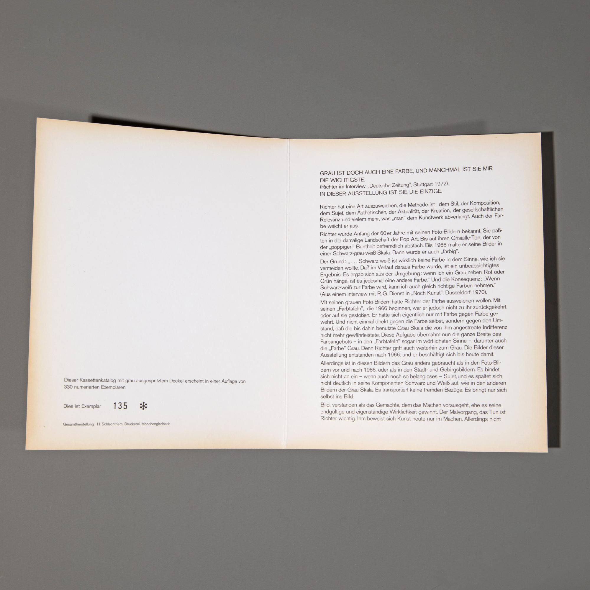 Zu der Ausstellung Gerhard Richter, Graue Bilder, Städtisches Museum Mönchengladbach, 04. Dez 1974 - 12. Jan. 1975. 29,5 x 16 cm. Auf der Kassette signiert und datiert: G. Richter 4.12.(19)74 (schwarzer Fineliner), auf der Innenseite des Doppelblatts nummeriert: 135 (gestempelt); mit 12 Seiten als Leporello gefaltet. Exemplar 135 von 330 Exemplaren.