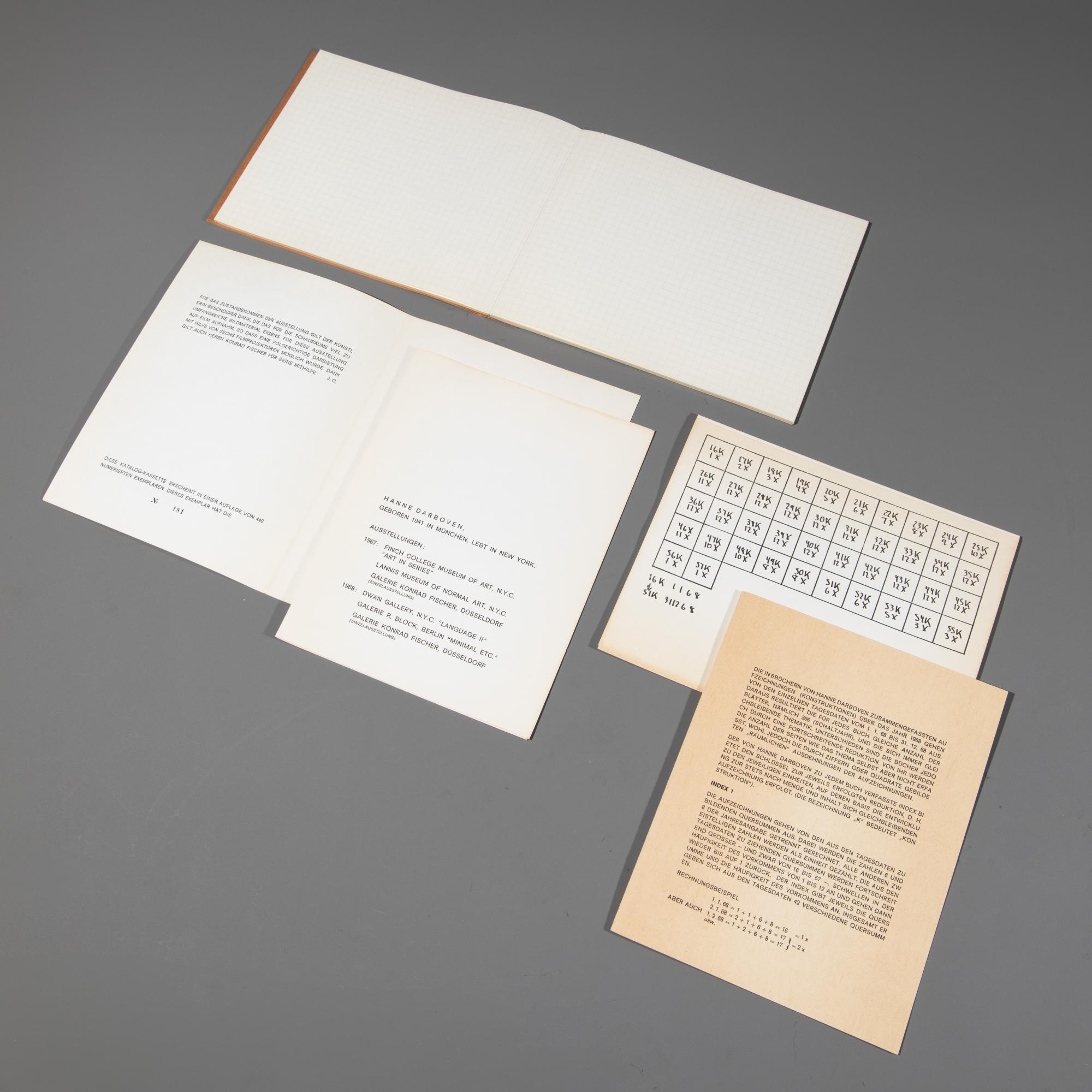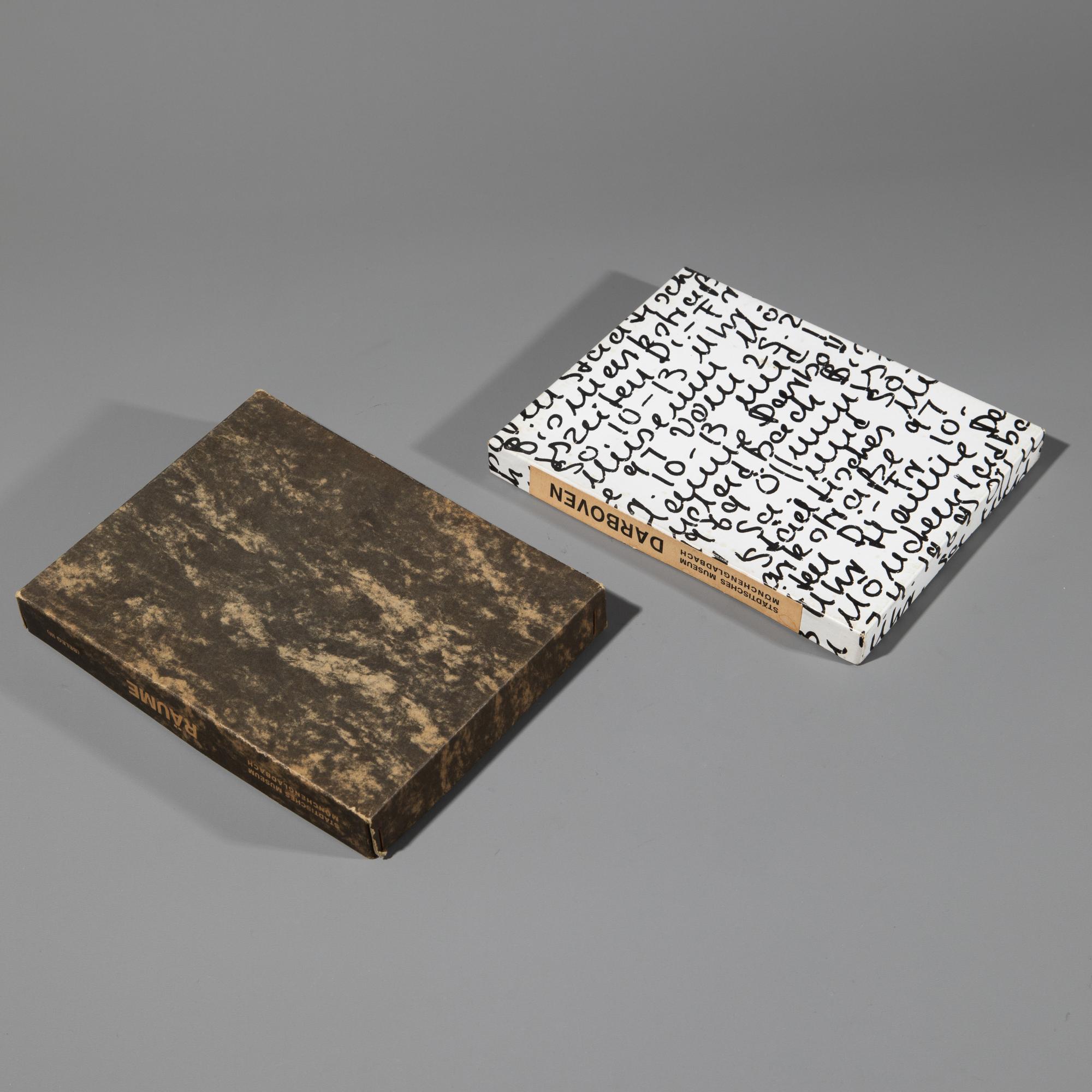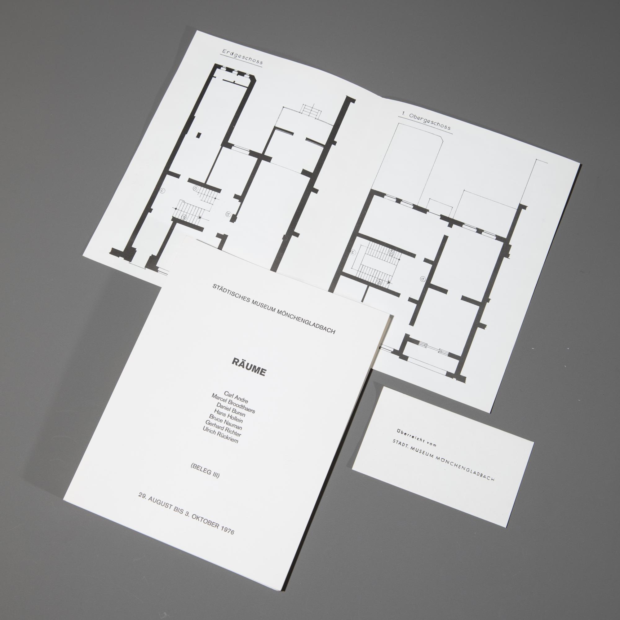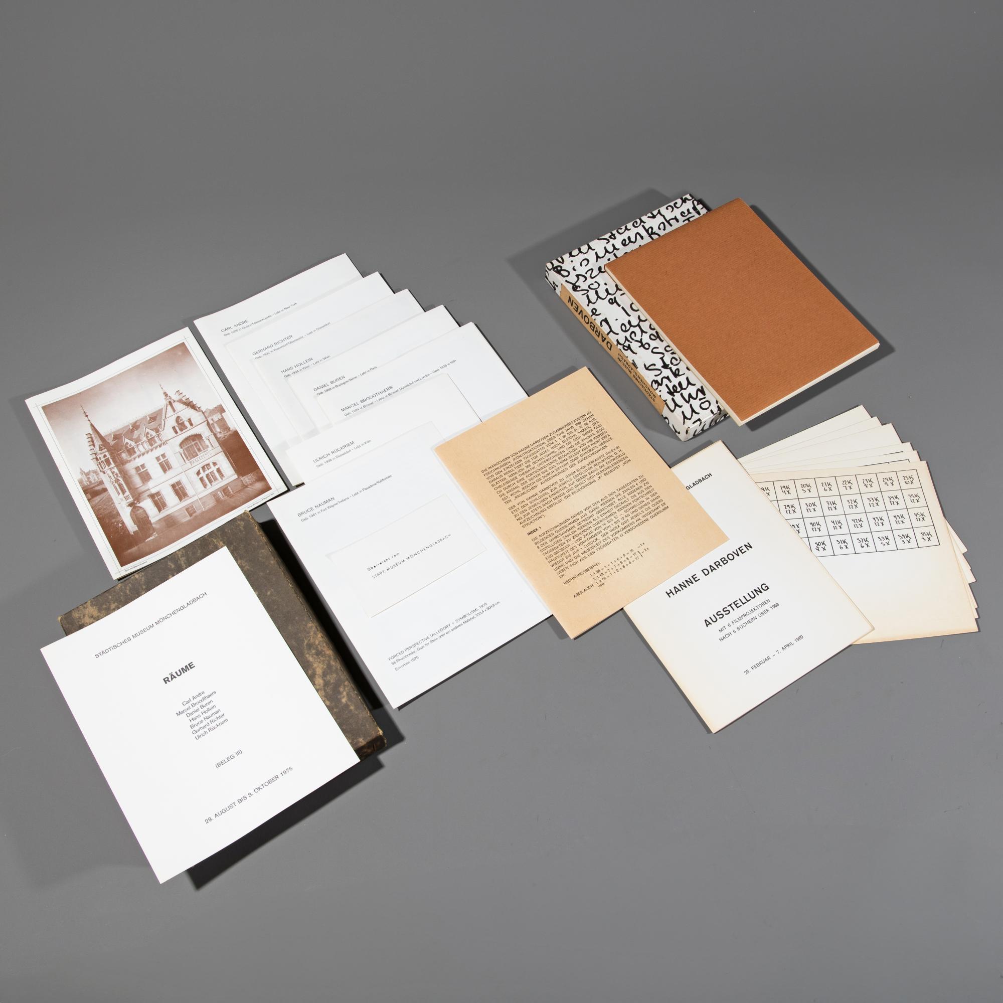 Zu den Ausstellungen: Hanne Darboven. Ausstellung mit 6 Filmprojektoren nach 6 Büchern über 1968, Städtisches Museum Mönchengladbach, 25. Feb. - 7. April 1969 sowie Räume (Beleg III). Carl Andre, Marcel Broodthaers, Daniel Buren, Hans Hollein, Bruce Nauman, Gerhard Richter, Ulrich Rückriem, Städtisches Museum Mönchengladbach, 29. Aug. - 03. Okt. 1979. Je 20,5 x 16,5 cm. Ersteres Exemplar 181/440.