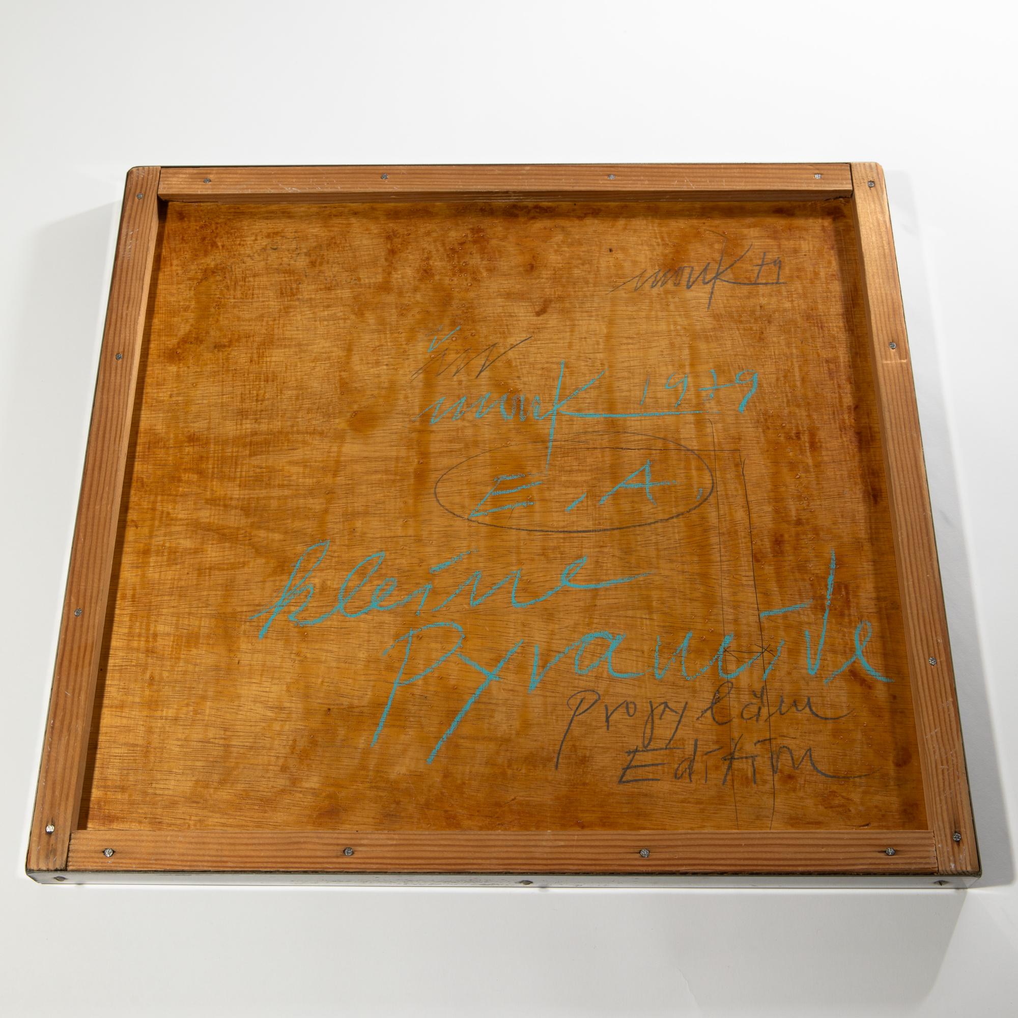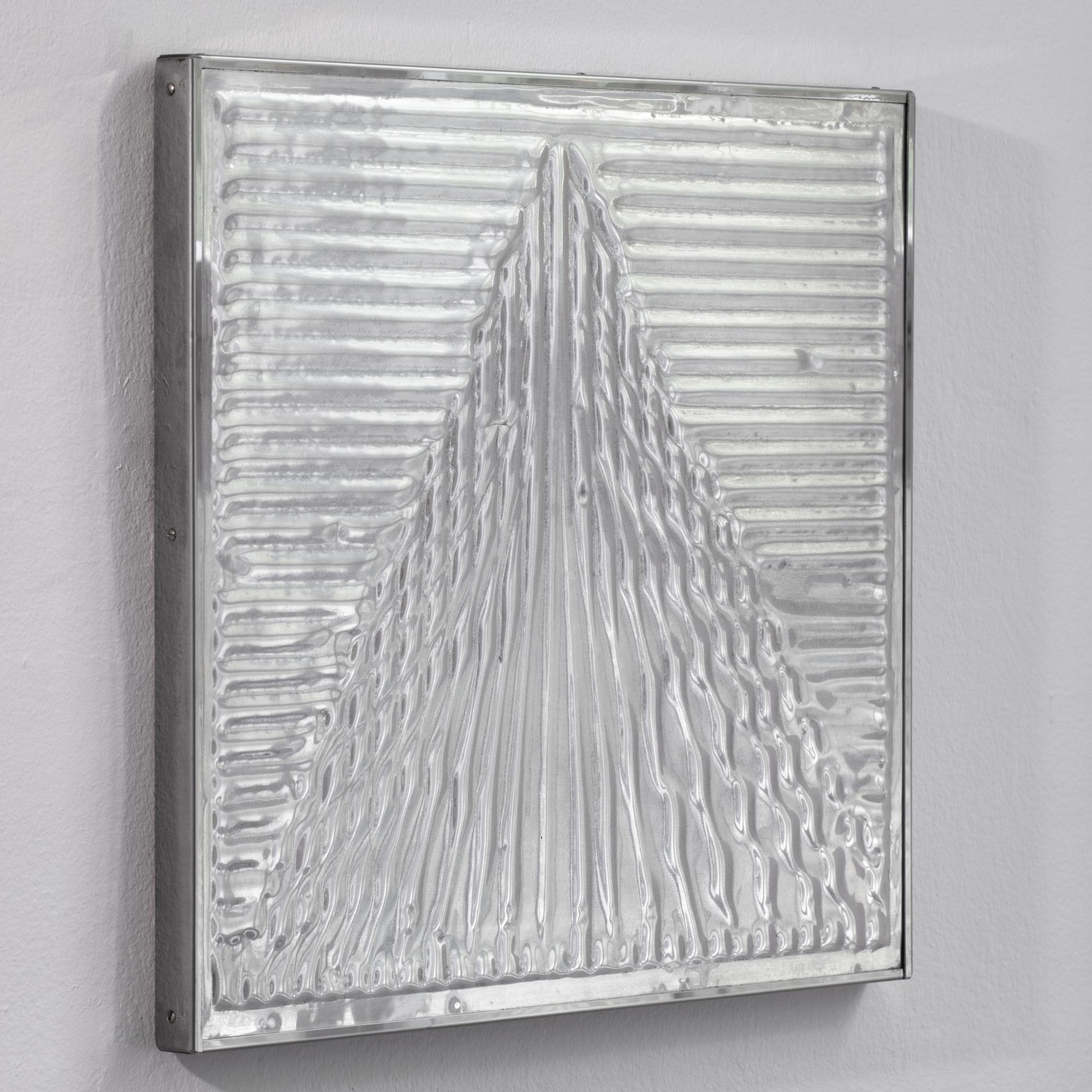 Blindprägung auf Aluminium, auf Holzpaneel und Aluminiumrahmen. 40,2 x 43 cm. Verso doppelt signiert und datiert: mack 1979 sowie betitelt und bezeichnet: kleine Pyramide / E.A. (für Epreuve d'Artiste) / Propyläen Edition (Bleistift/blauer Kreidestift). EA-Exemplar neben einer unbekannt hohen Edition, hrsg. vom Propyläen Verlag, Berlin, Wien. In einem Künstlerrahmen aus Aluminium gerahmt.