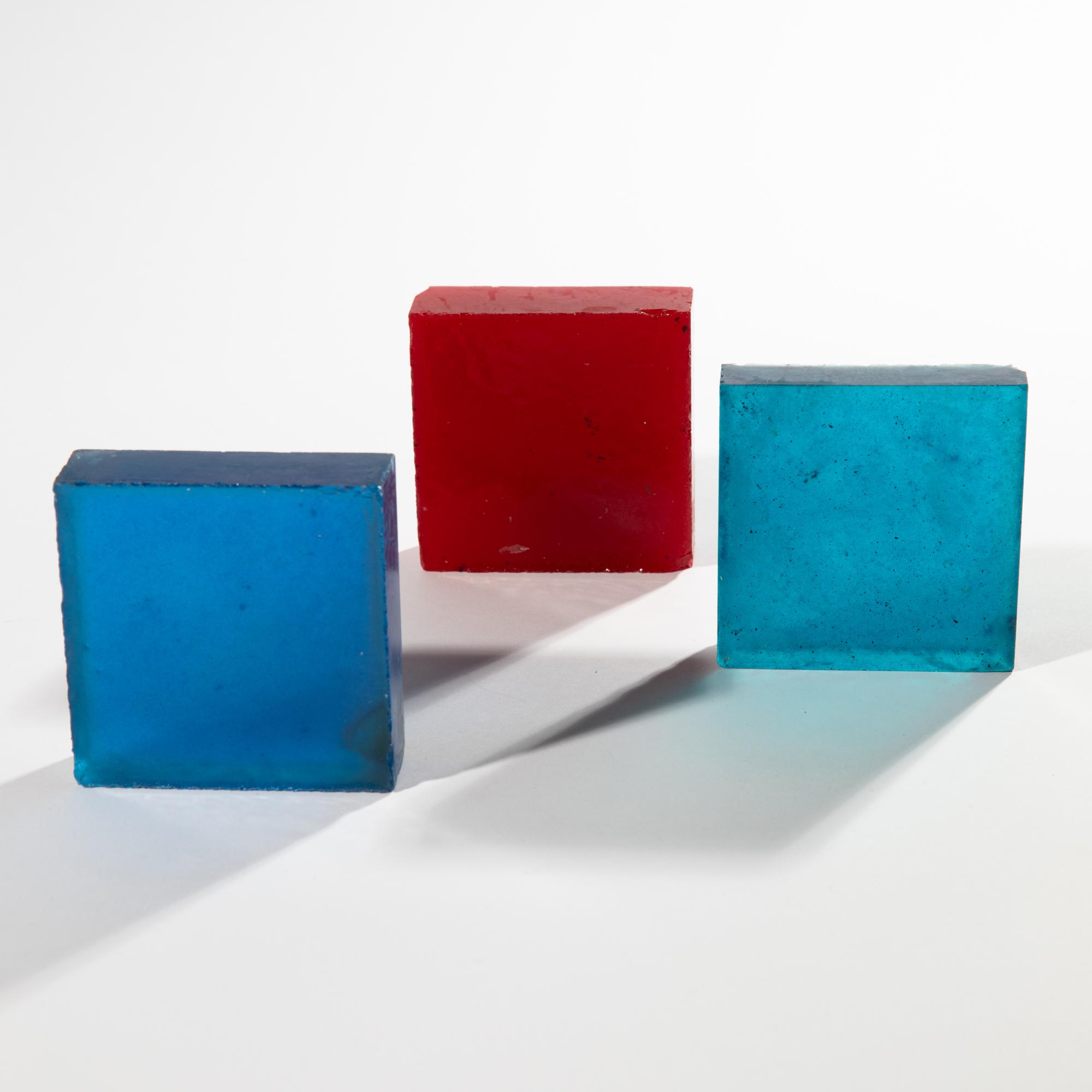 Mischtechnik (Harz & Pigmente). 2 Objekte je 2,4 x 8 x 7,7 cm und ein Objekt 1,9 x 7,7 x 7,7 cm. Roter Würfel Etikett bezeichnet: Hostaperm - PV 19 rot Kr 23720.