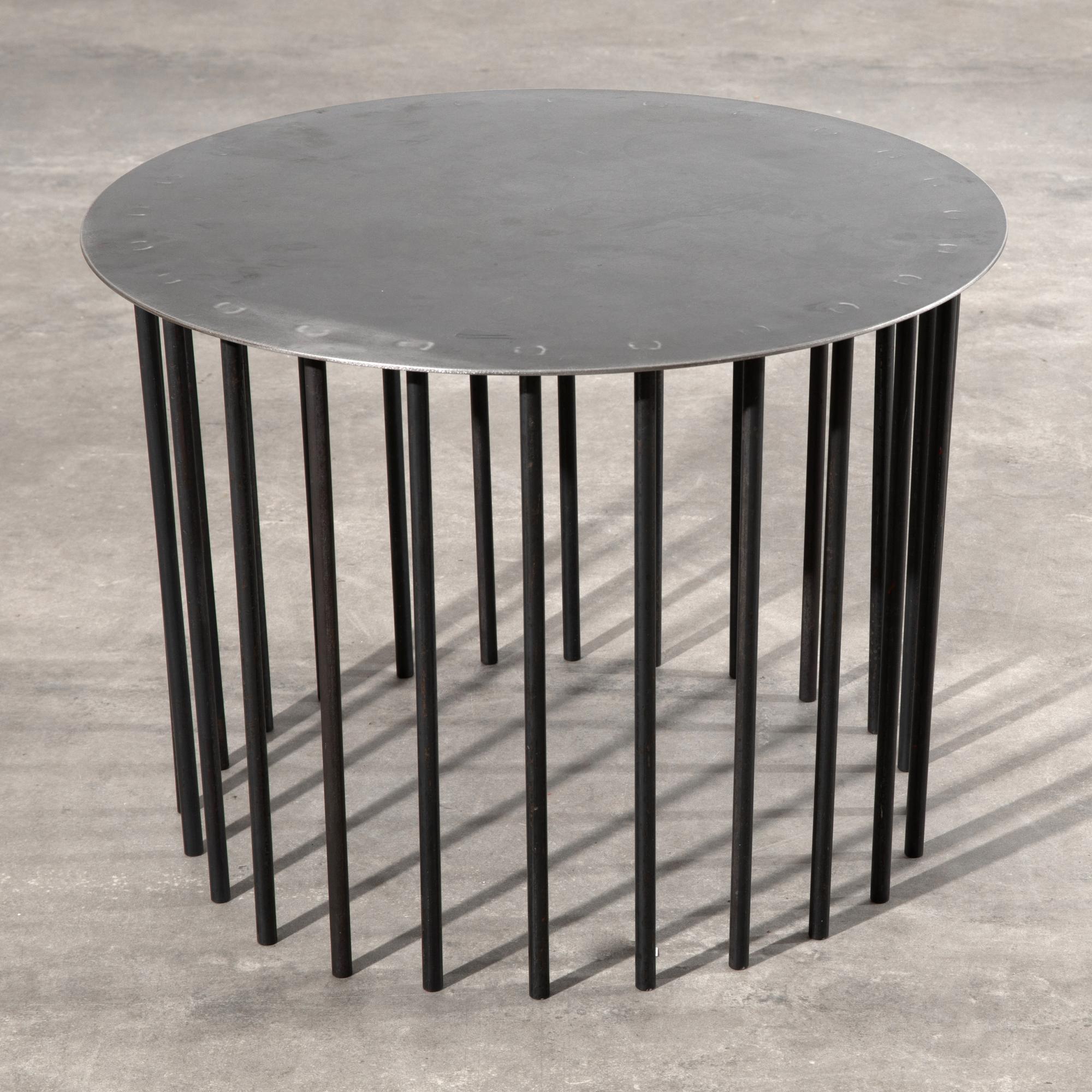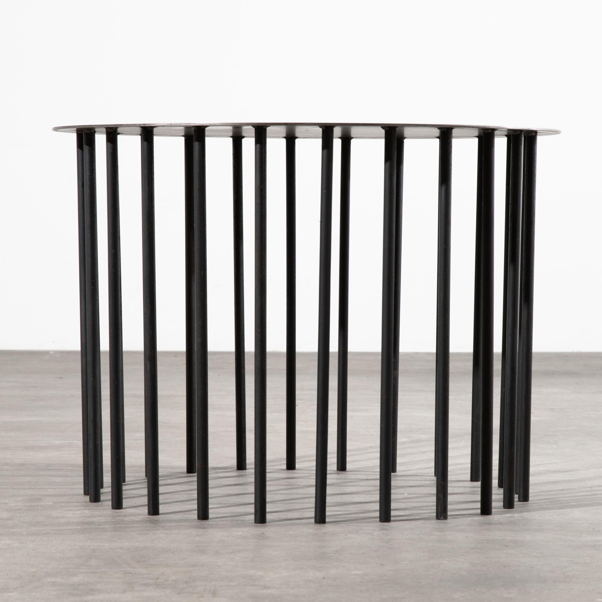 Entwurf 1980/90er Jahre. Ausführung Becker Stahlmöbel. Stahlblech, Rundstahl. H. 51 cm, D. 70 cm. Mit Prägung und Aufkleber bezeichnet. Unikat in differenter Höhe als Sonderanfertigung.