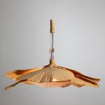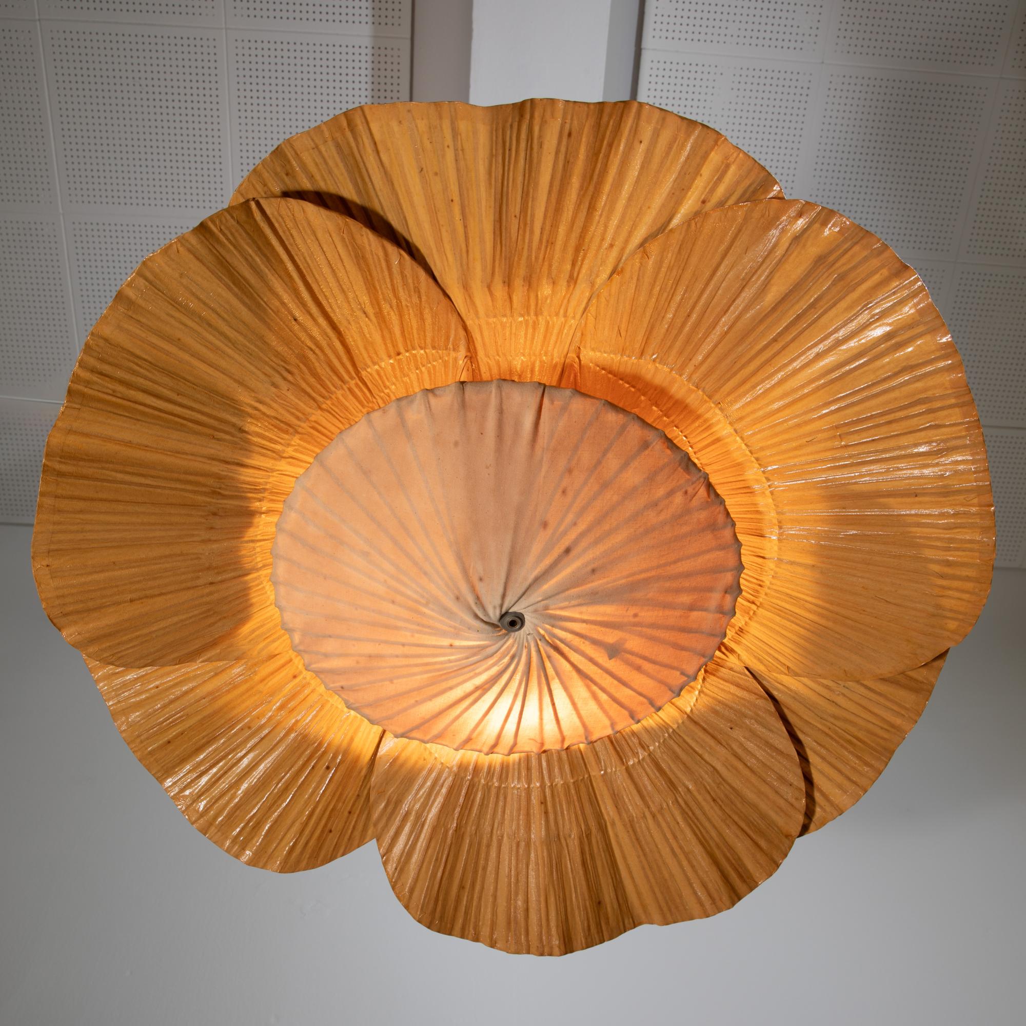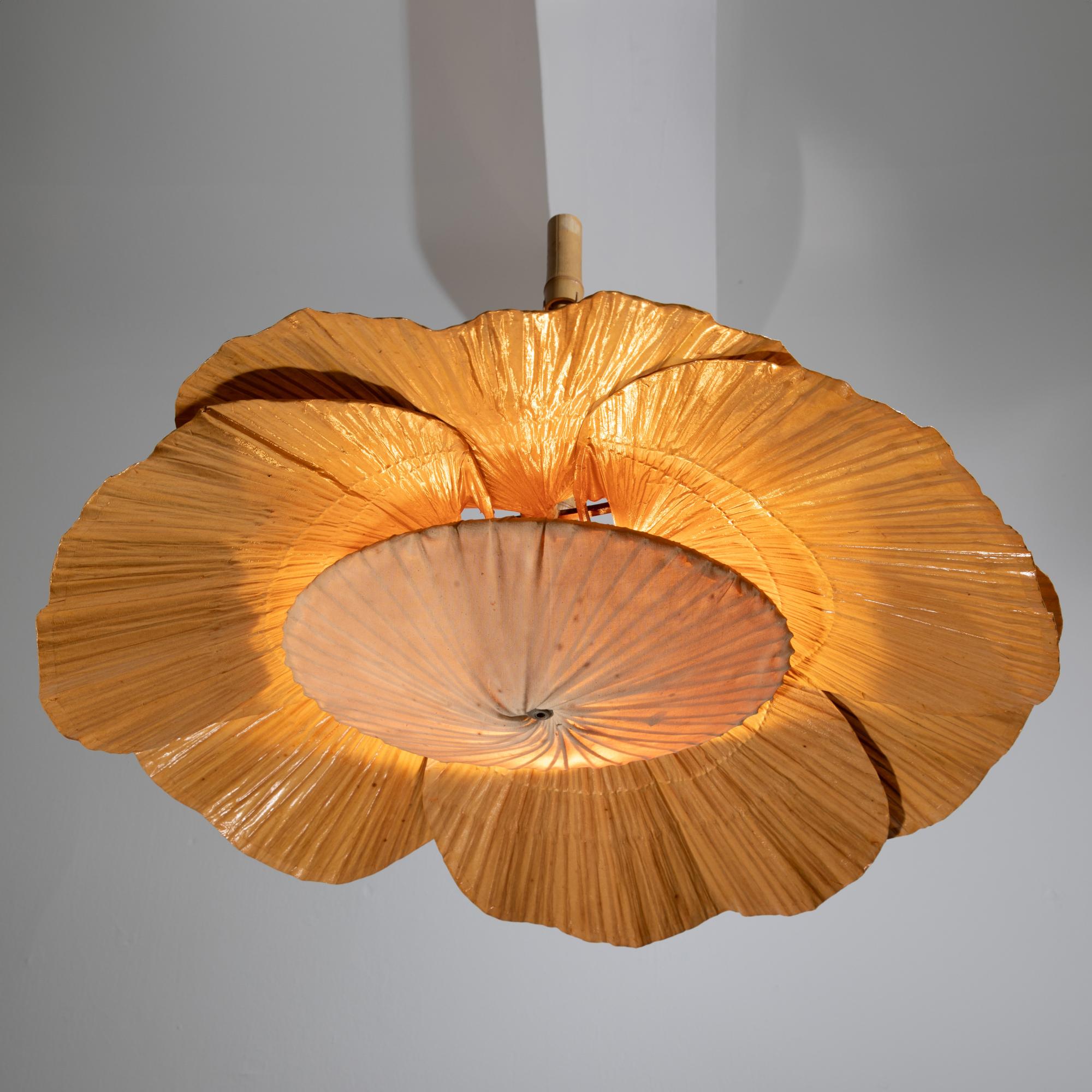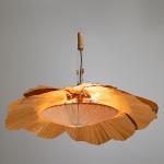Entwurf 1974. Ausführung Design M. 6 Fächer aus Bambus und Reispapier, Stoff, Bambus, Kordel. Maße des Leuchtkörpers: ca. H. 25 cm, D. 80 cm. Maße der Aufhängung: ca. 40 cm.